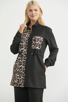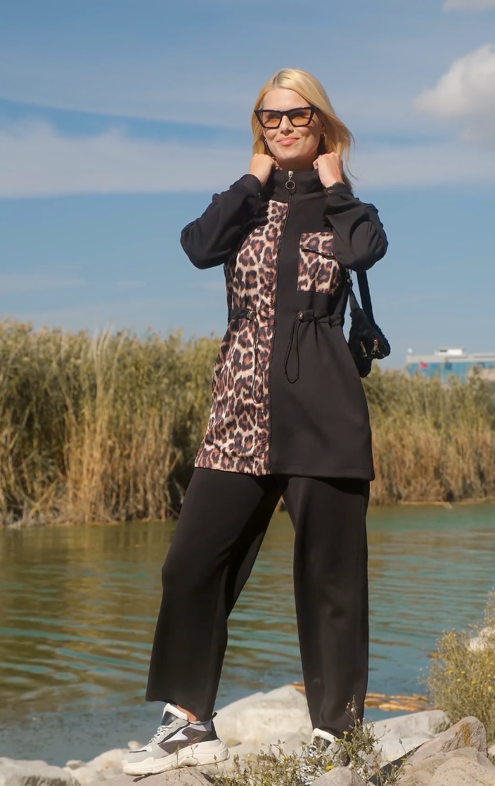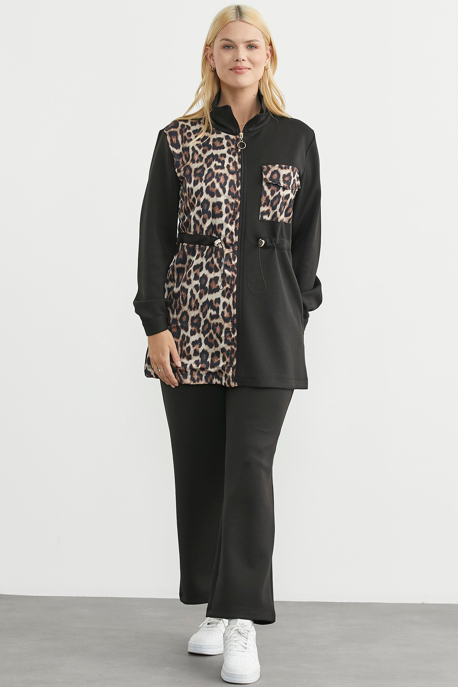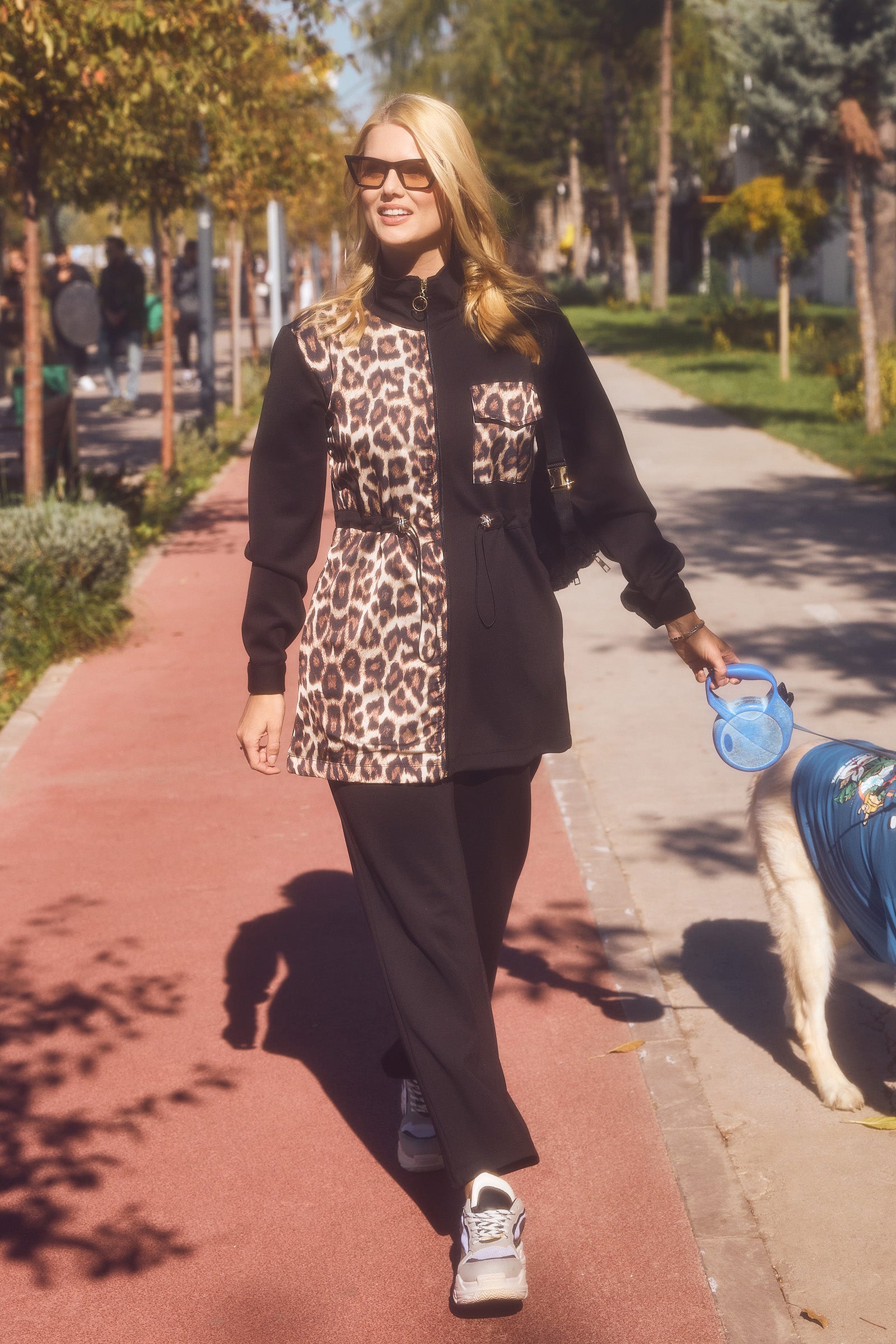 Dik yaka ,belden büzgülü, leopar kombinli tunik üst, standart fit alt.
