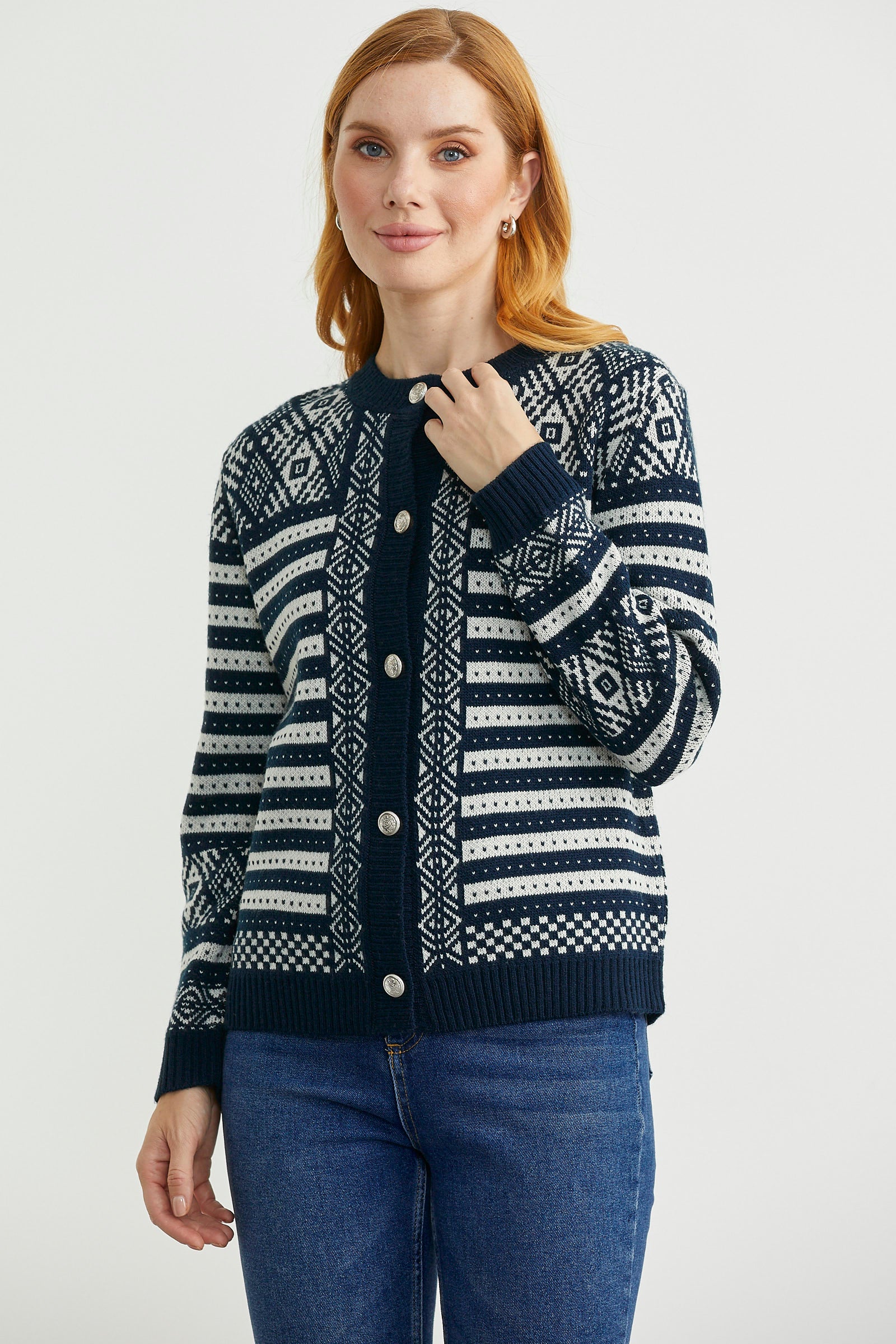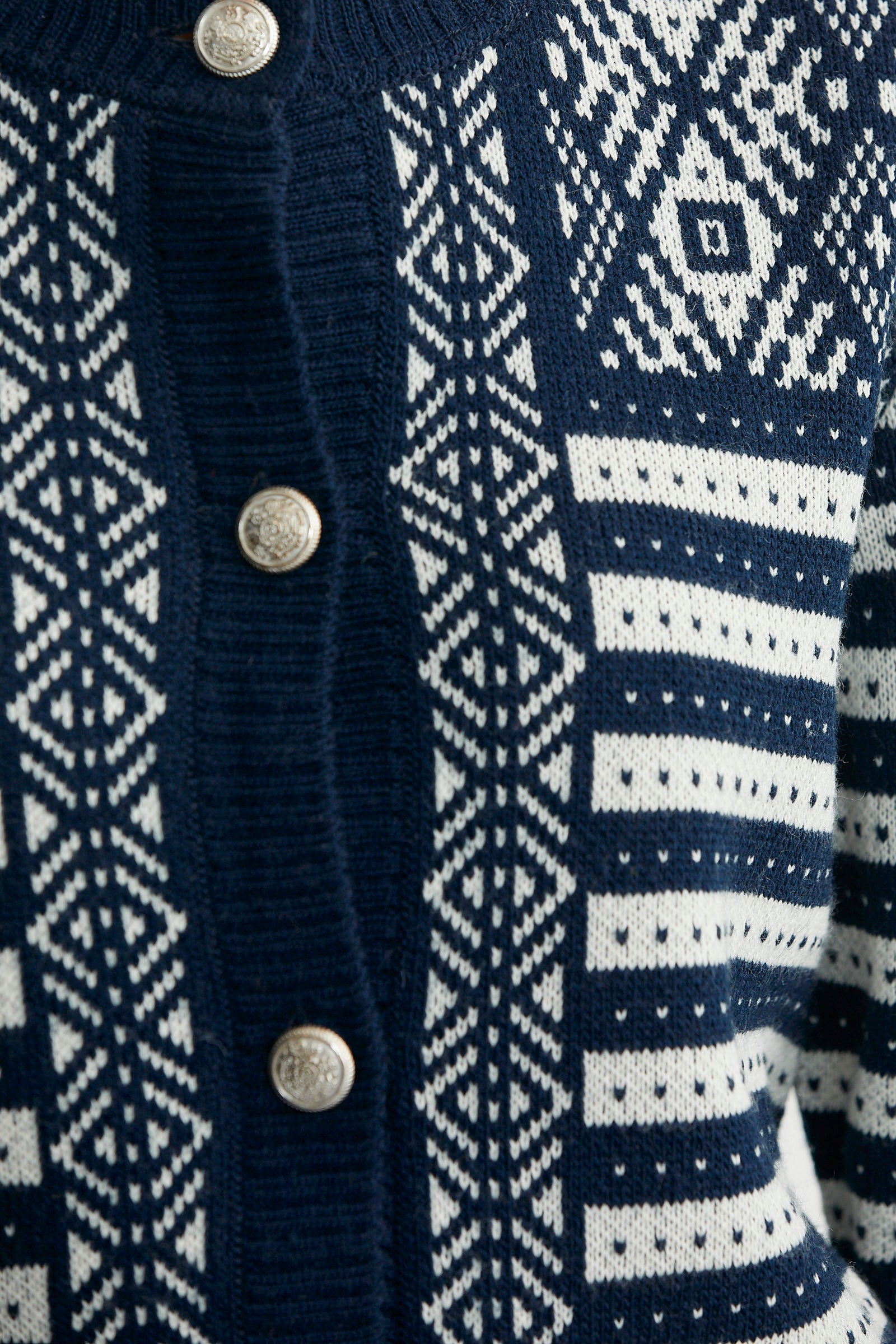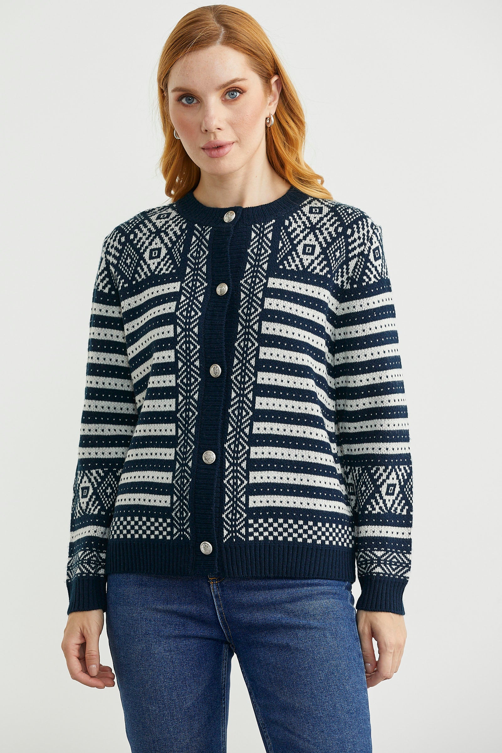 Metal Düğmeli Çizgili Yünlü Triko Hırka - Lacivert