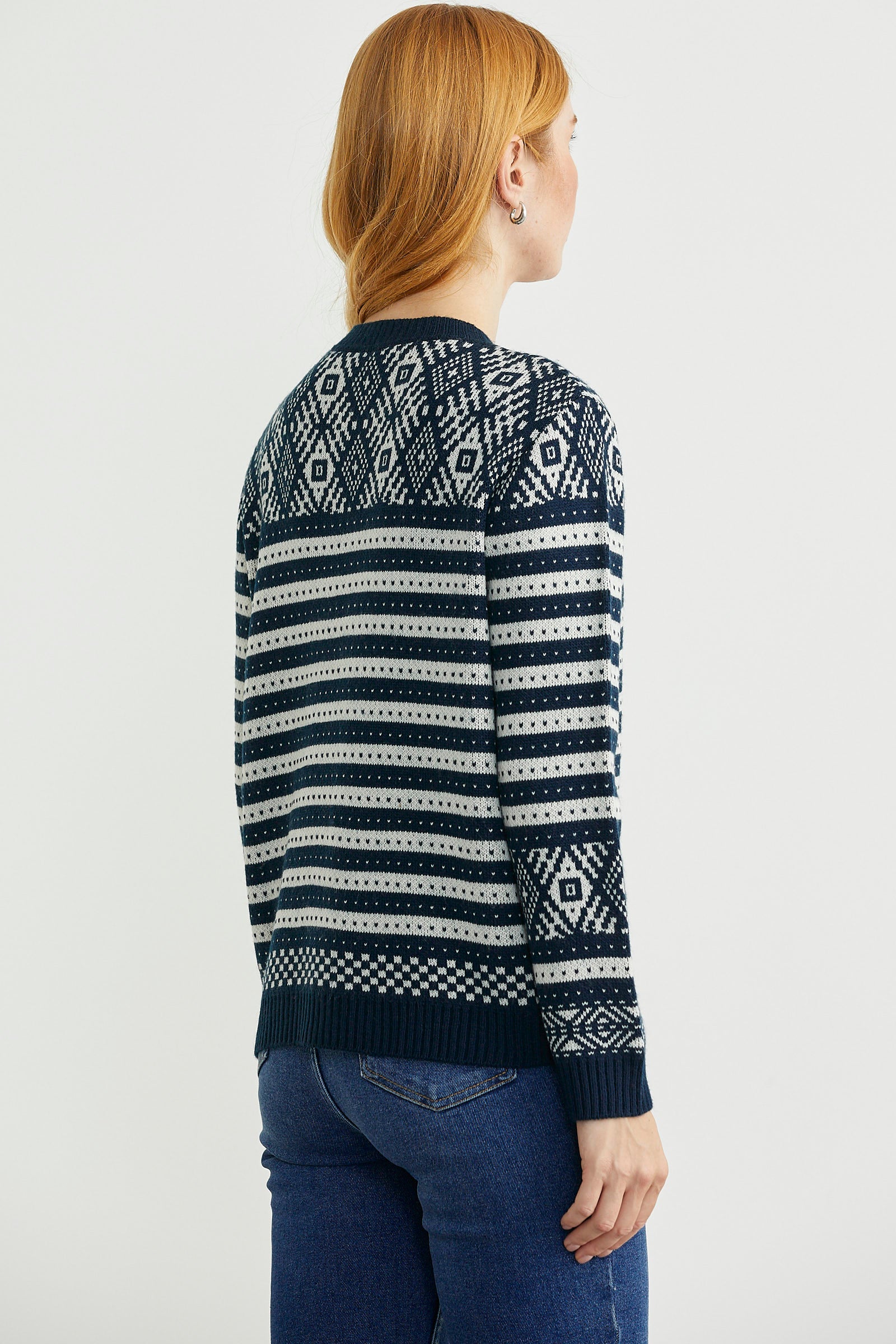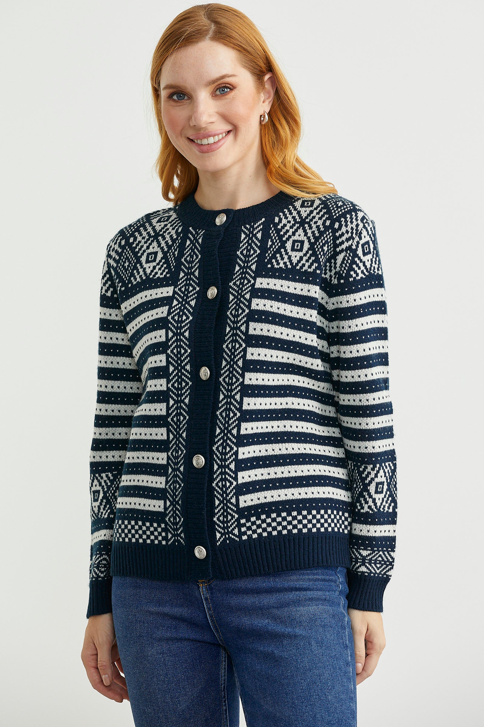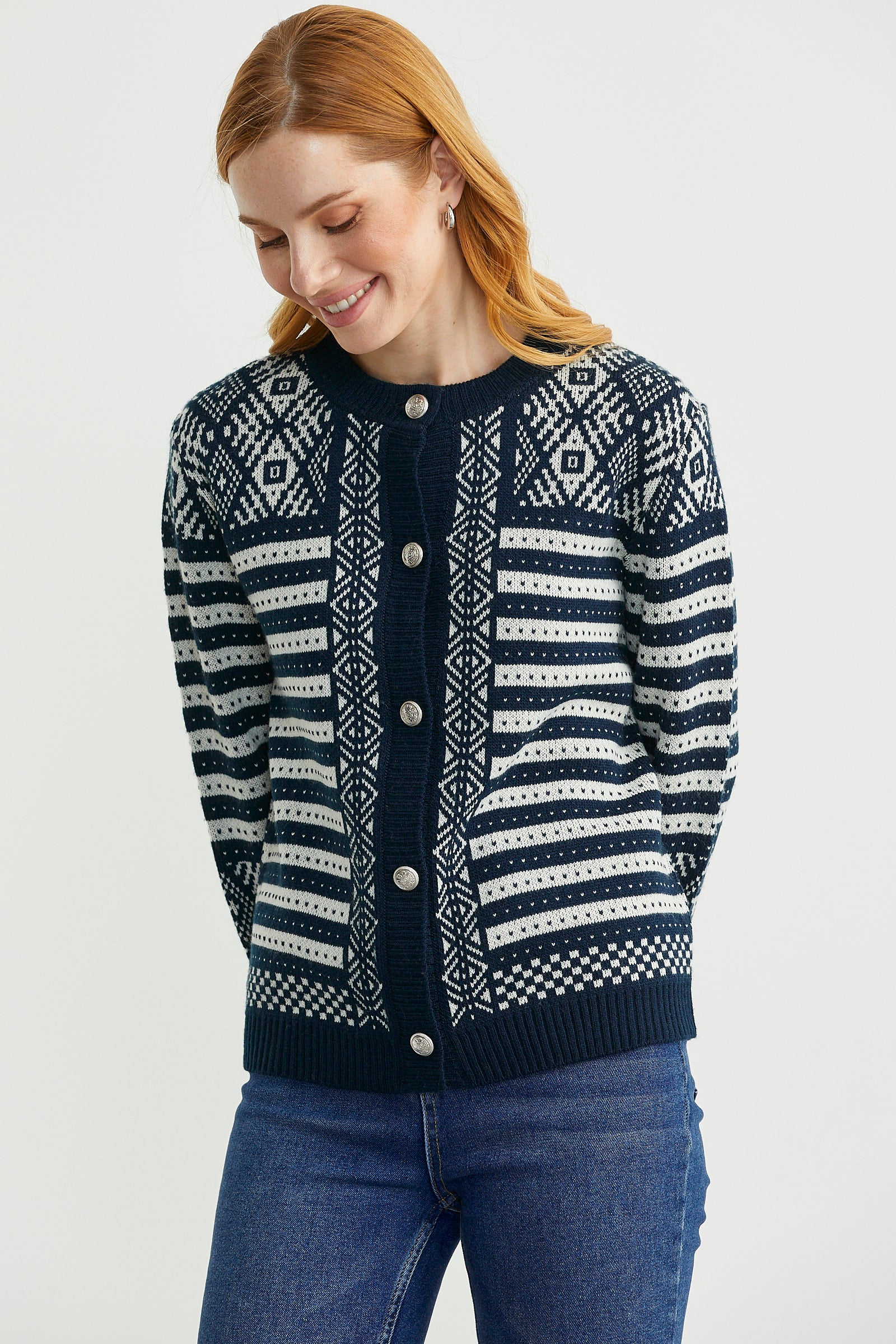 Metal Düğmeli Çizgili Yünlü Triko Hırka - Lacivert