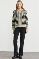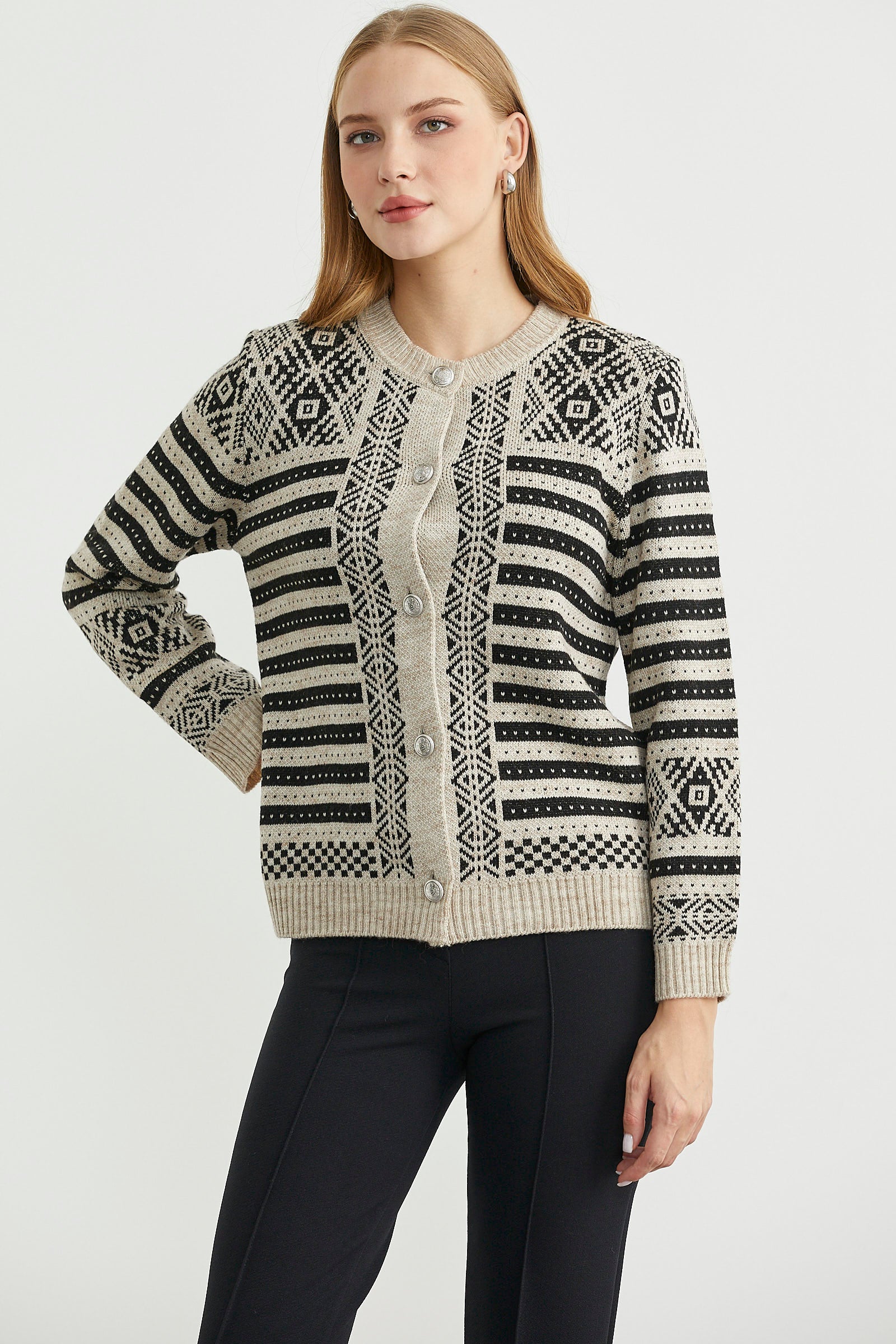 Metal Düğmeli Çizgili Yünlü Triko Hırka - Vizon