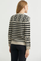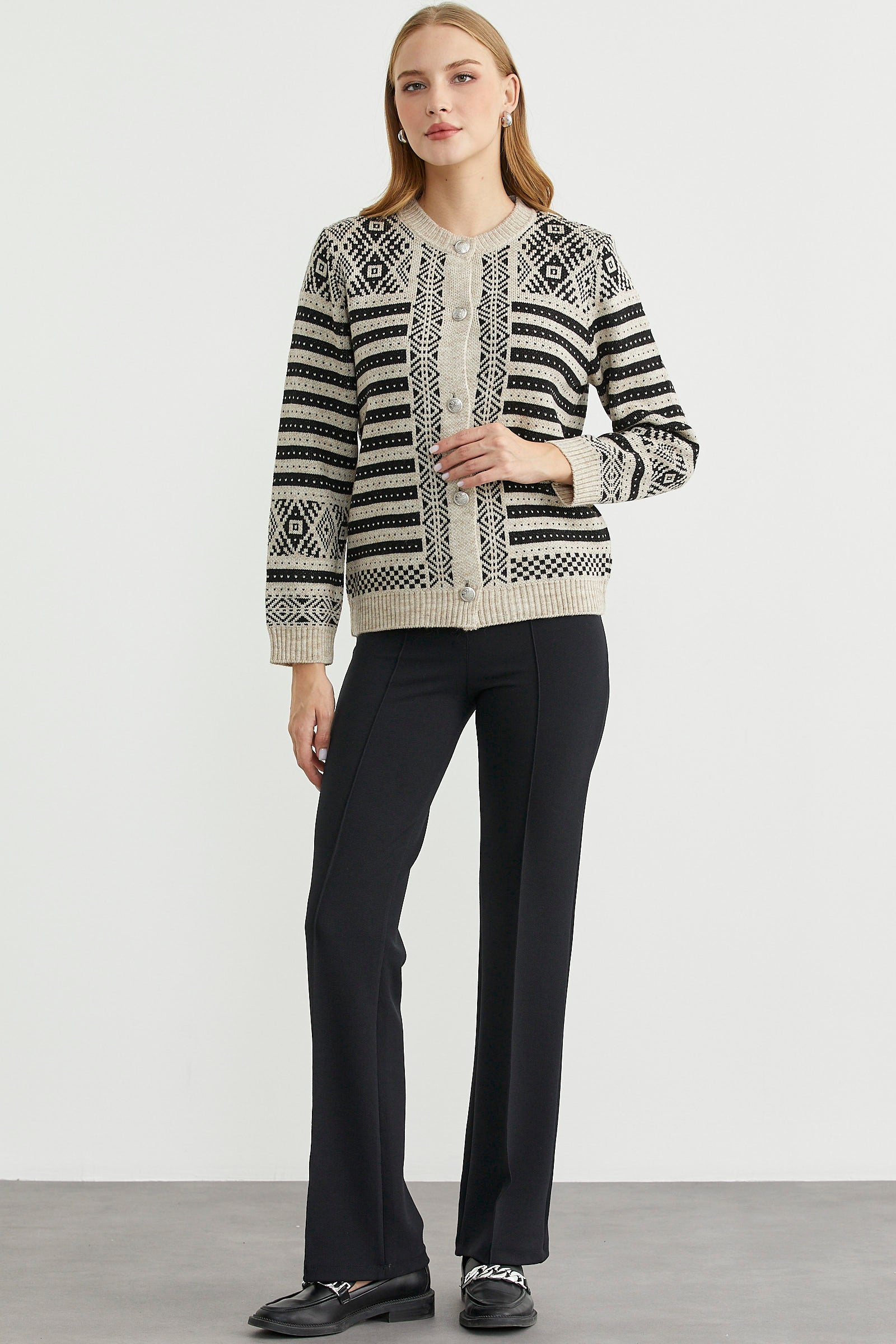 Yuvarlak yakalı, önü düğmeli, uzun kollu, kalın dokulu jakarlı triko hırka. Yakası, manşetli ve etek ucu lastik örgülü.