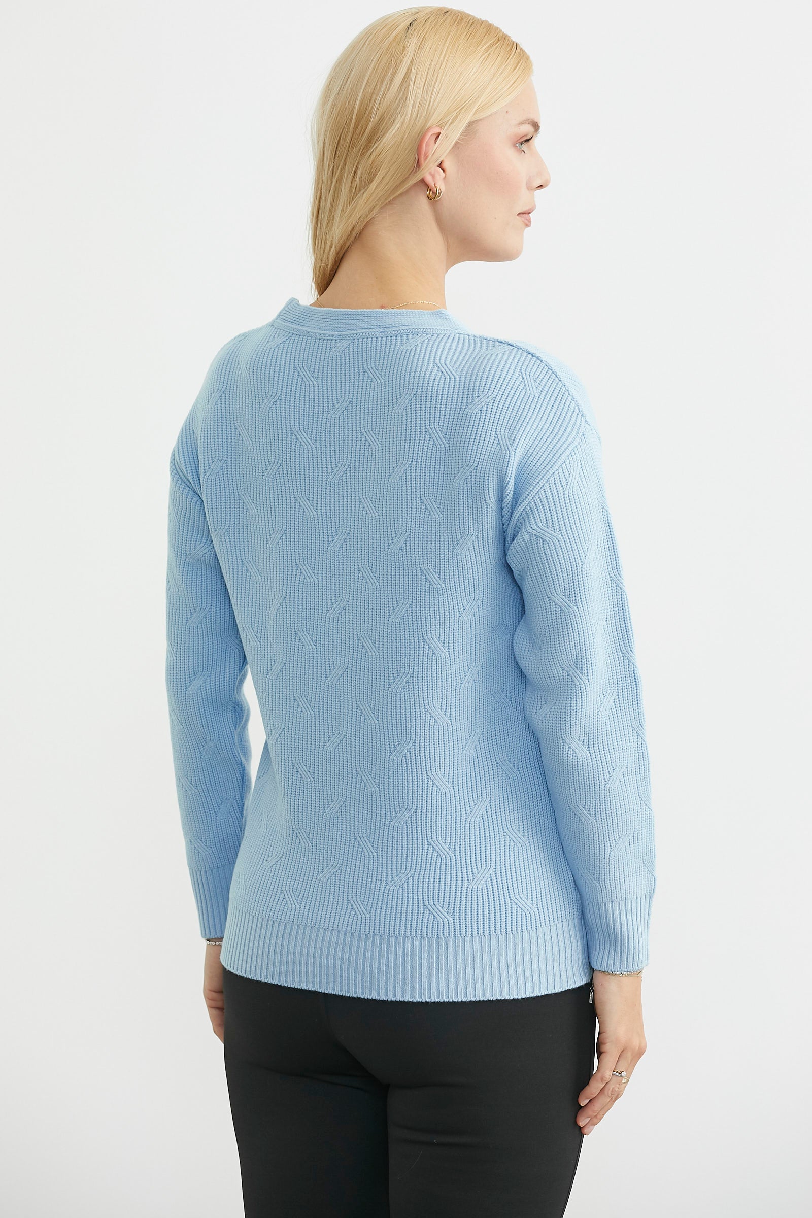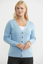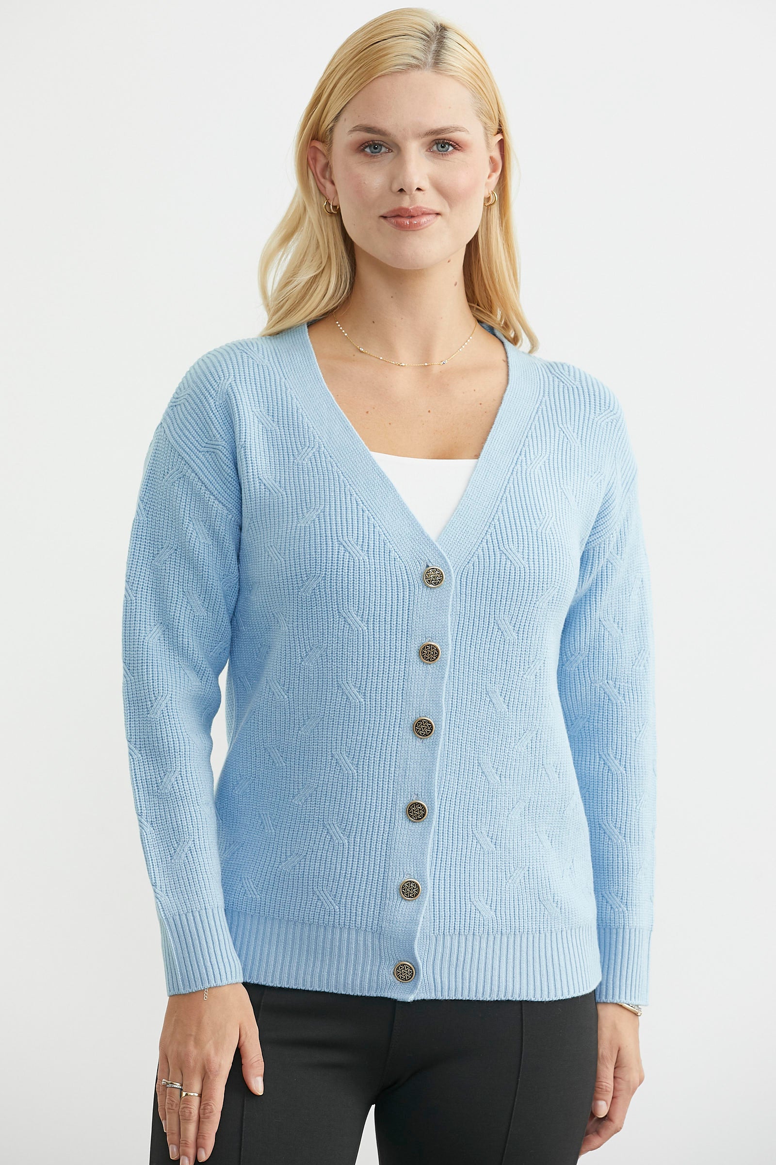 V yakalı, zarif metal düğme detaylı, düşük omuzlu triko hırka. Yakası, düğme bandı, manşetleri ve etek ucu lastik örgü.