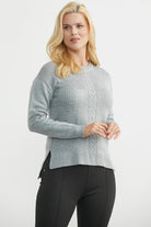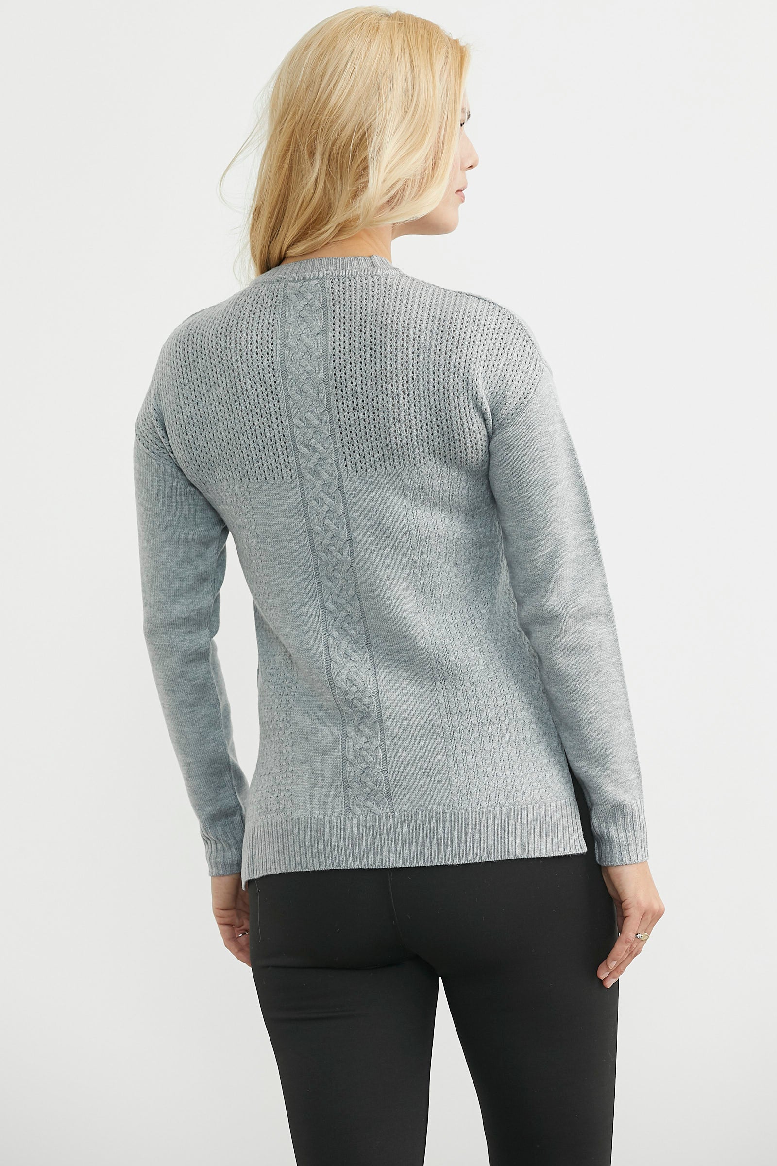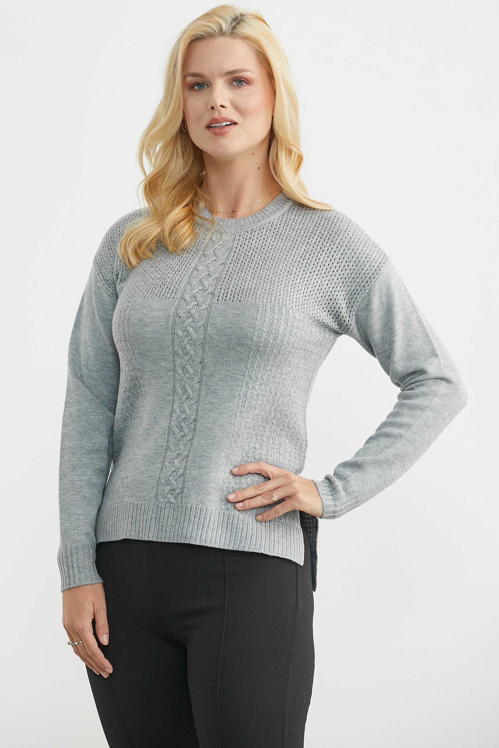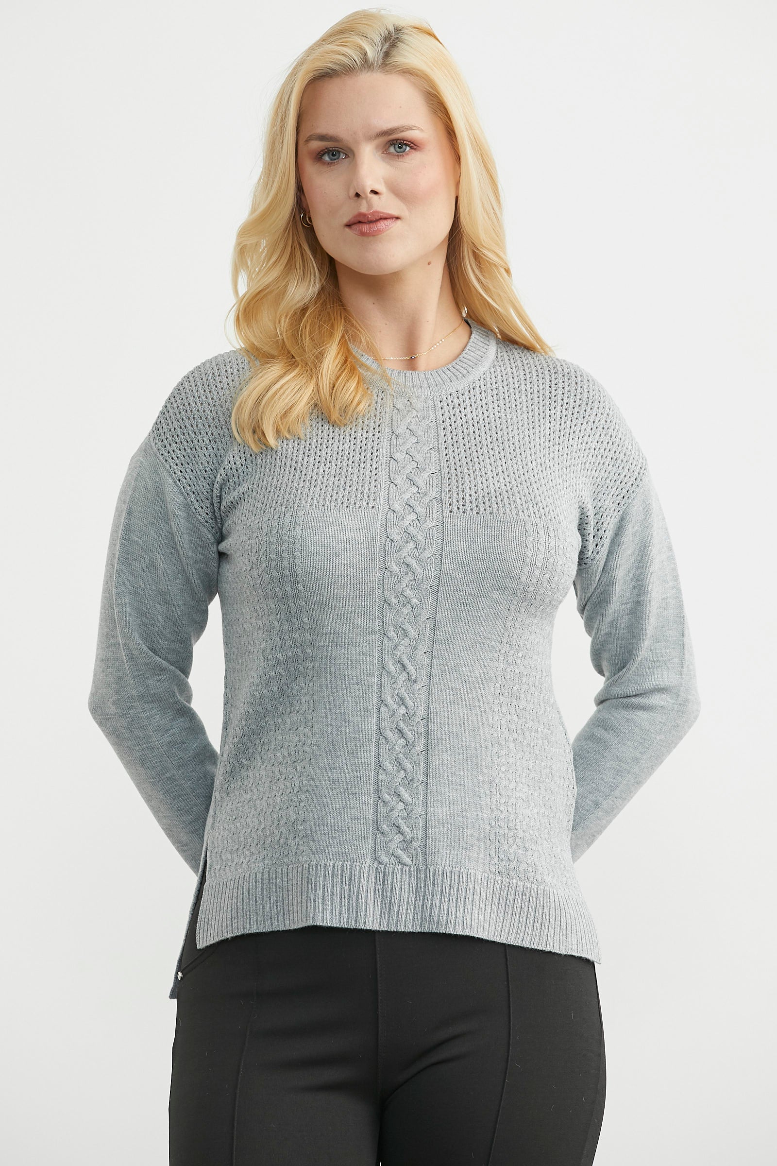 Delik motifli, yuvarlak yakalı ince triko kazak. Etek ucu düz ve yırtmaçlı.