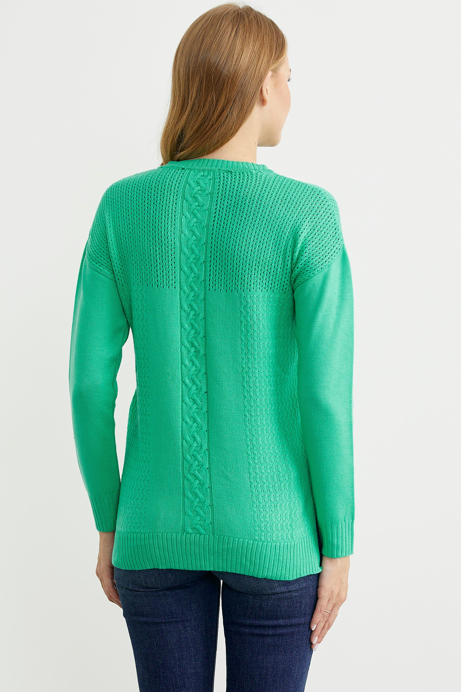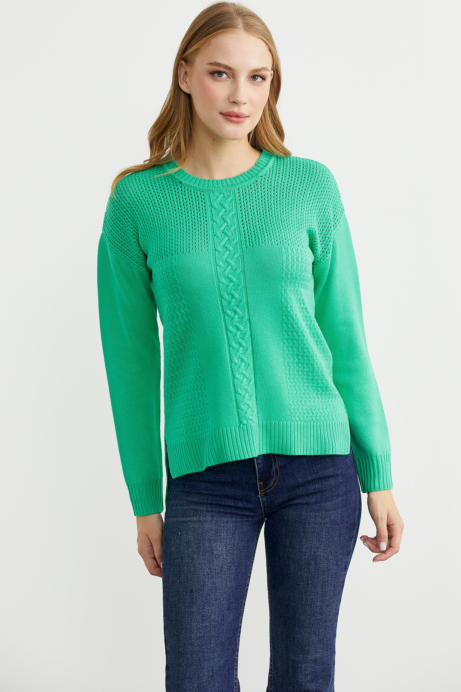 Motifli Arkası Uzun Triko Kazak - Yeşil