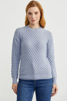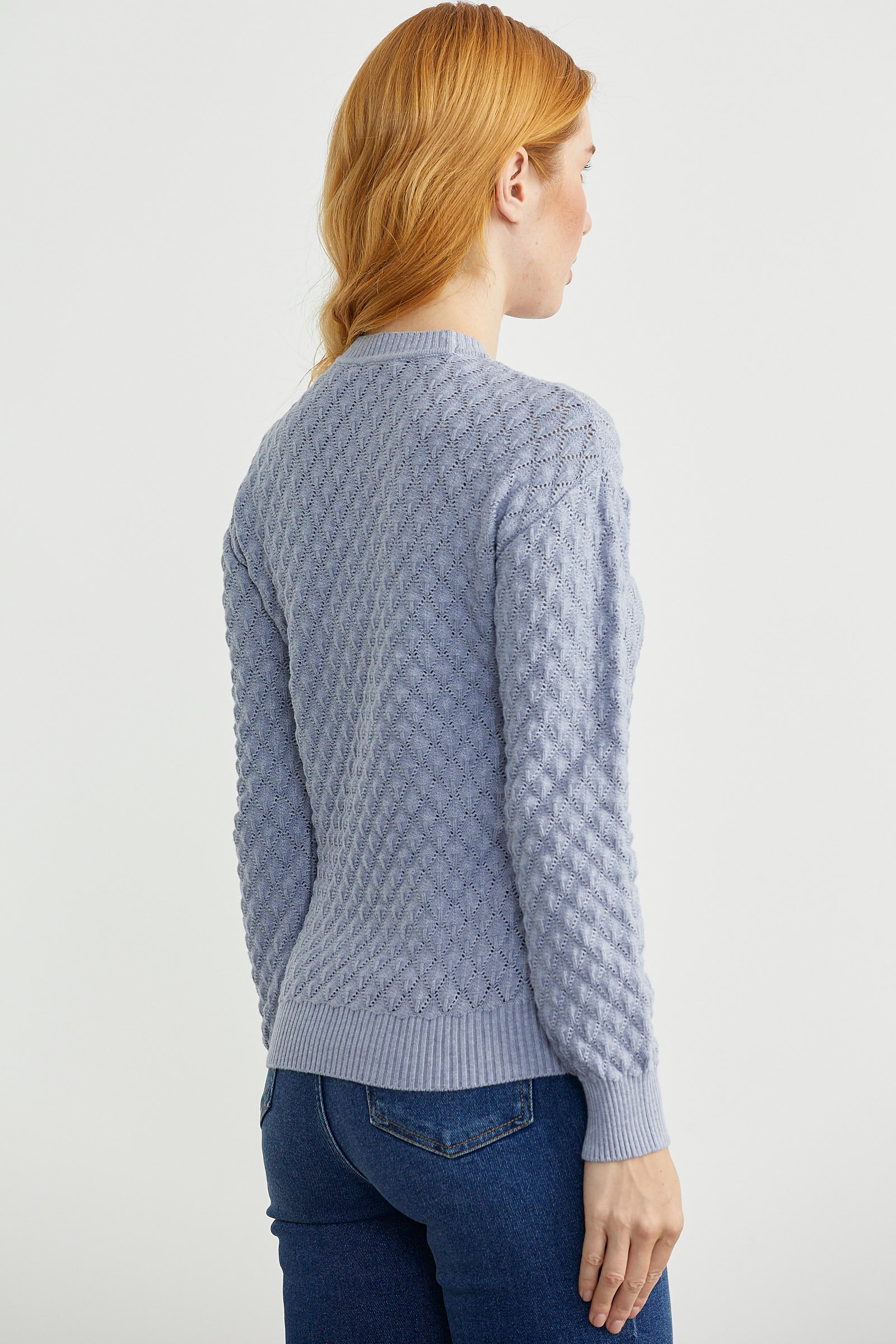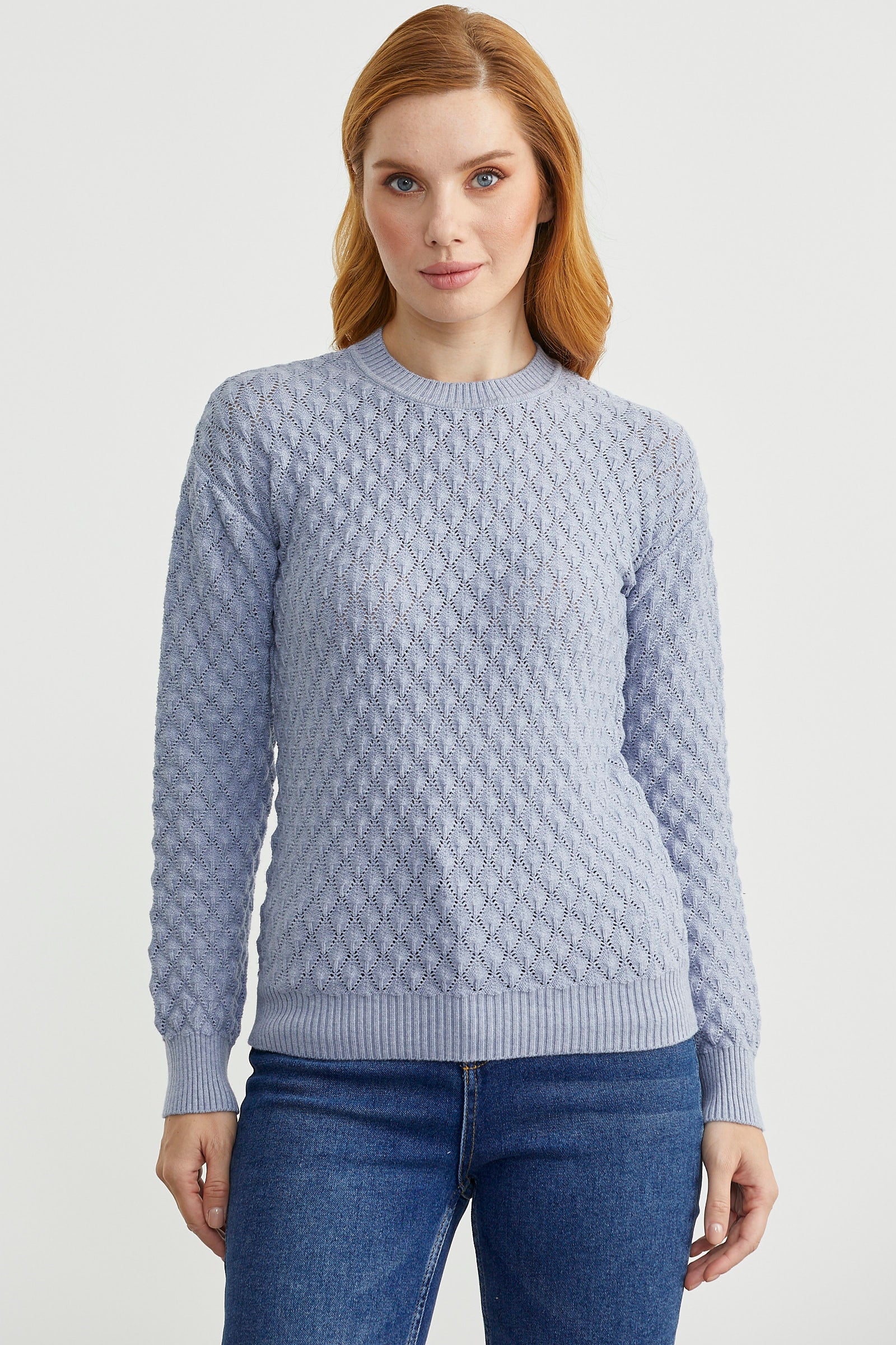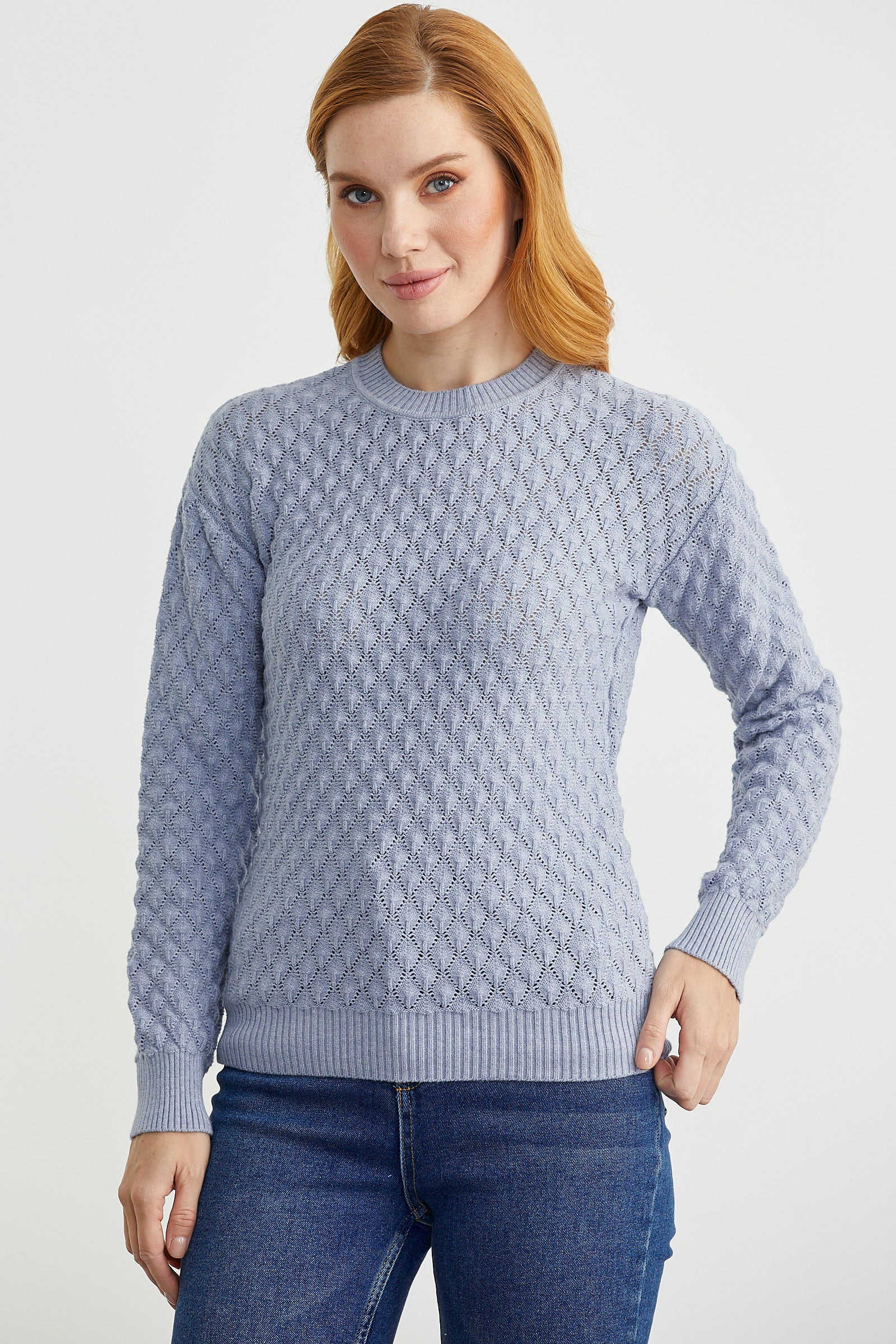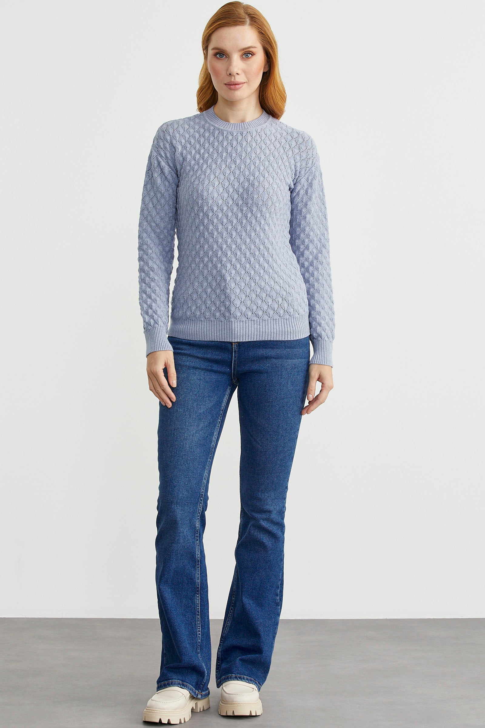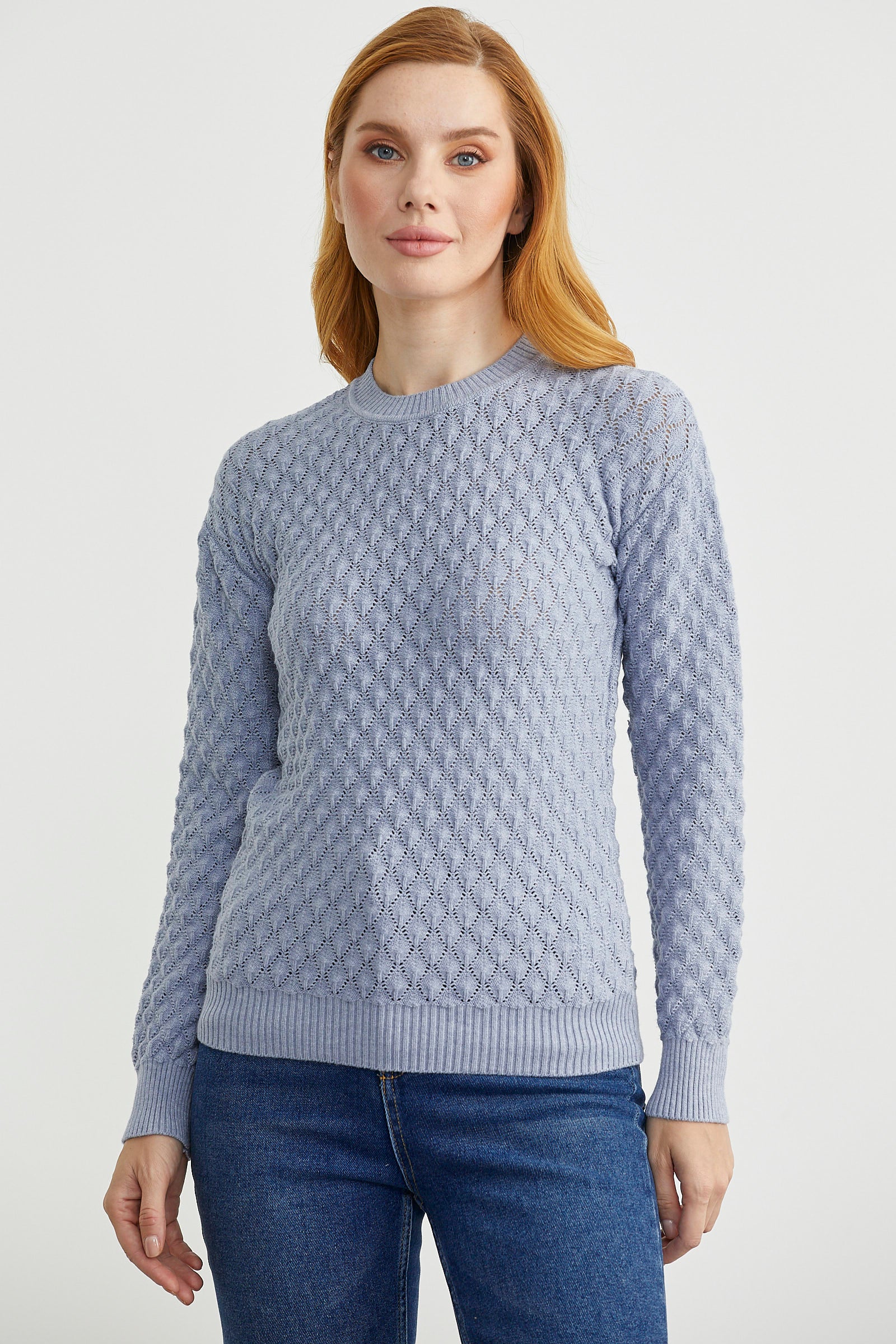 Yuvarlak yaka, delik desenli, ince triko kazak. Uzun kollu. Etek ucu düz.