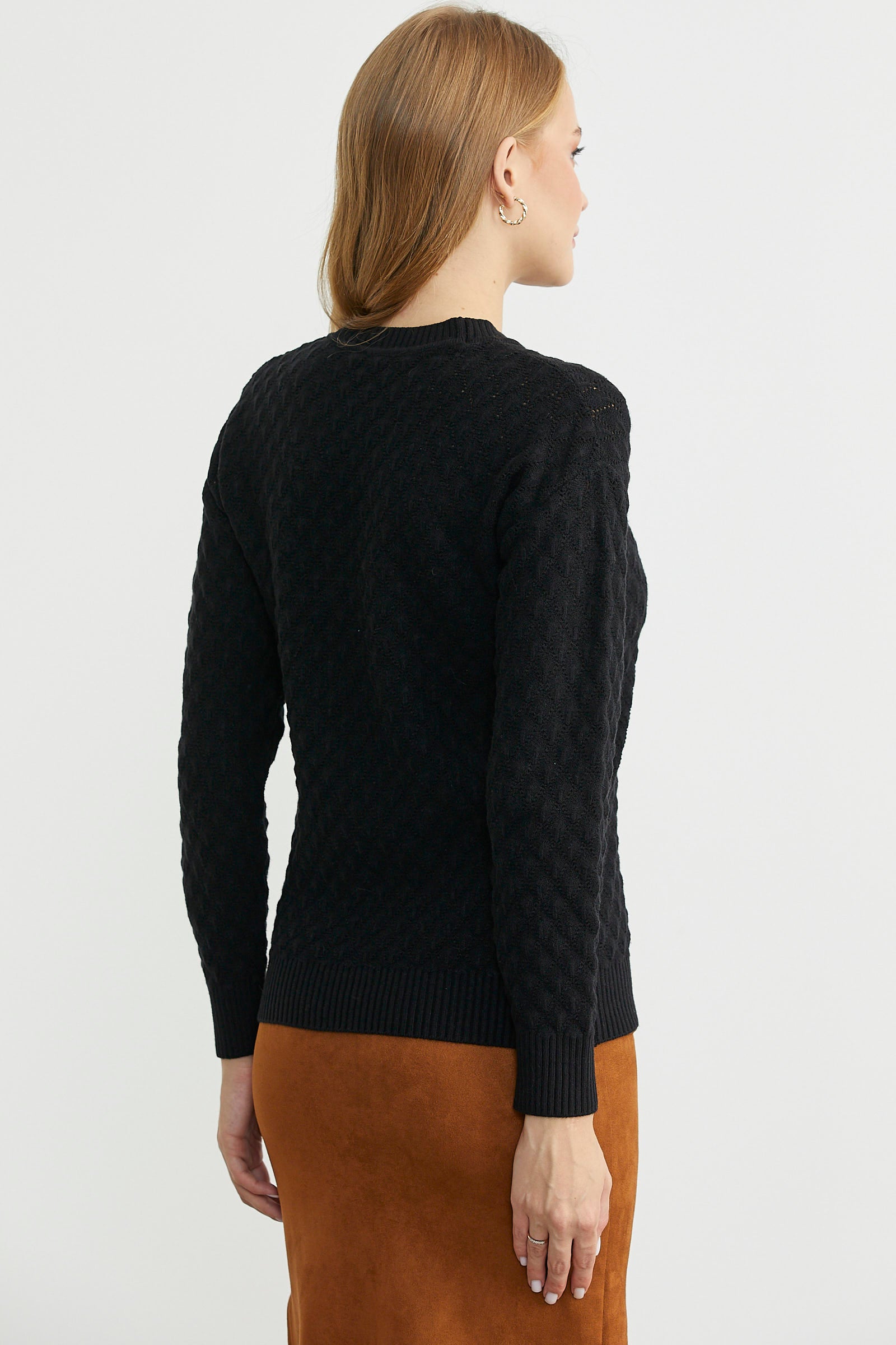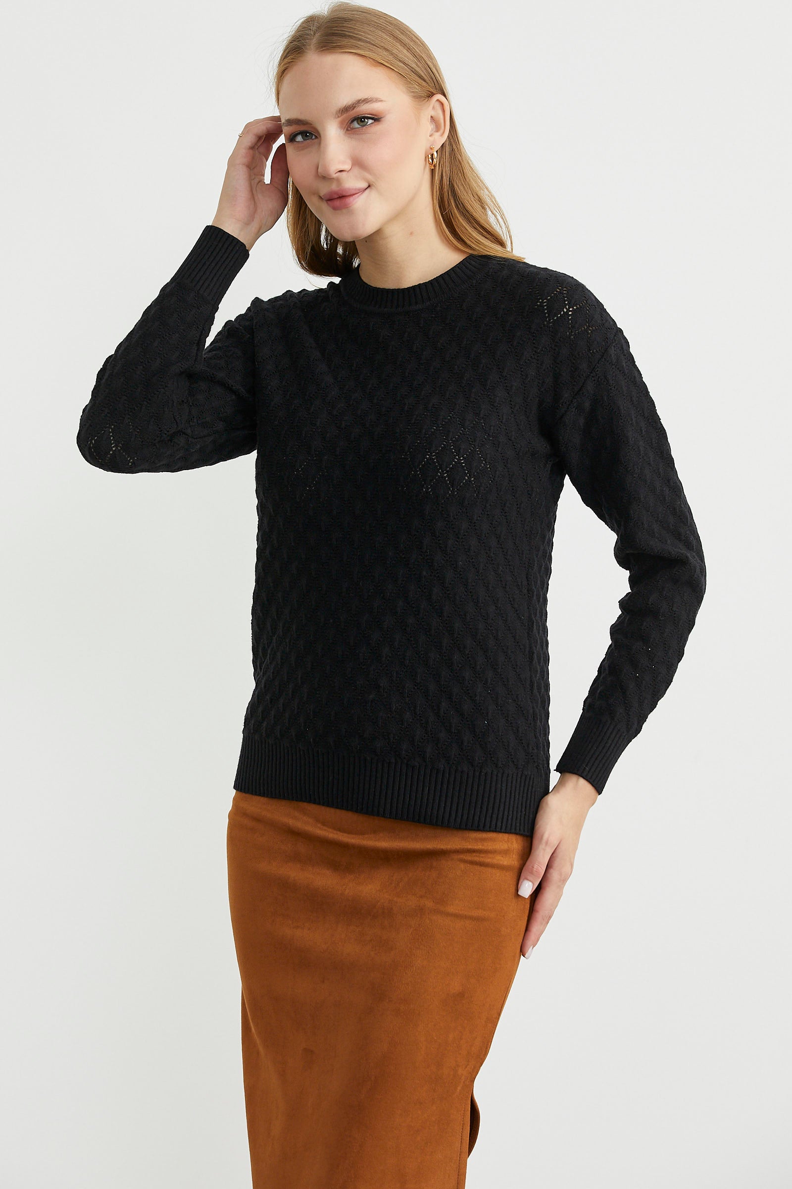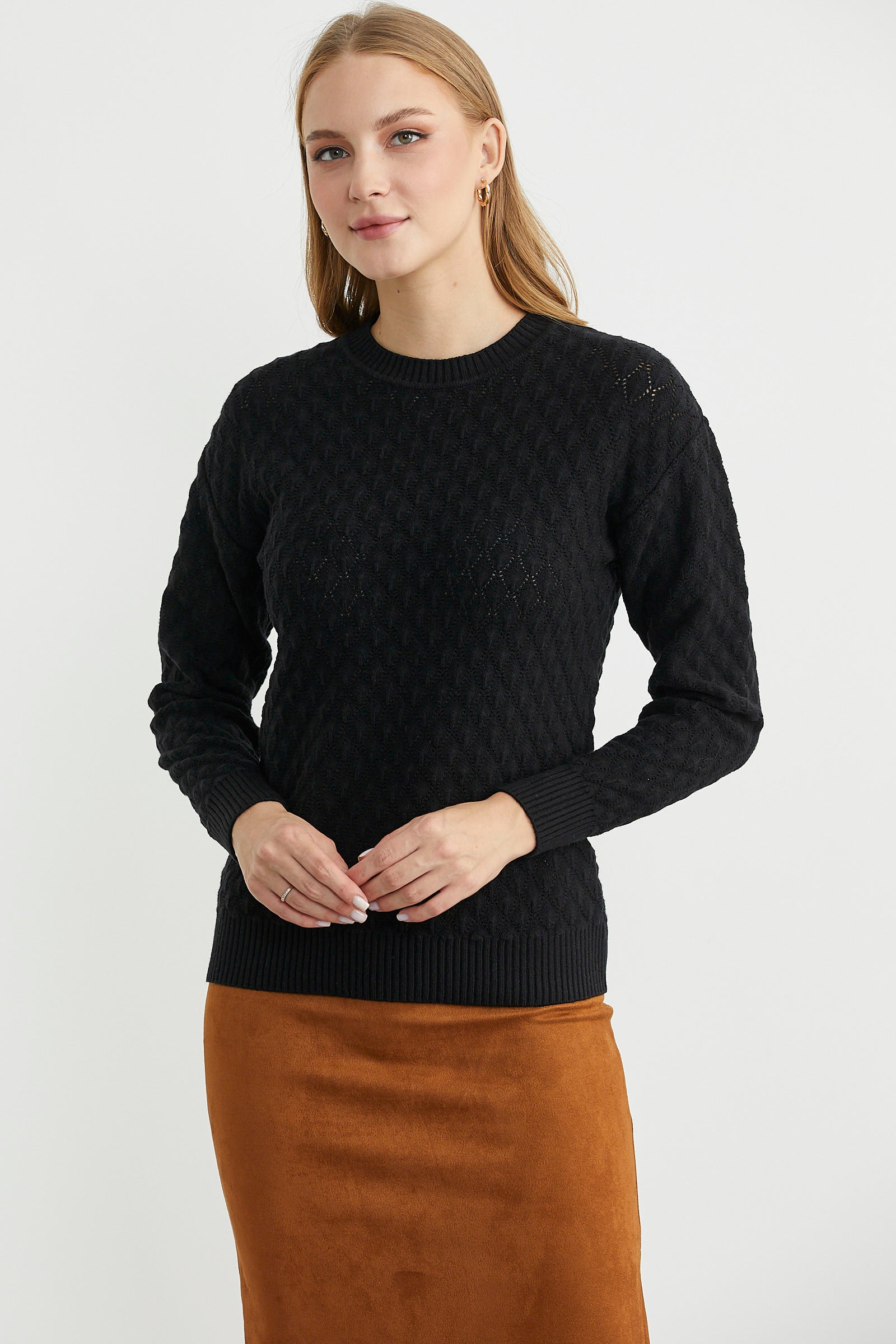 Yuvarlak yaka, delik desenli, ince triko kazak. Uzun kollu. Etek ucu düz.