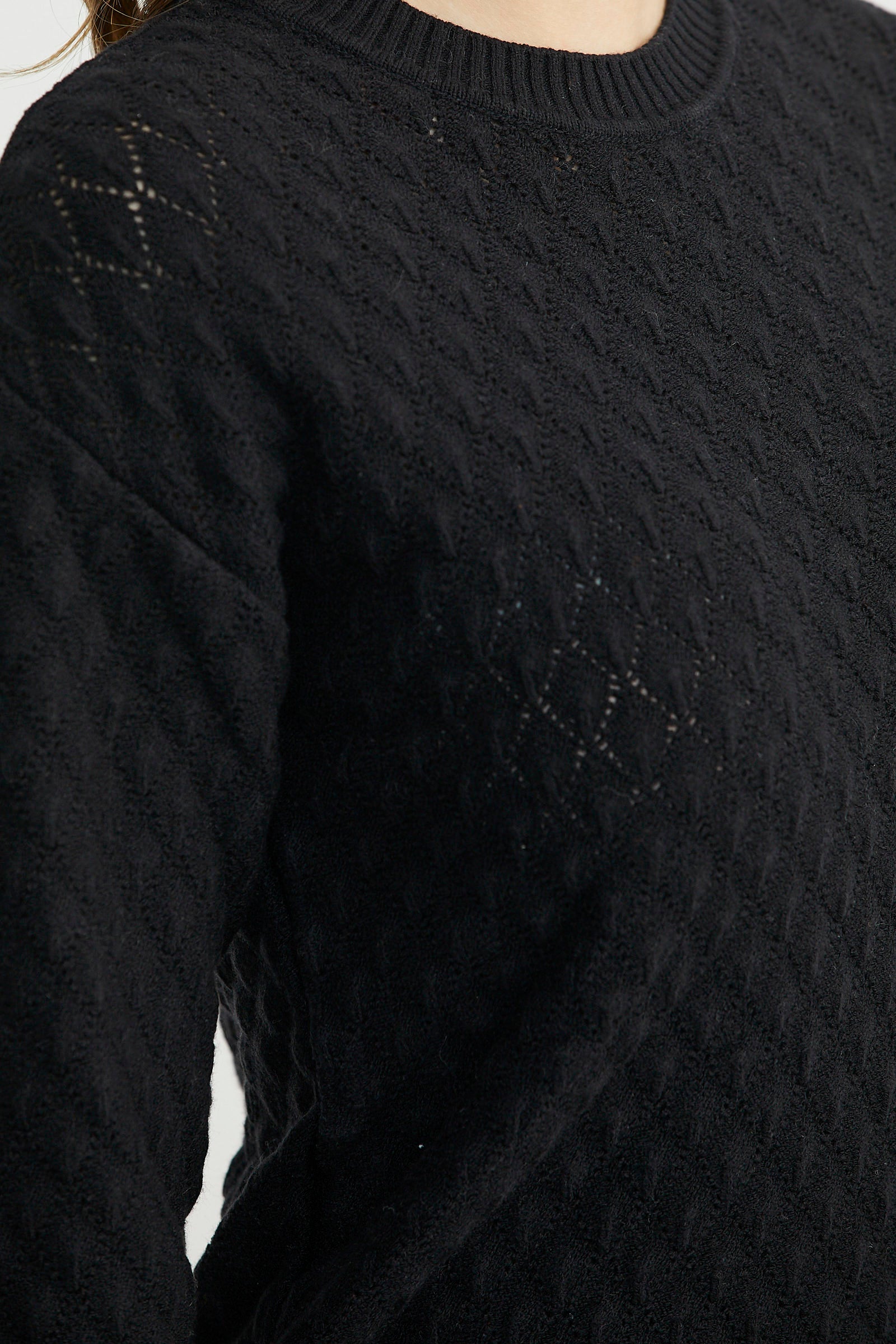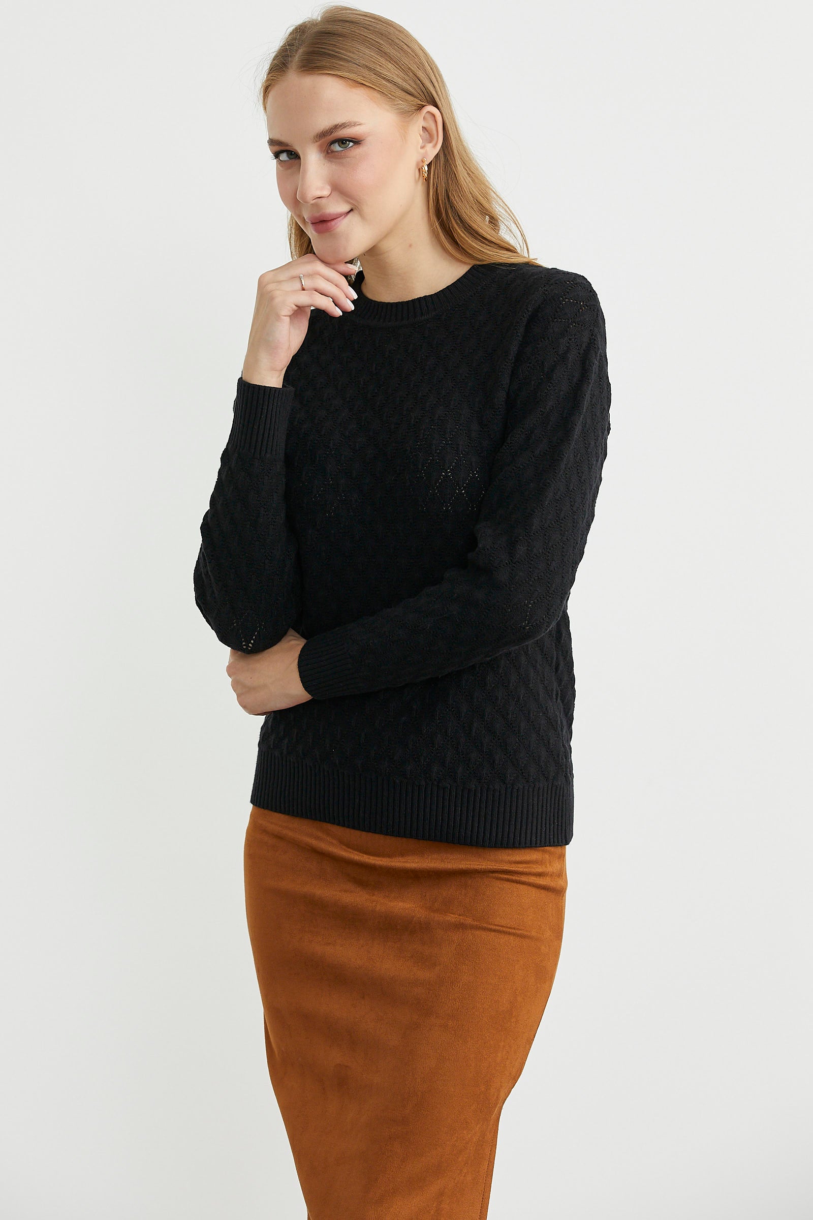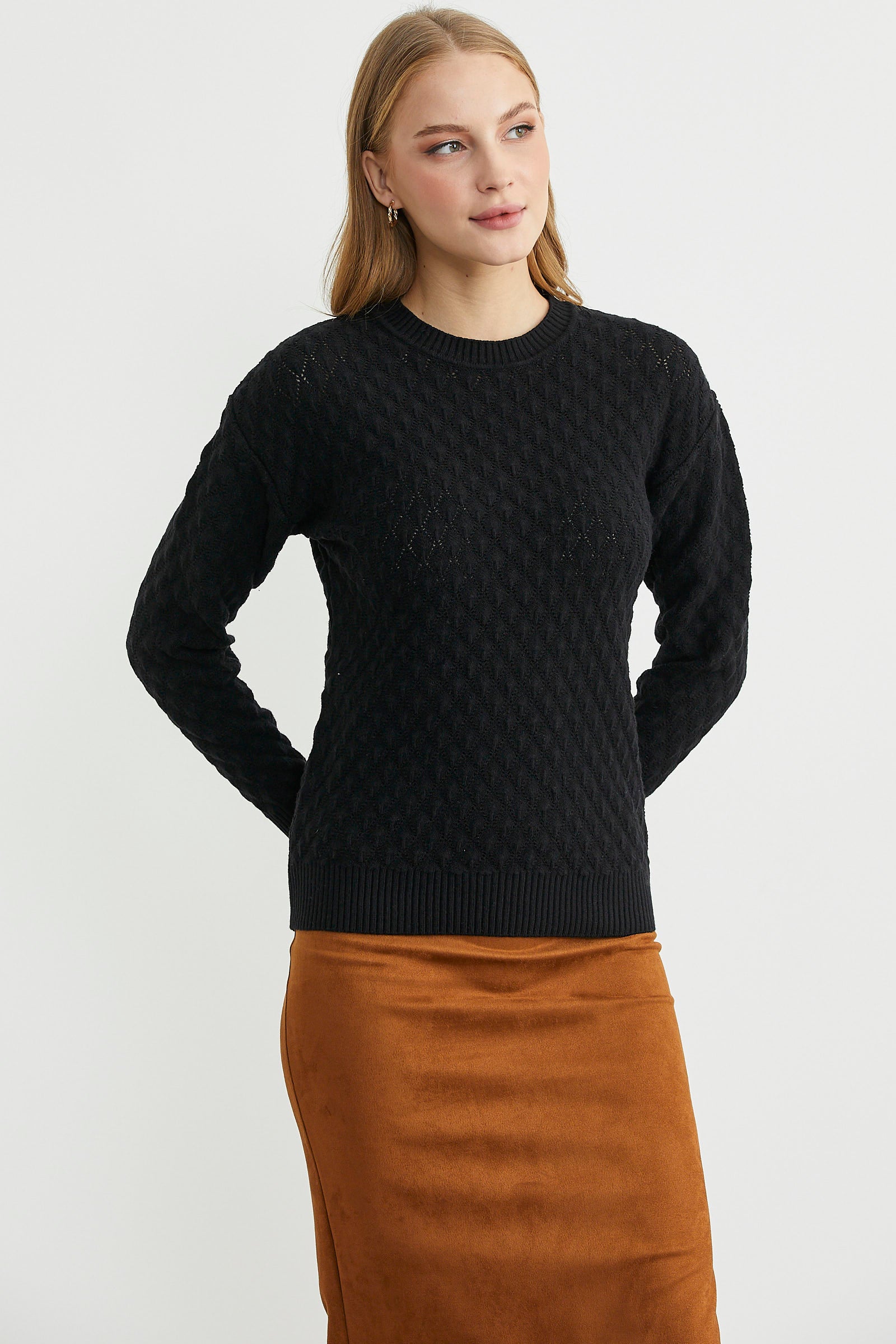 Yuvarlak yaka, delik desenli, ince triko kazak. Uzun kollu. Etek ucu düz.