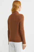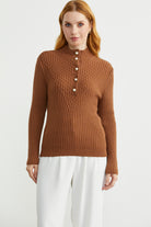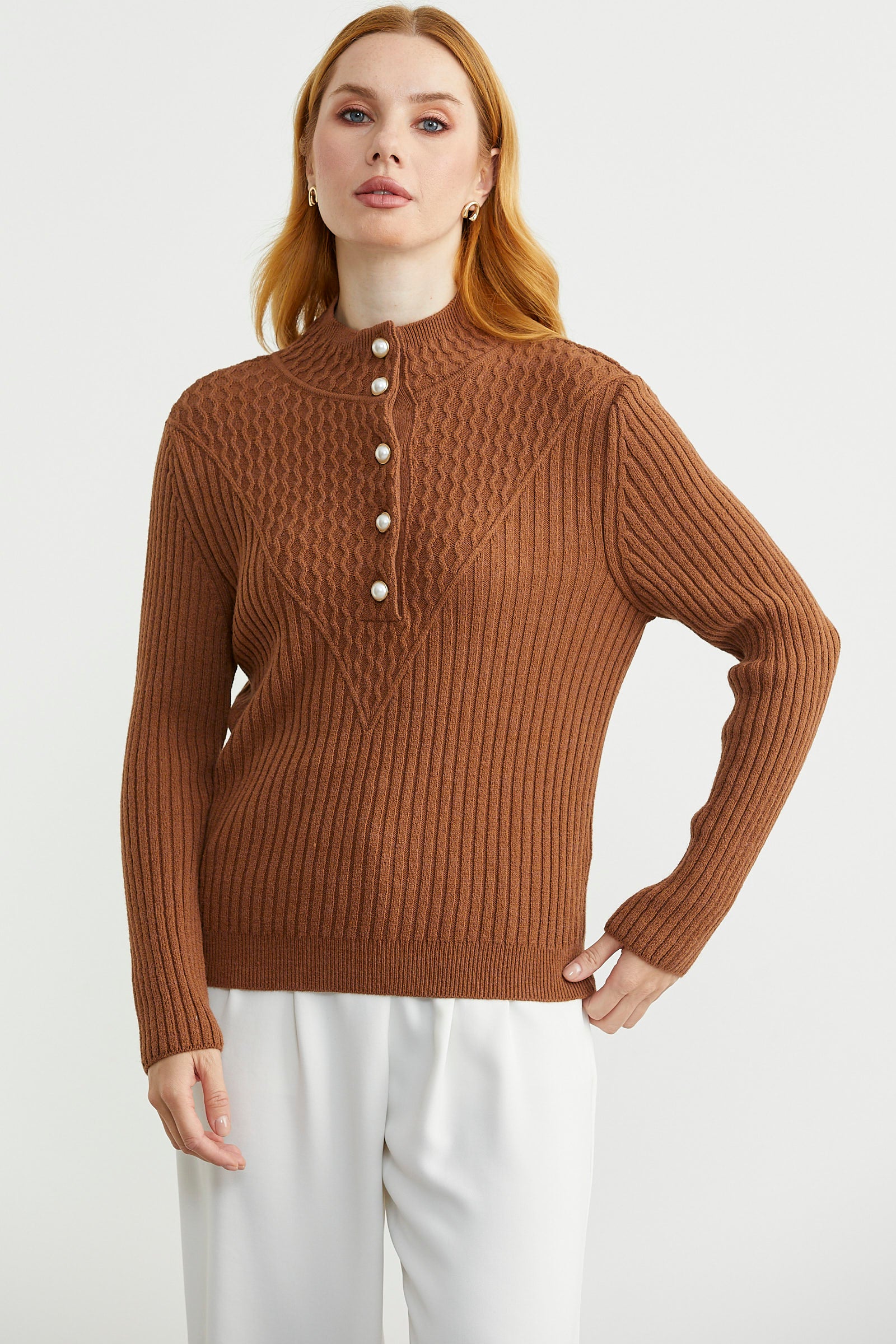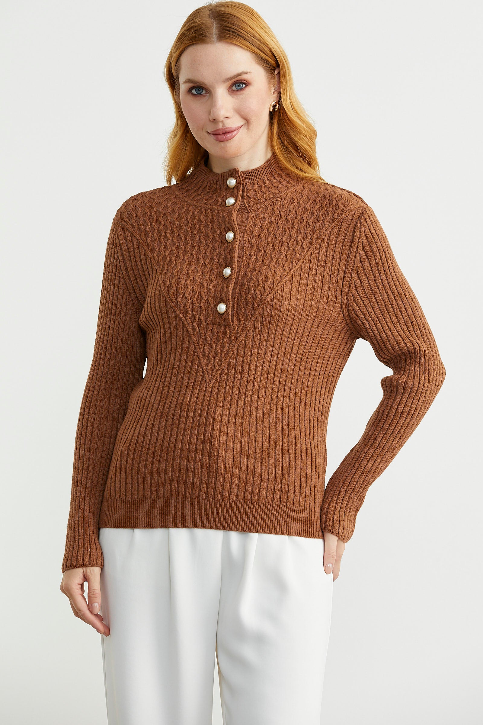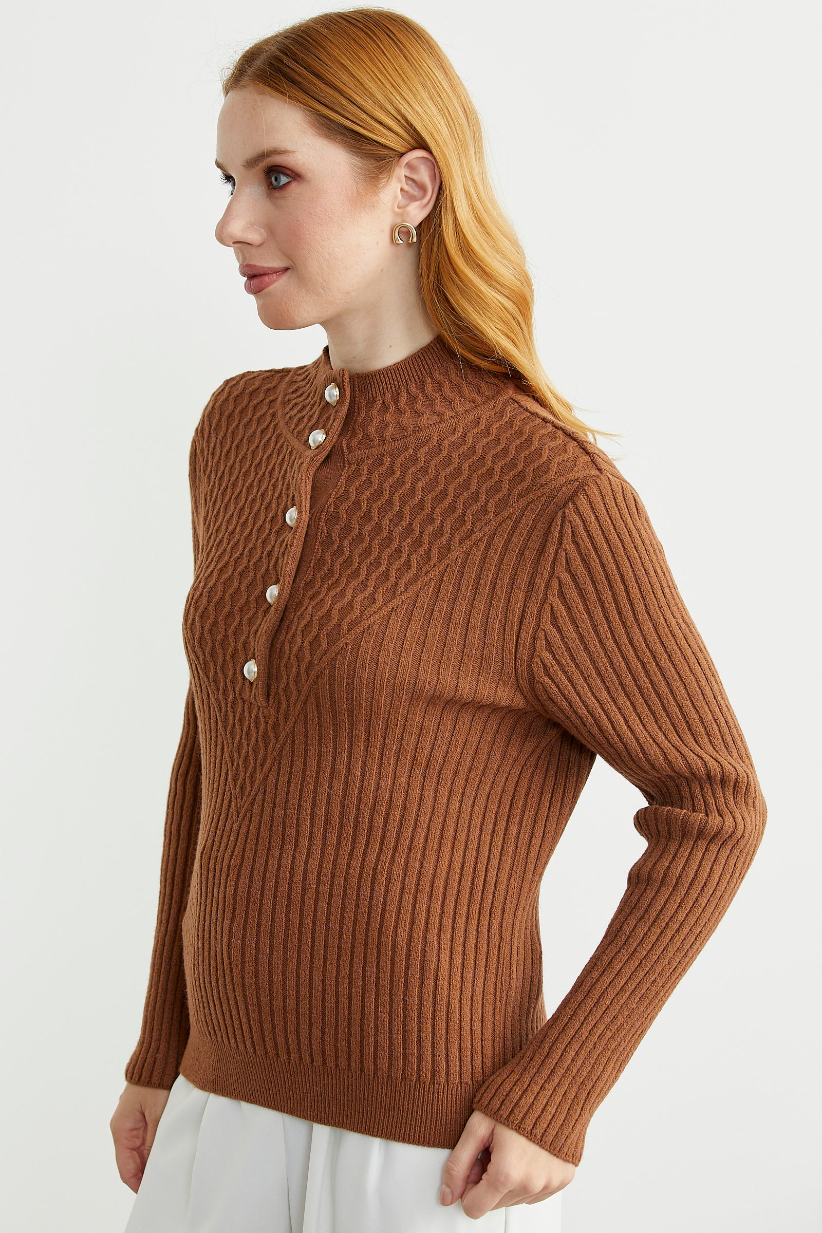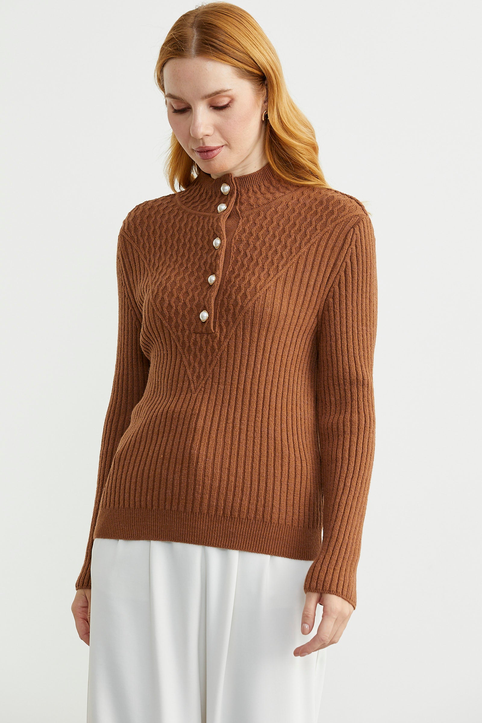 Önü Düğmeli Dik Yaka Triko Kazak - Taba