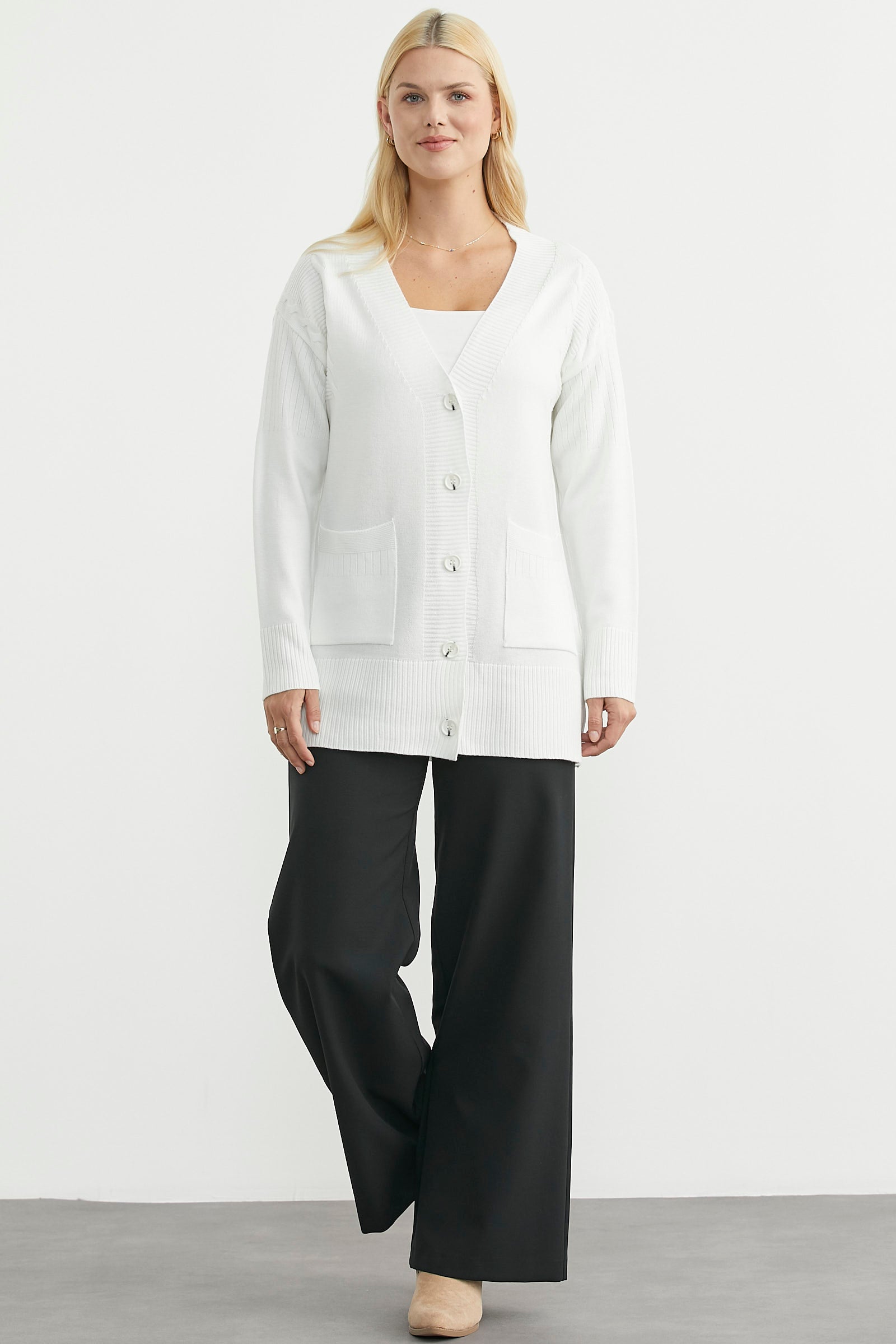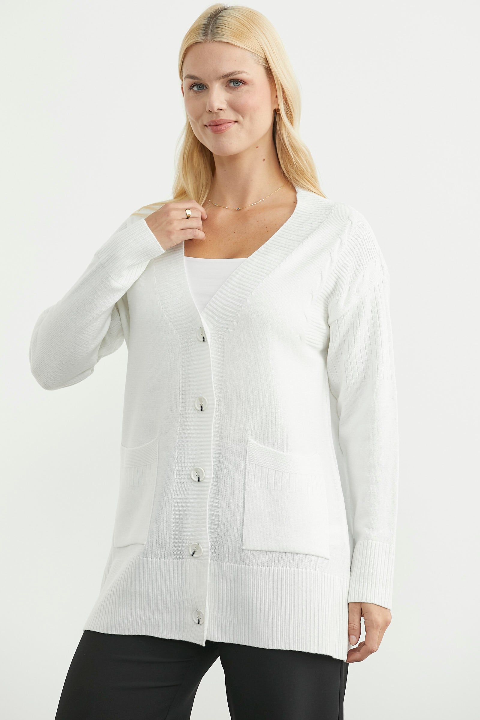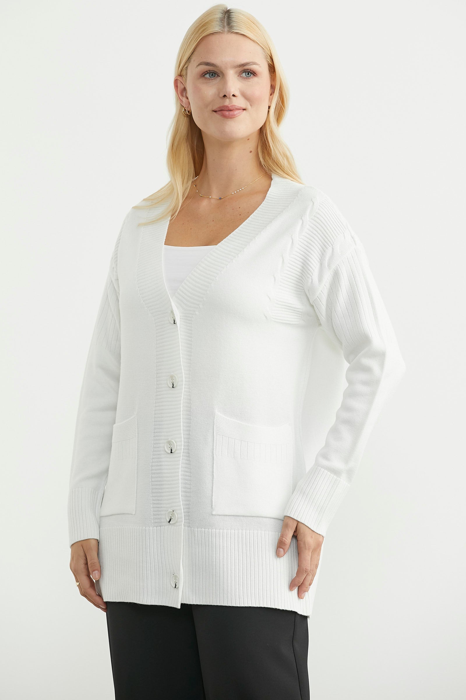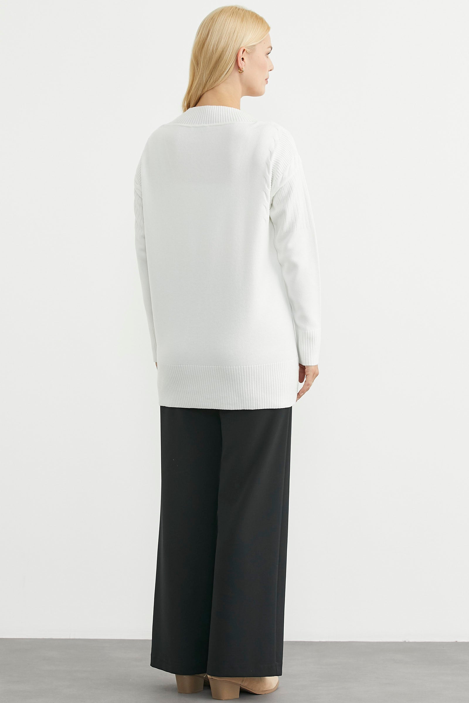 V yakalı, önü düğmeli, düşük omuzlu, cepli triko hırka. Yakası, düğme bandı , manşetleri ve etek ucu lastik örgülü. Rahat kalıp, uzun boy.