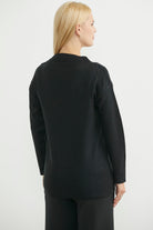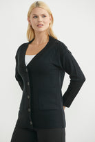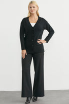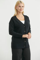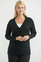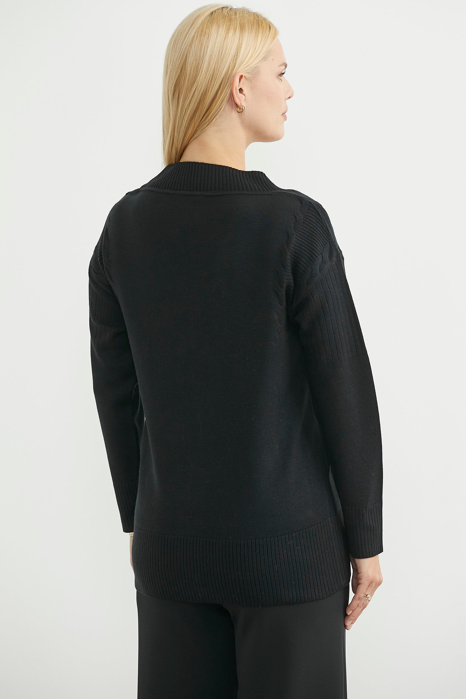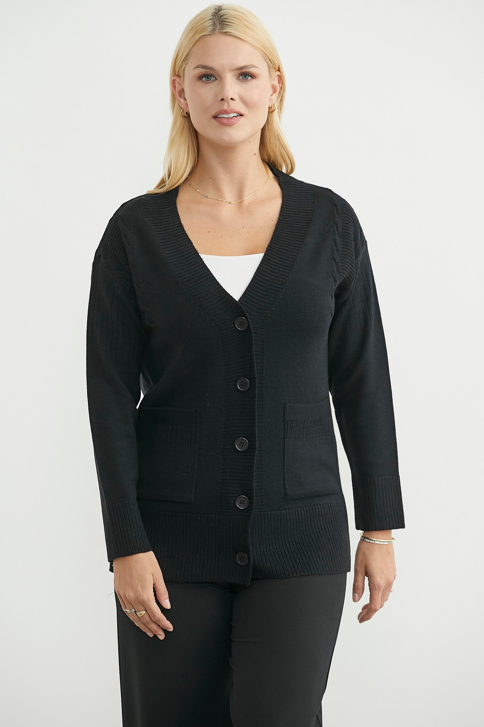 V yakalı, önü düğmeli, düşük omuzlu, cepli triko hırka. Yakası, düğme bandı , manşetleri ve etek ucu lastik örgülü. Rahat kalıp, uzun boy.