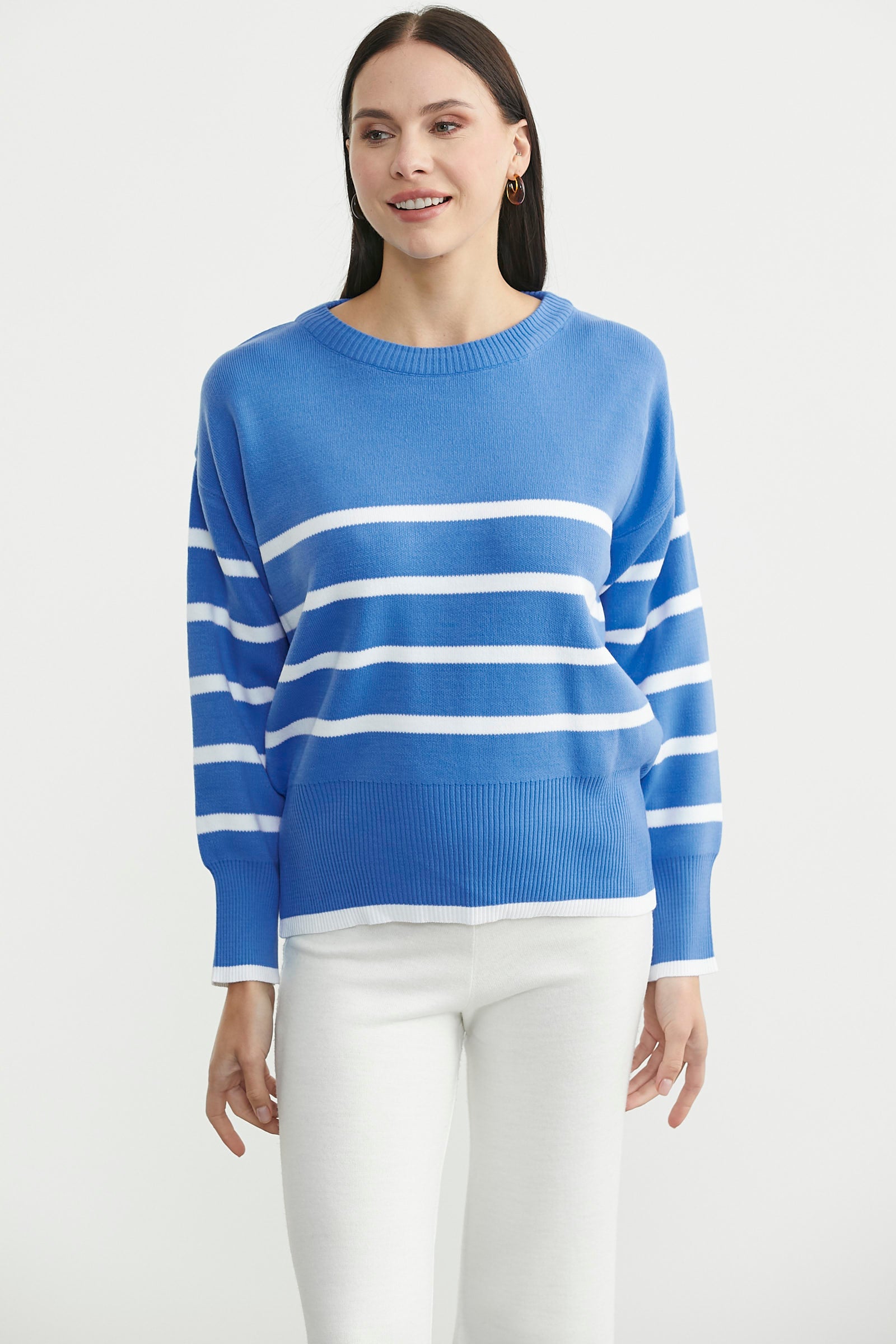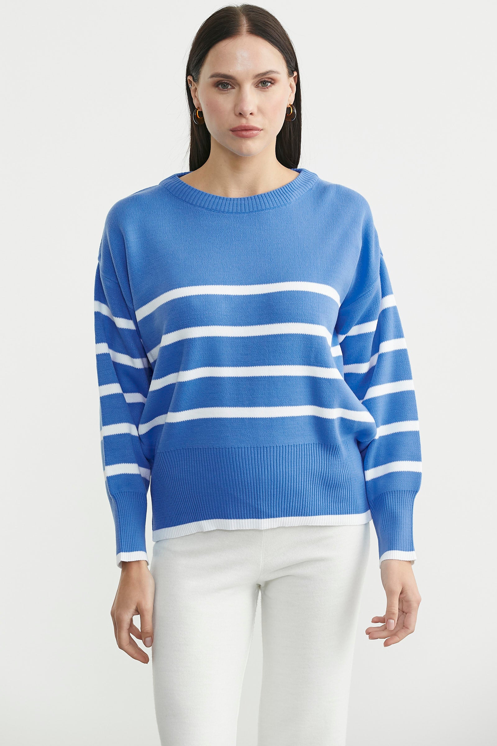 Oversize Çizgi Detaylı Triko Kazak - Mavi