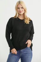 Yuvarlak yaka, önü verev, manşet ve etek ucu lastik örme, basic triko kazak.