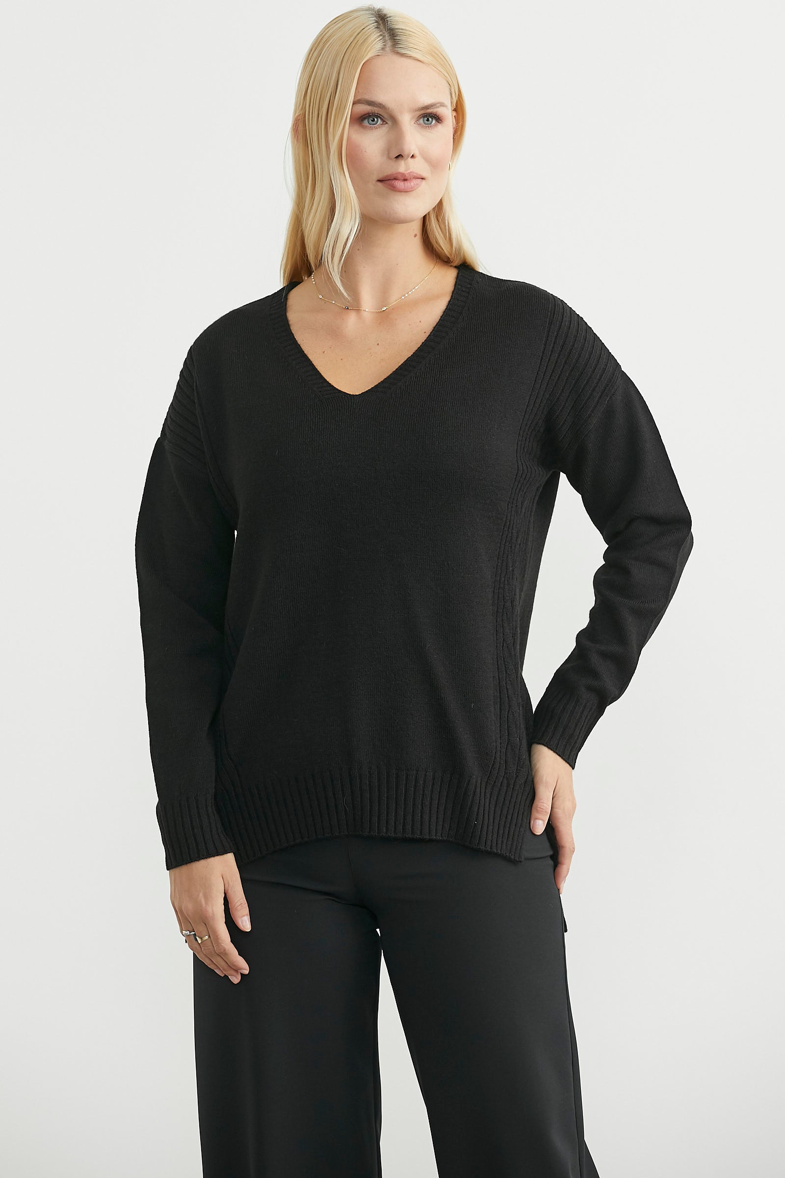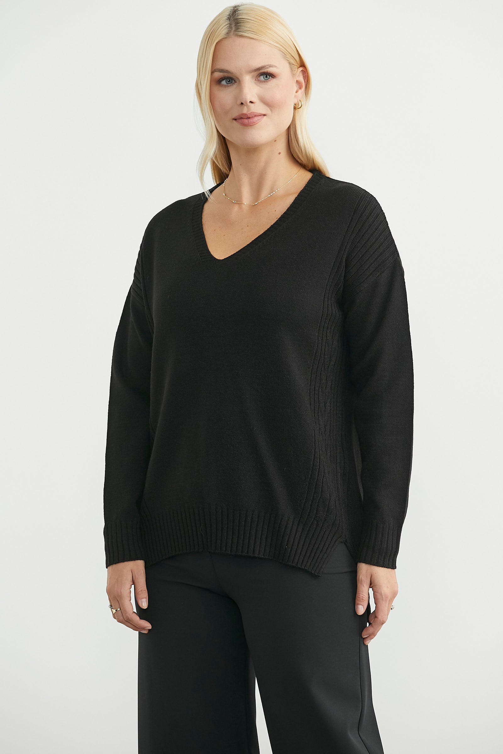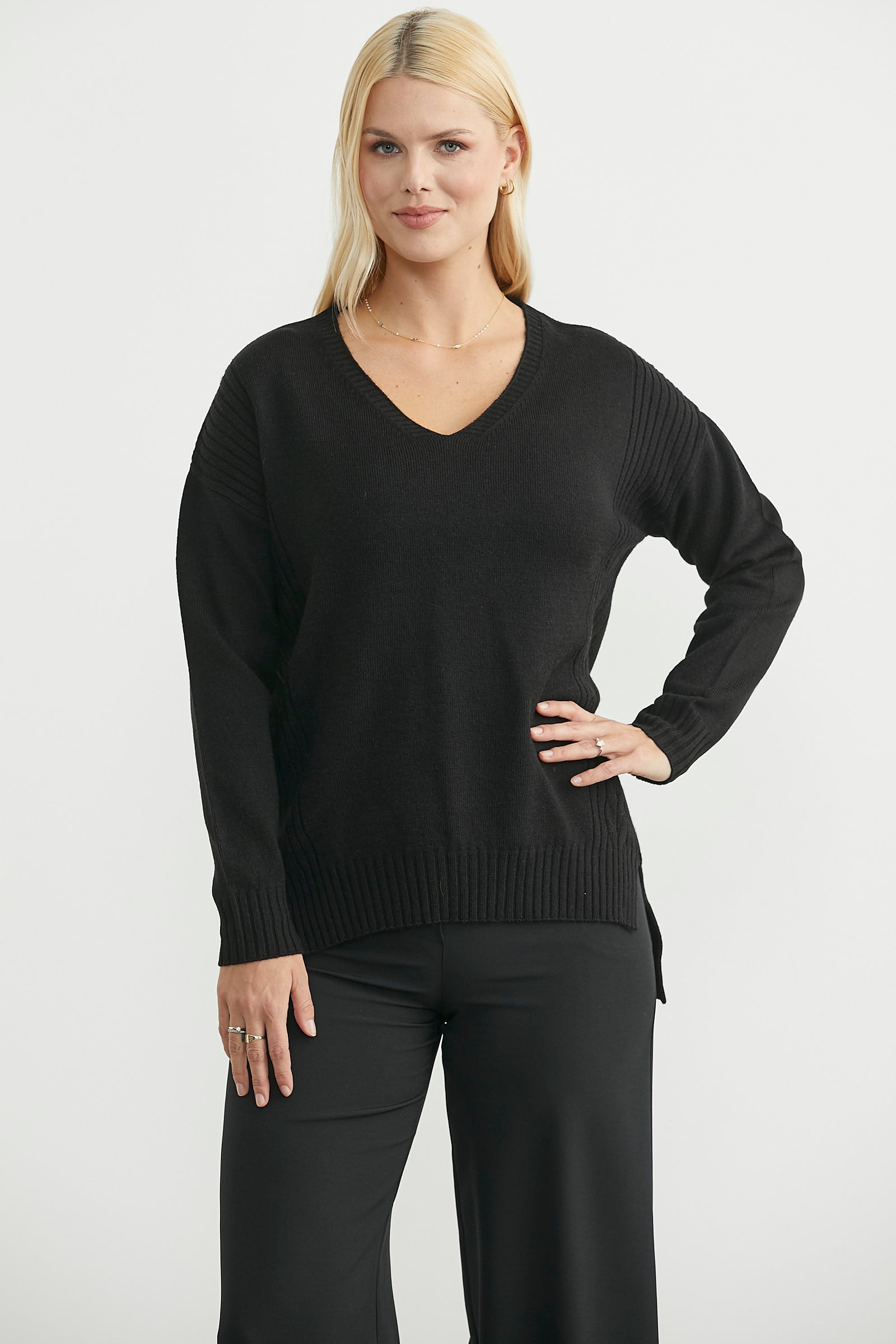 V yaka, bol kesim, yumuşak dokulu triko kazak. Arkası uzun, yanları motifli.