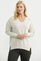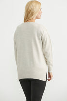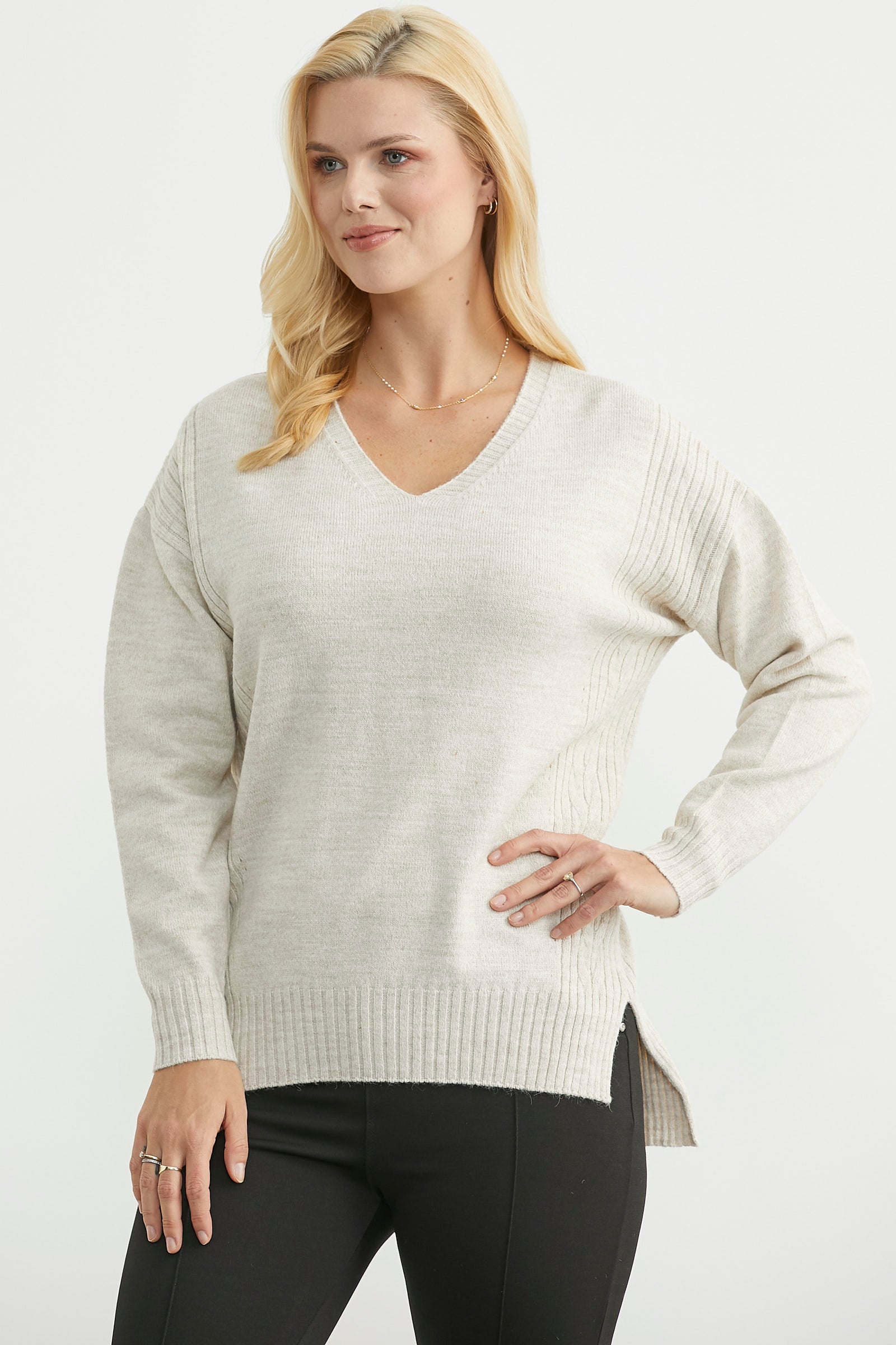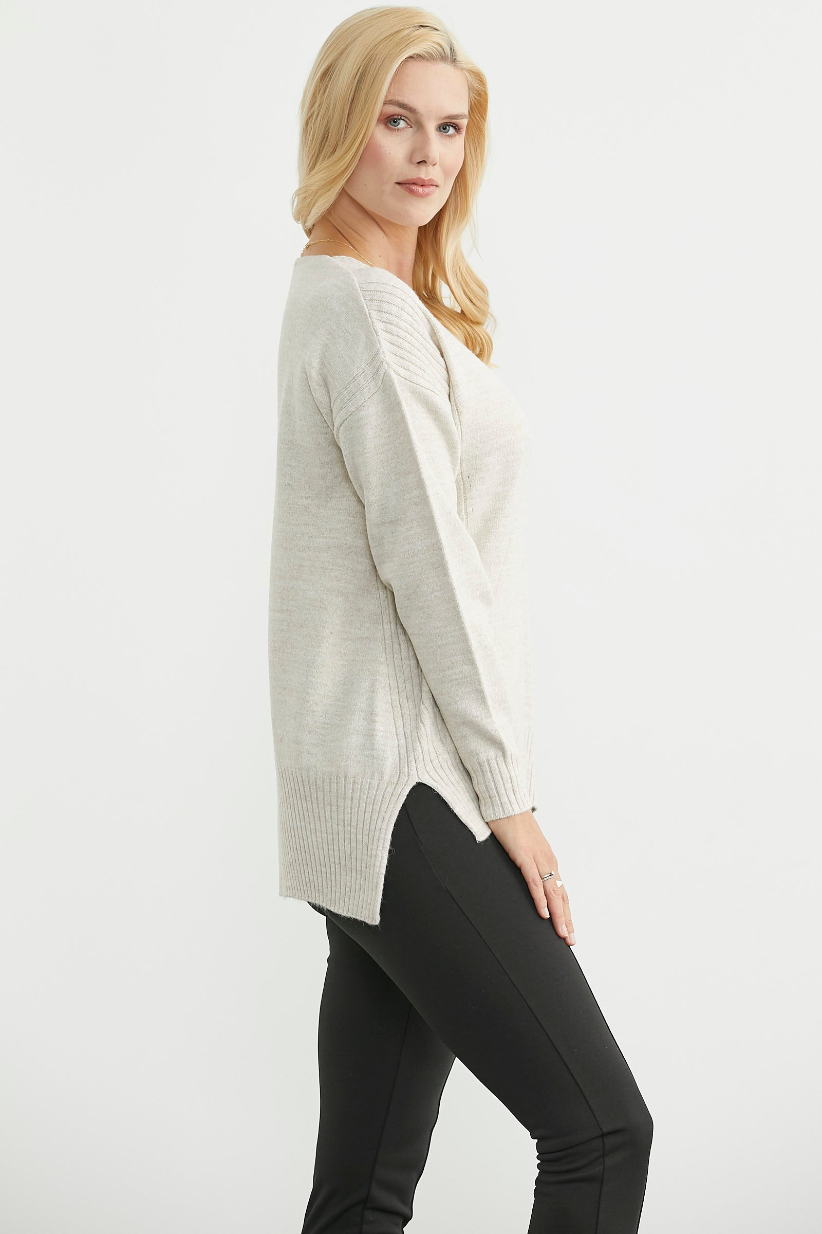 V yaka, bol kesim, yumuşak dokulu triko kazak. Arkası uzun, yanları motifli.