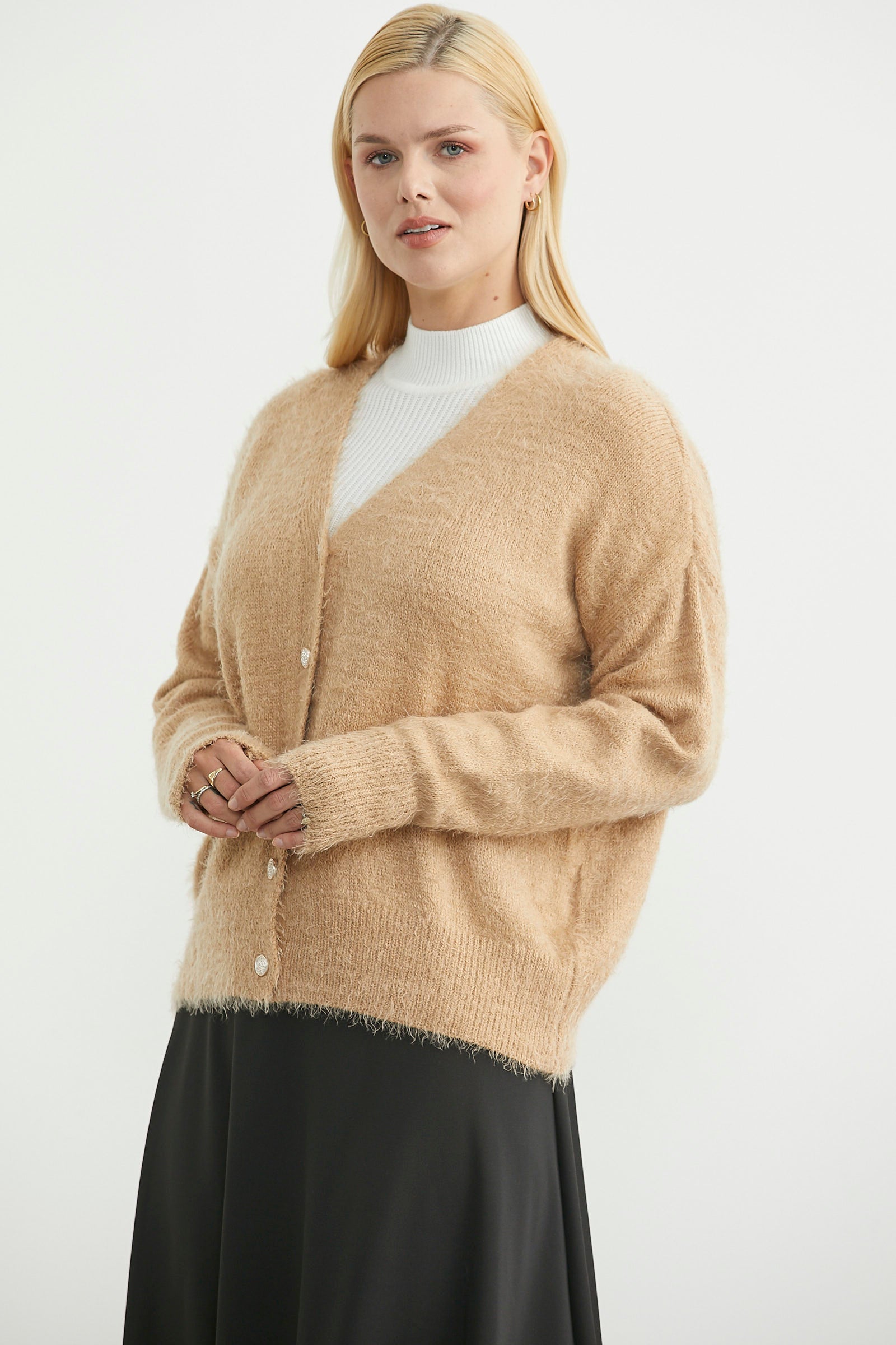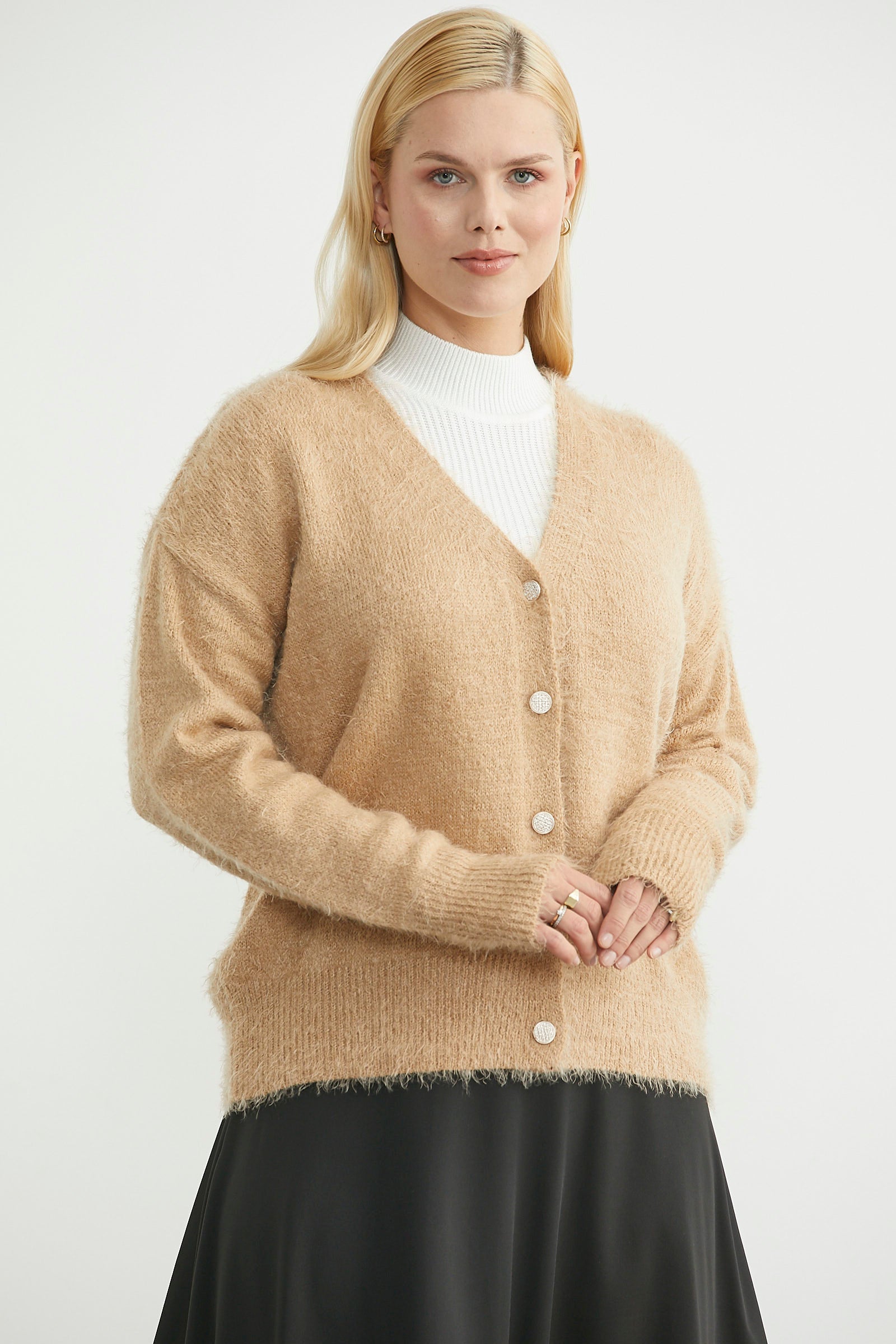 V yaka, metal düğme kapamalı, manşet ve etek ucu lastik örgülü triko hırka.