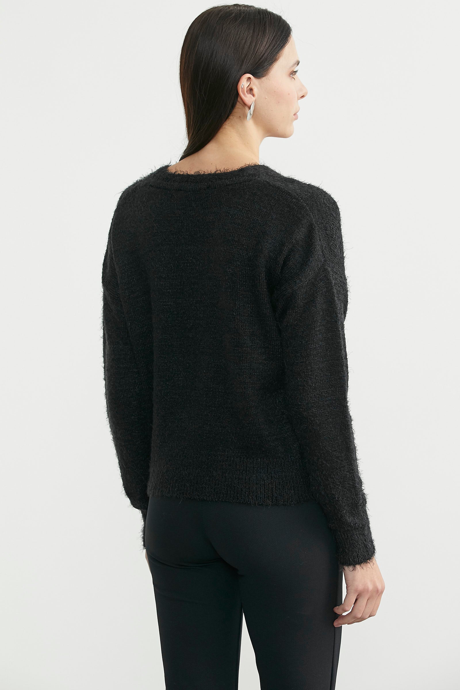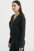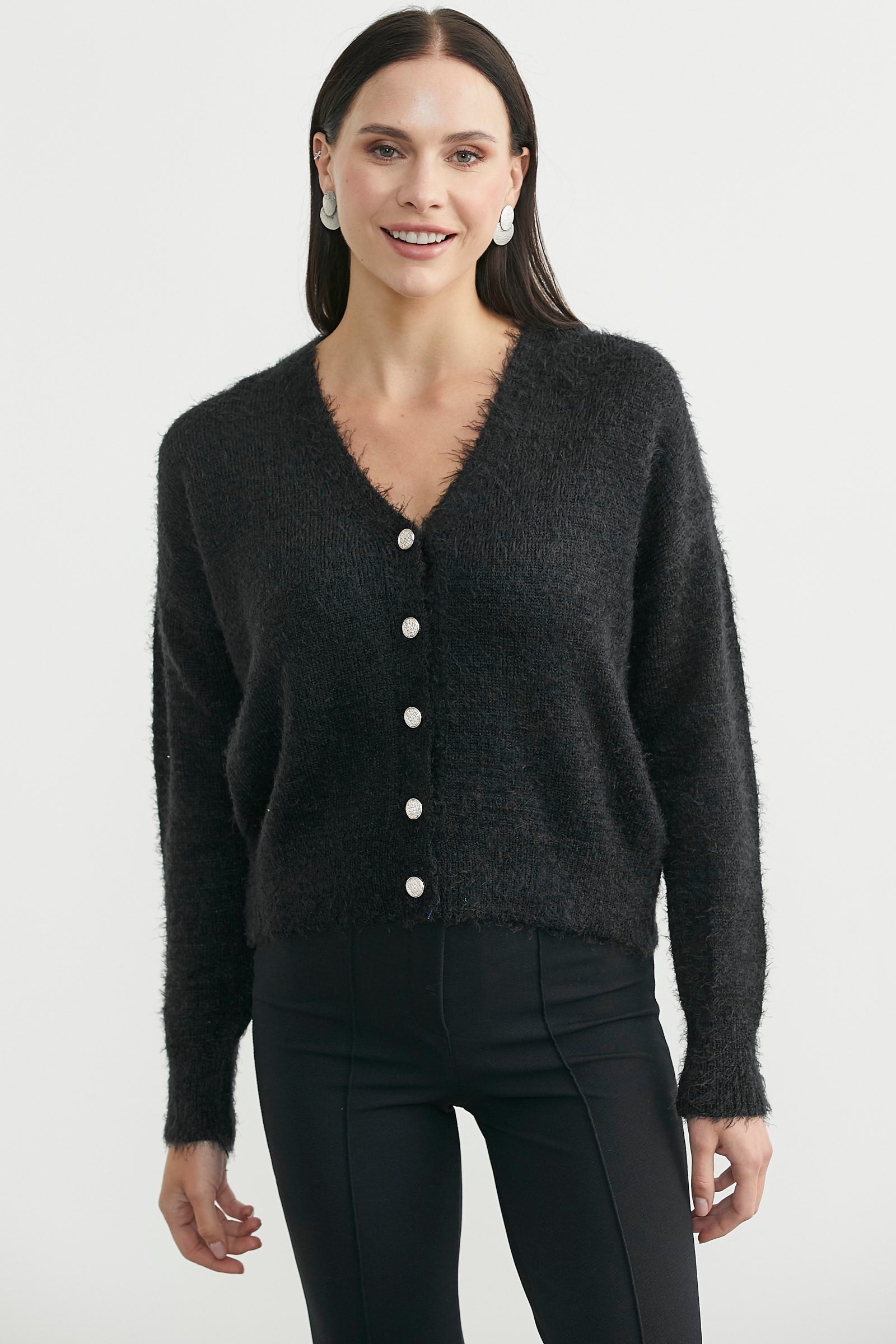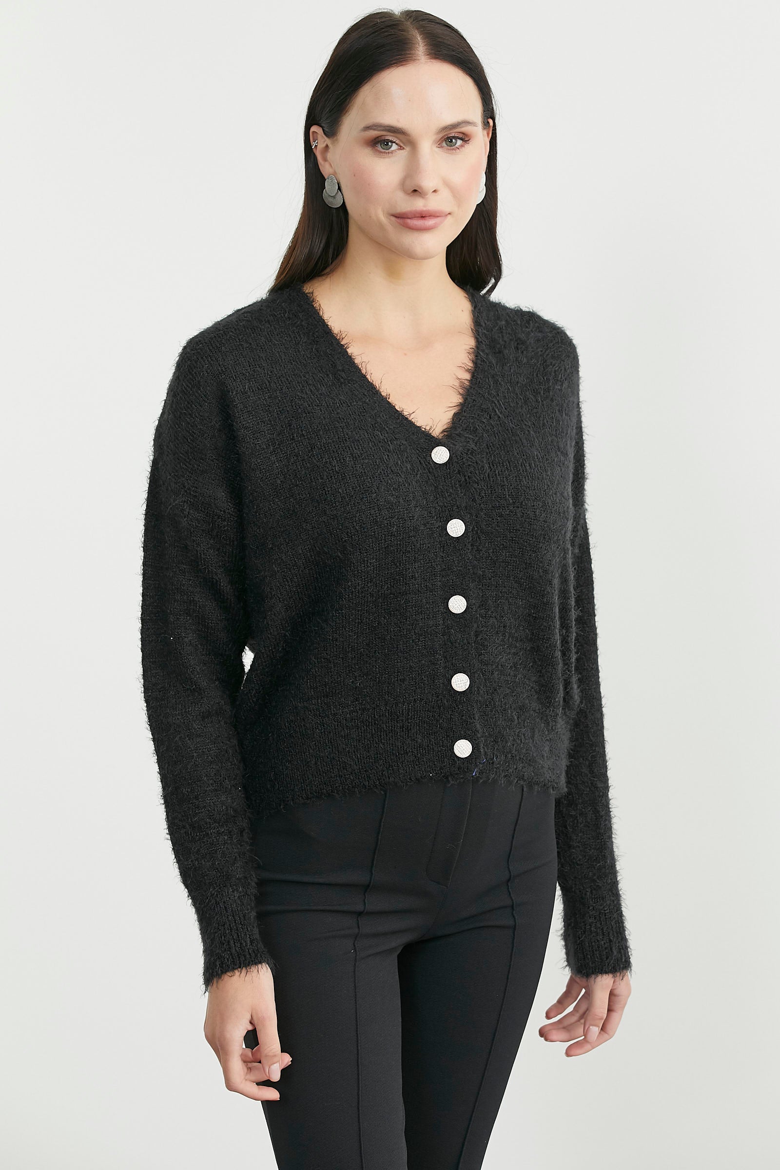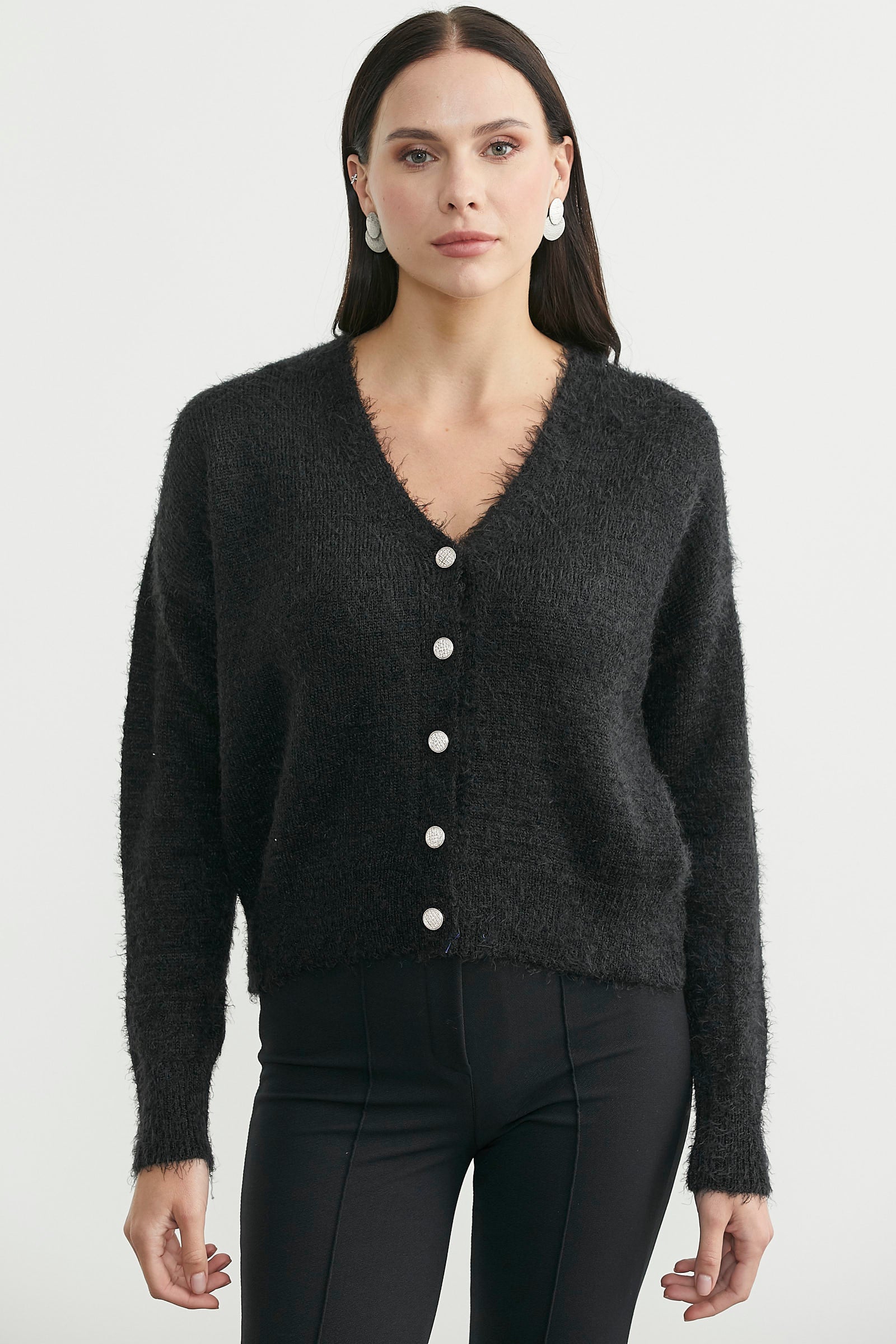 V yaka, metal düğme kapamalı, manşet ve etek ucu lastik örgülü triko hırka.