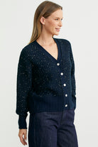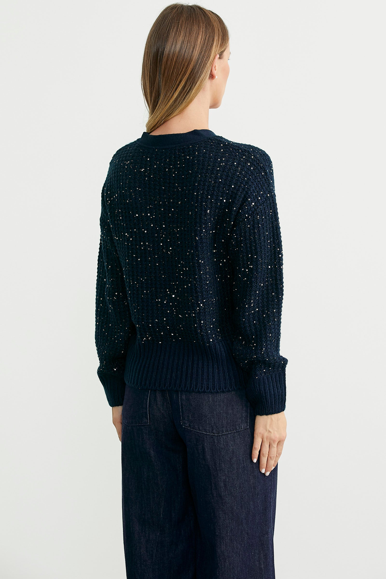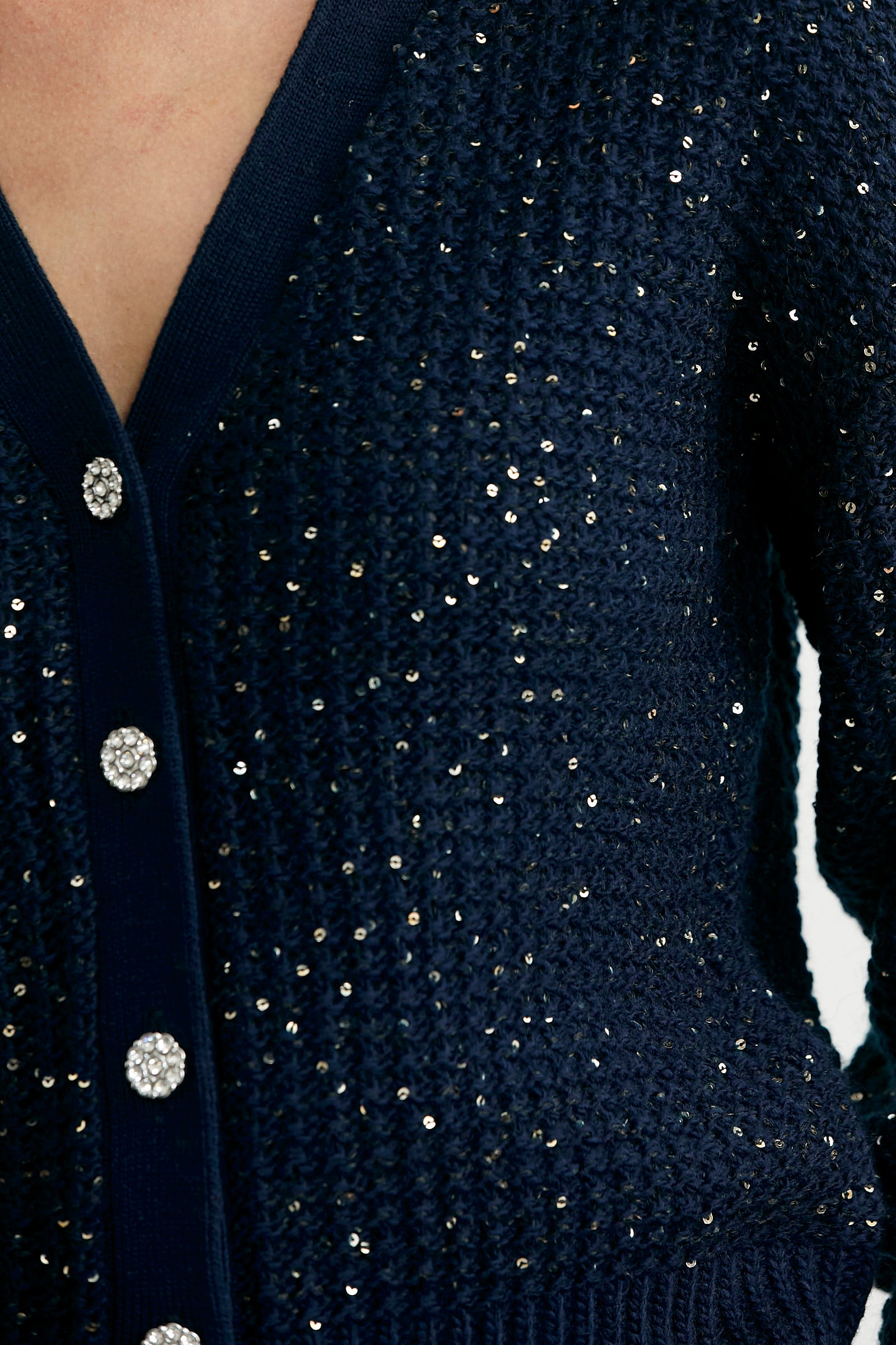 V yaka payetli şık triko hırka. Metal düğme kapamalı. Kol manşetleri ve etek ucu lastik örme bitişli.