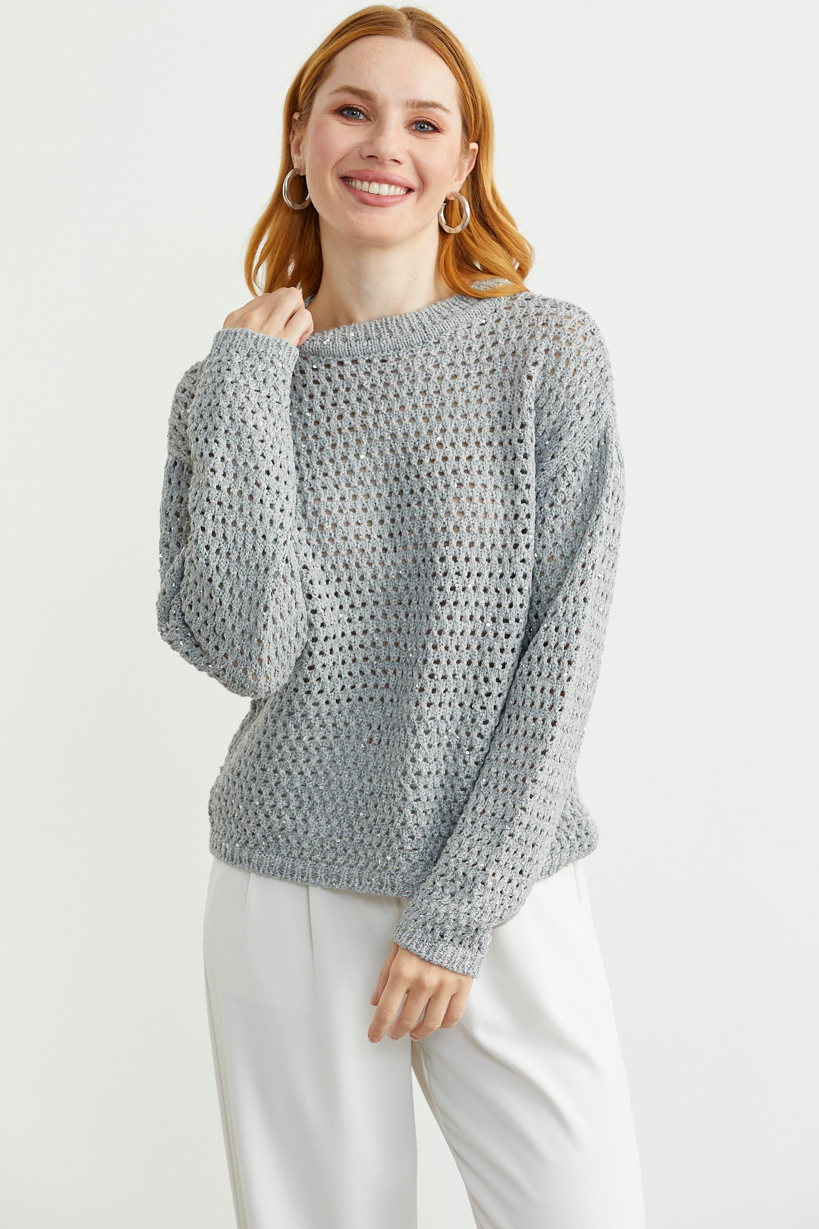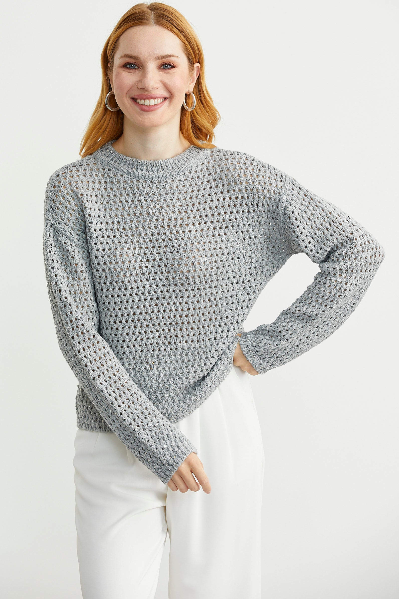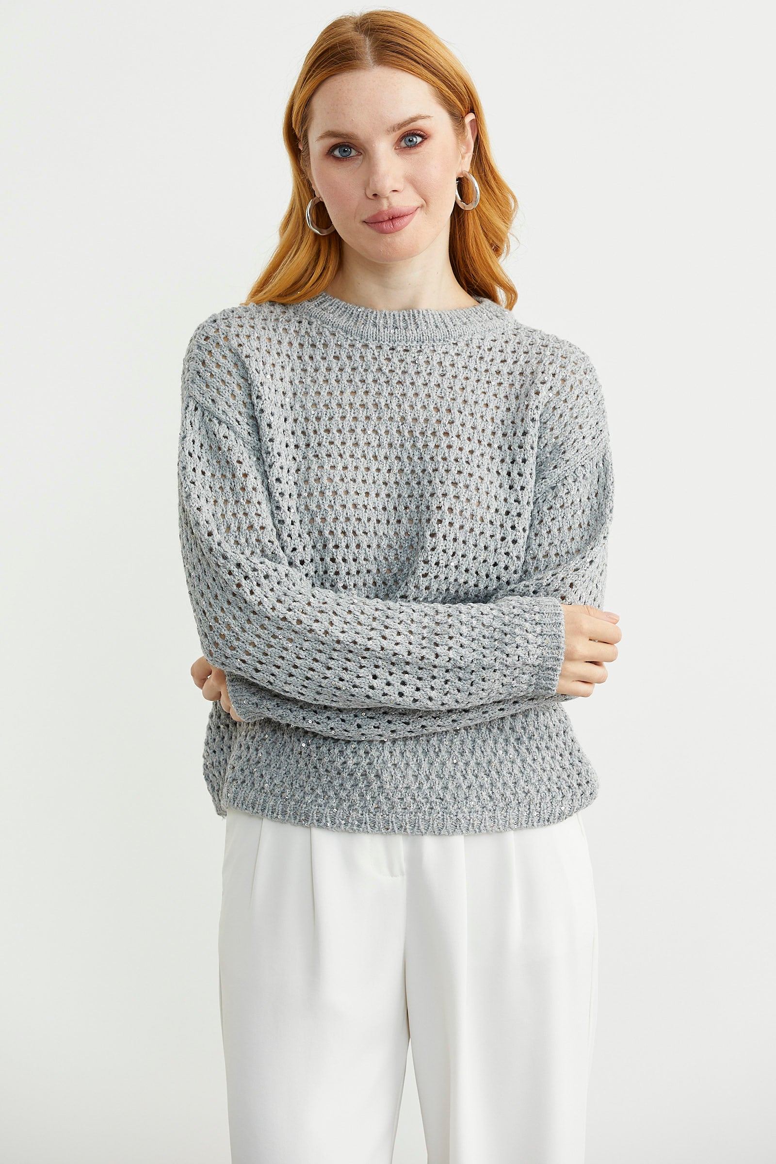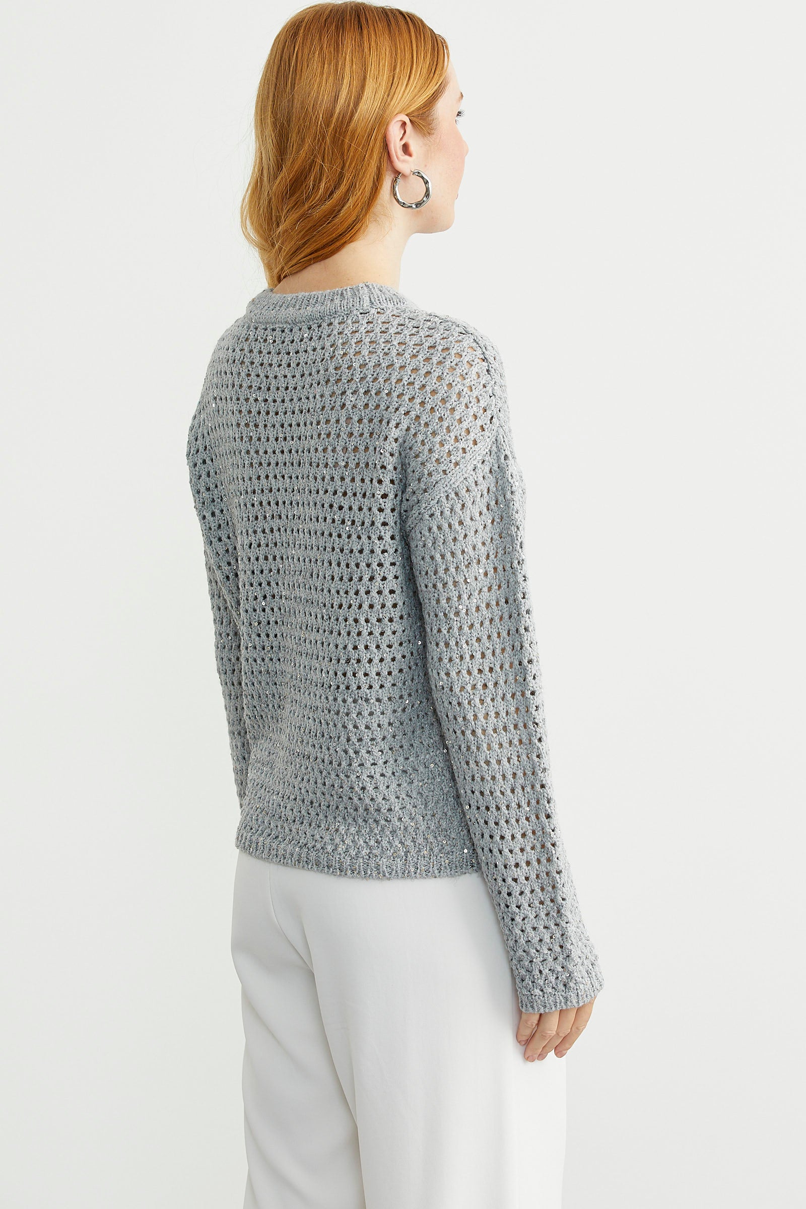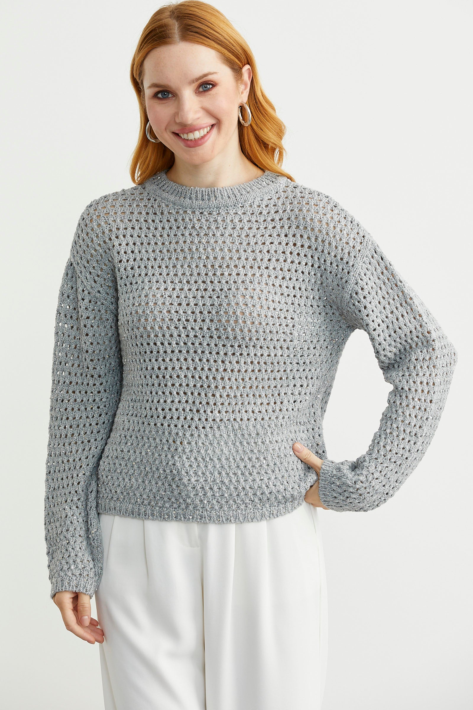 Sıfır yaka, delik motifli triko kazak. Payet detaylı ve ışıltılıdır.