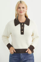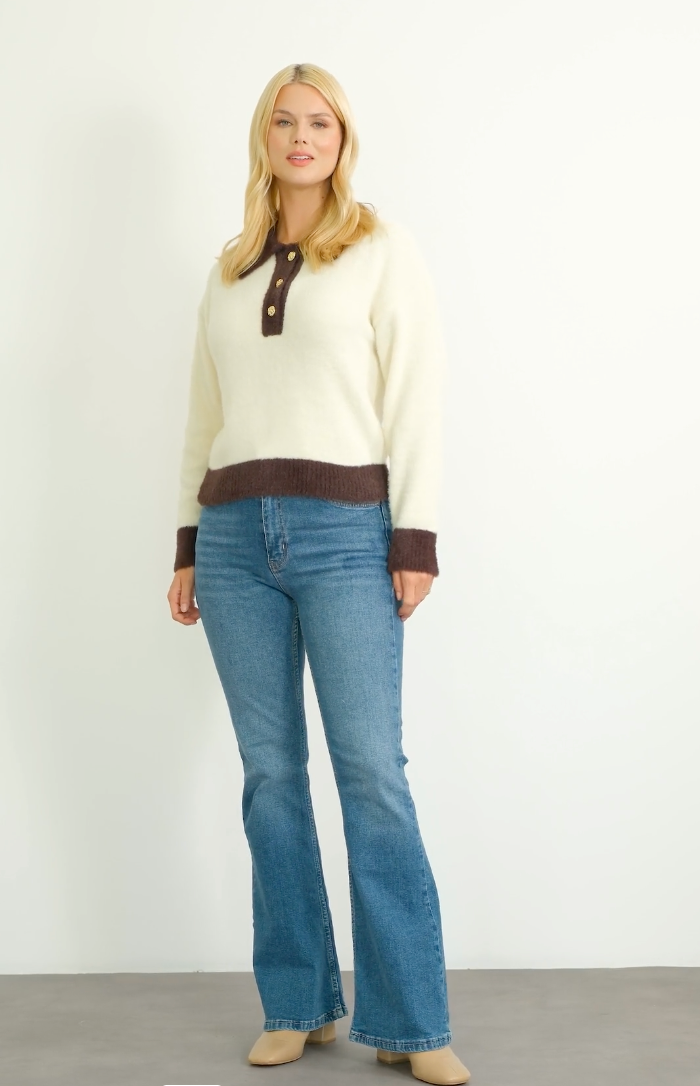 Yumoş, lastik örgülü kısa triko kazak. Kontrast renk yakalı, metal düğmeli, rahat kalıp.