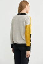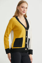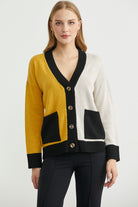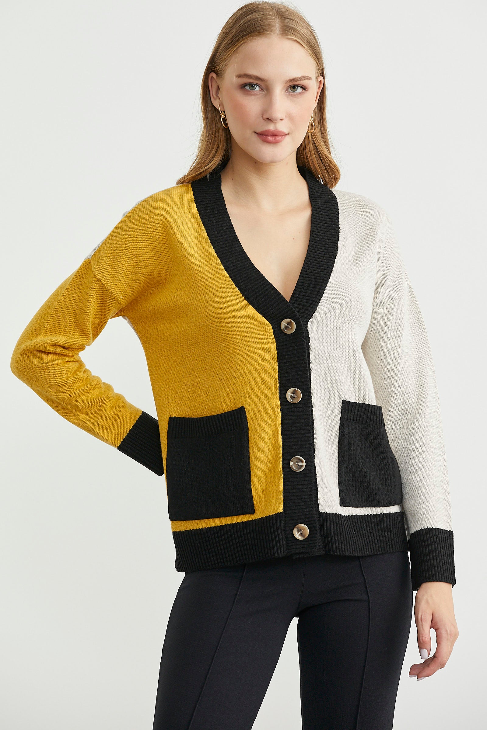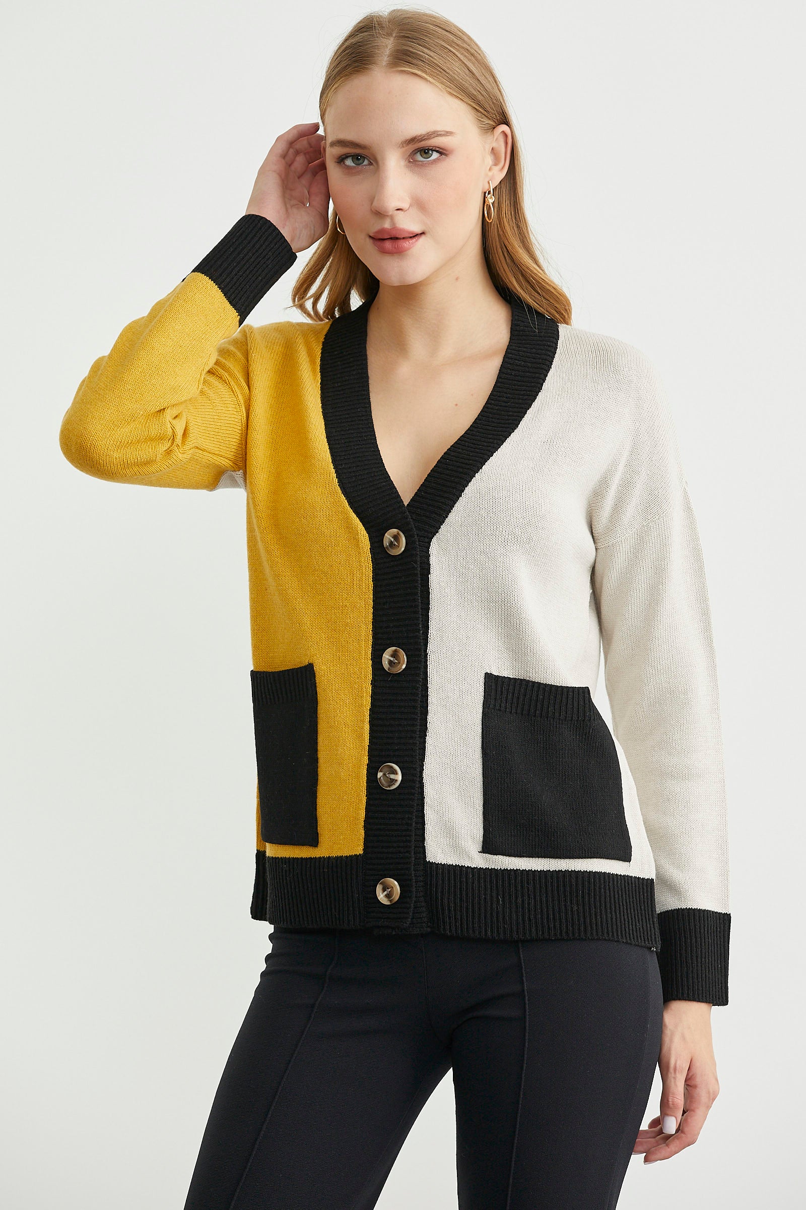 V yakalı, yün oranı yüksek, yumuşak triko hırka. Düşük omuzlu, bol kesimli, cepli. Renk kombinlidir.