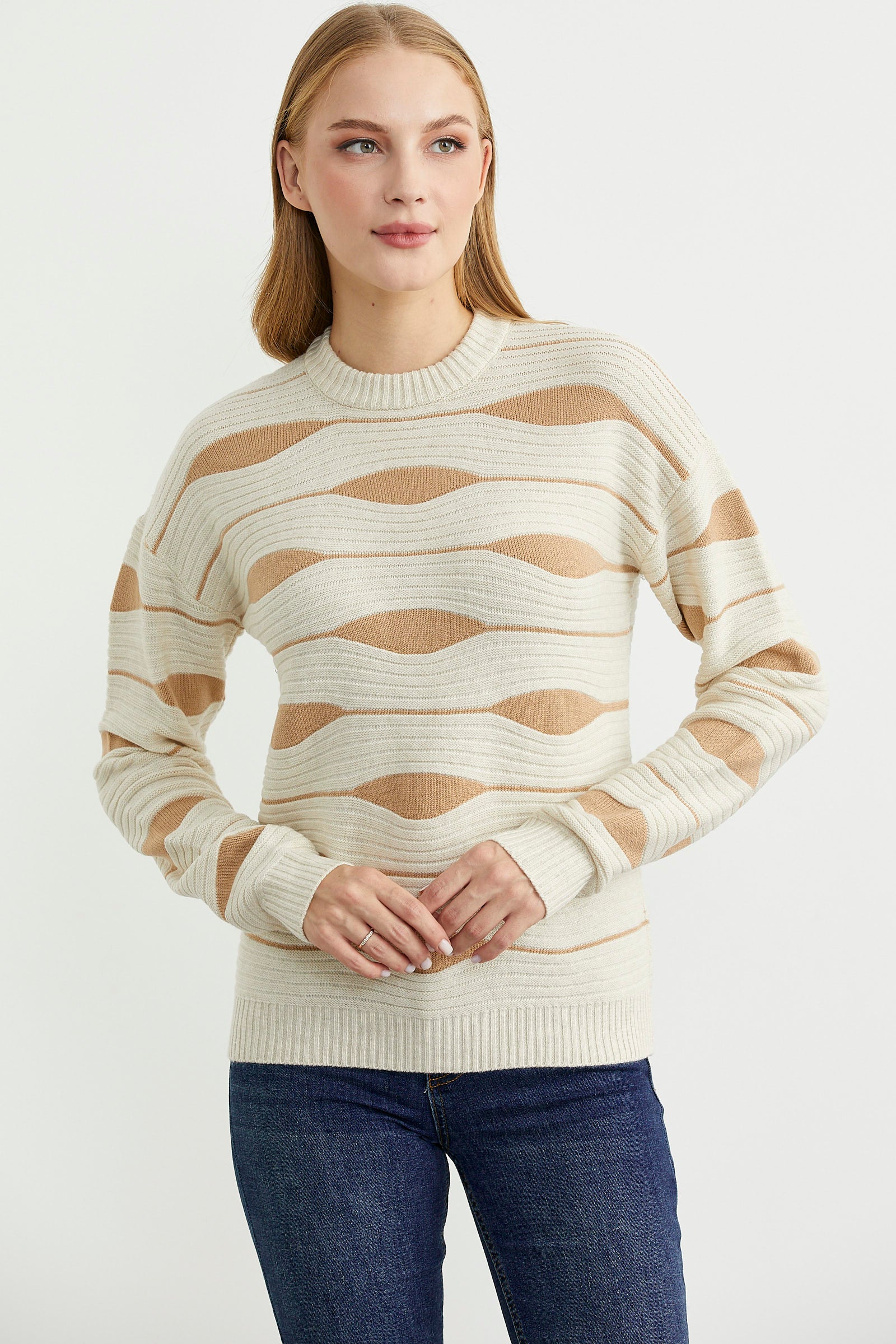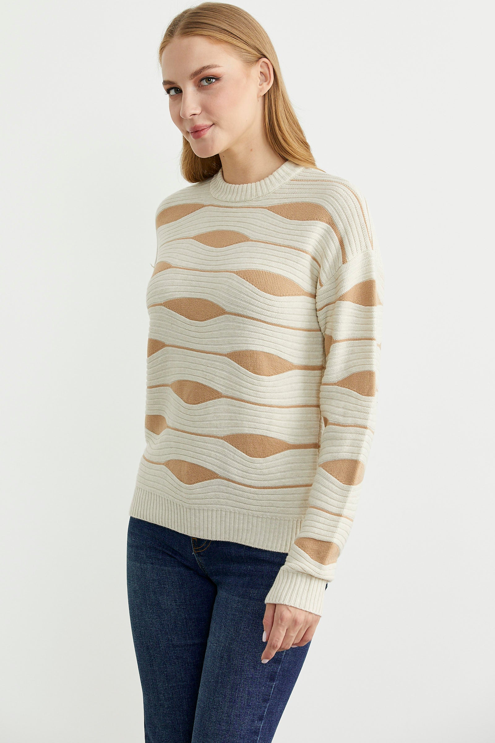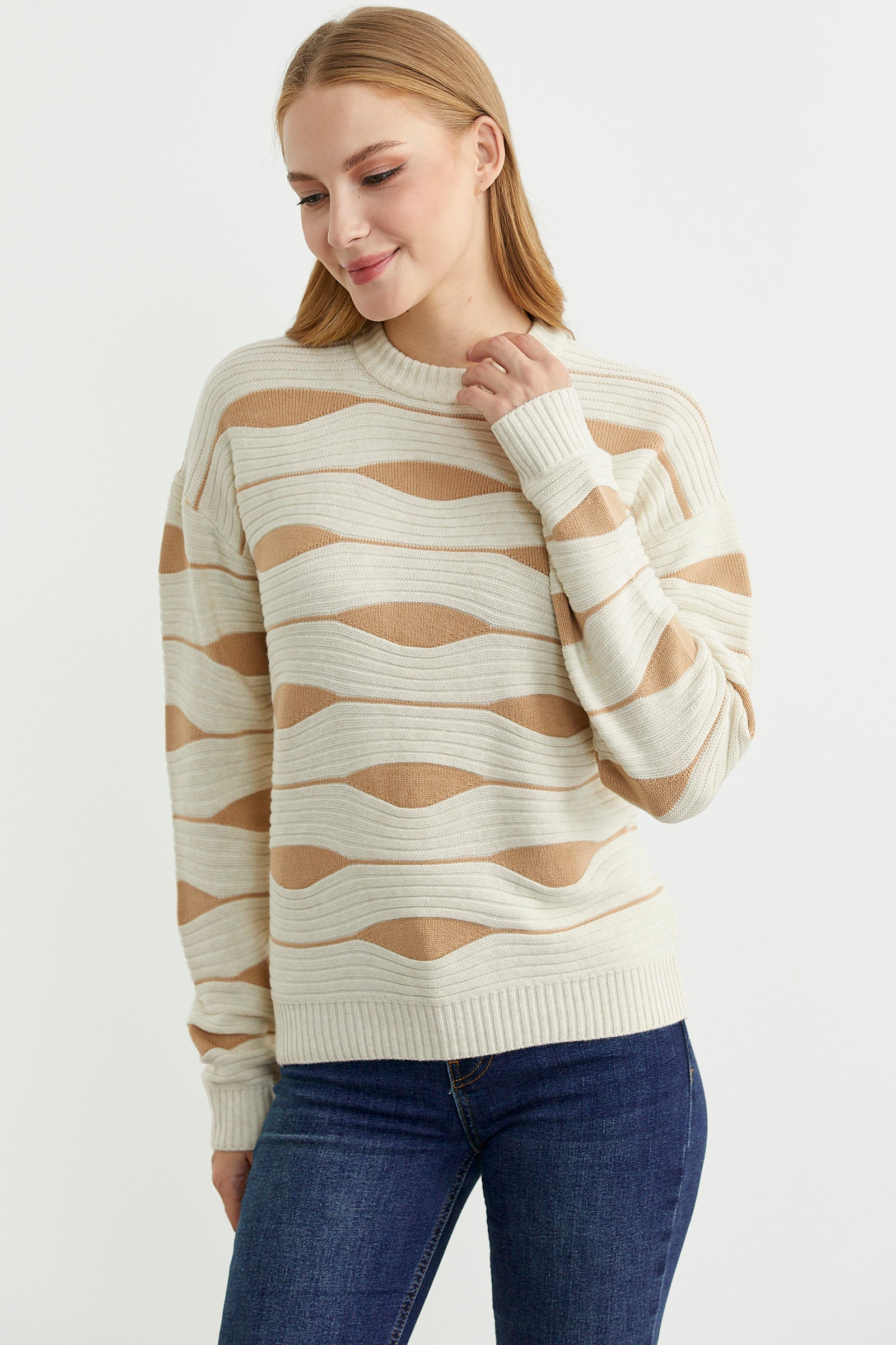 Kombinli kullanılan renk ve motif detayına sahiptir. Uzun kollu ve sıfır yakadır.
