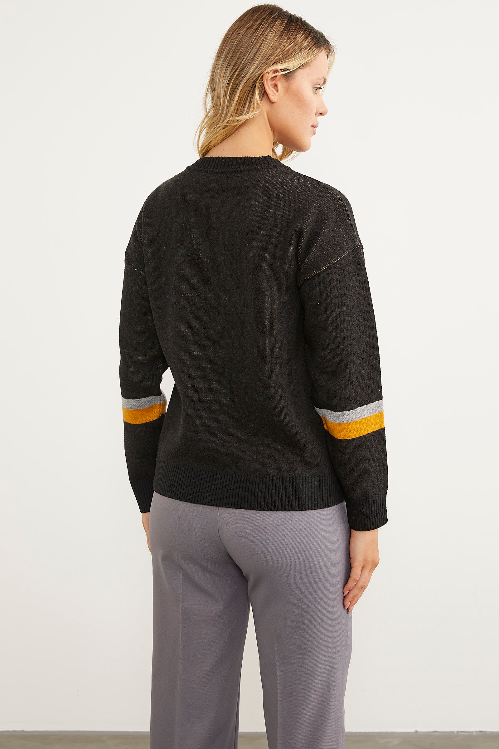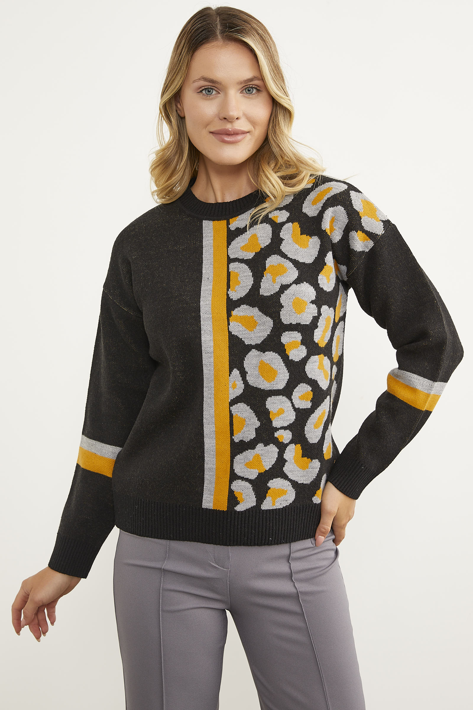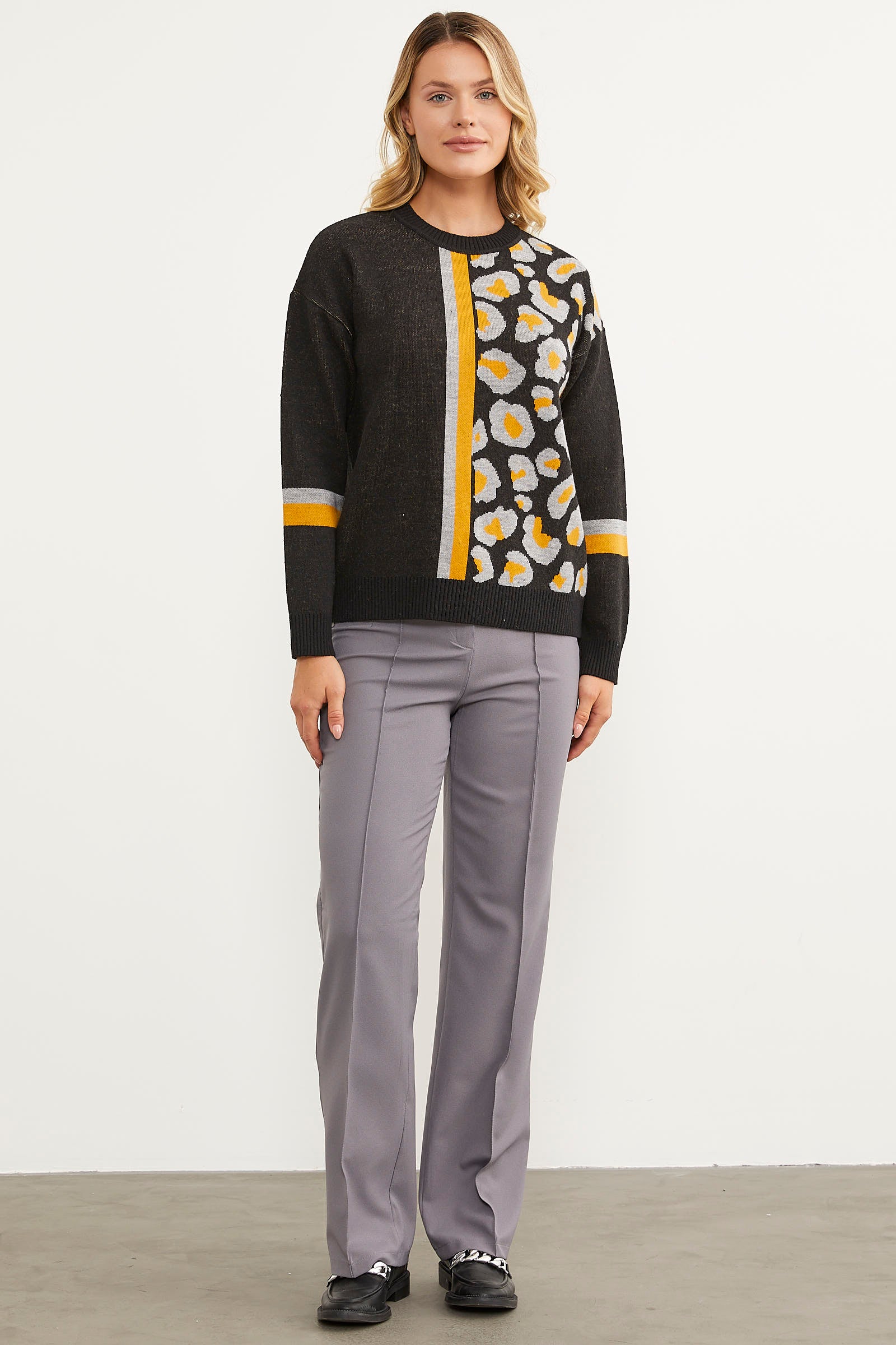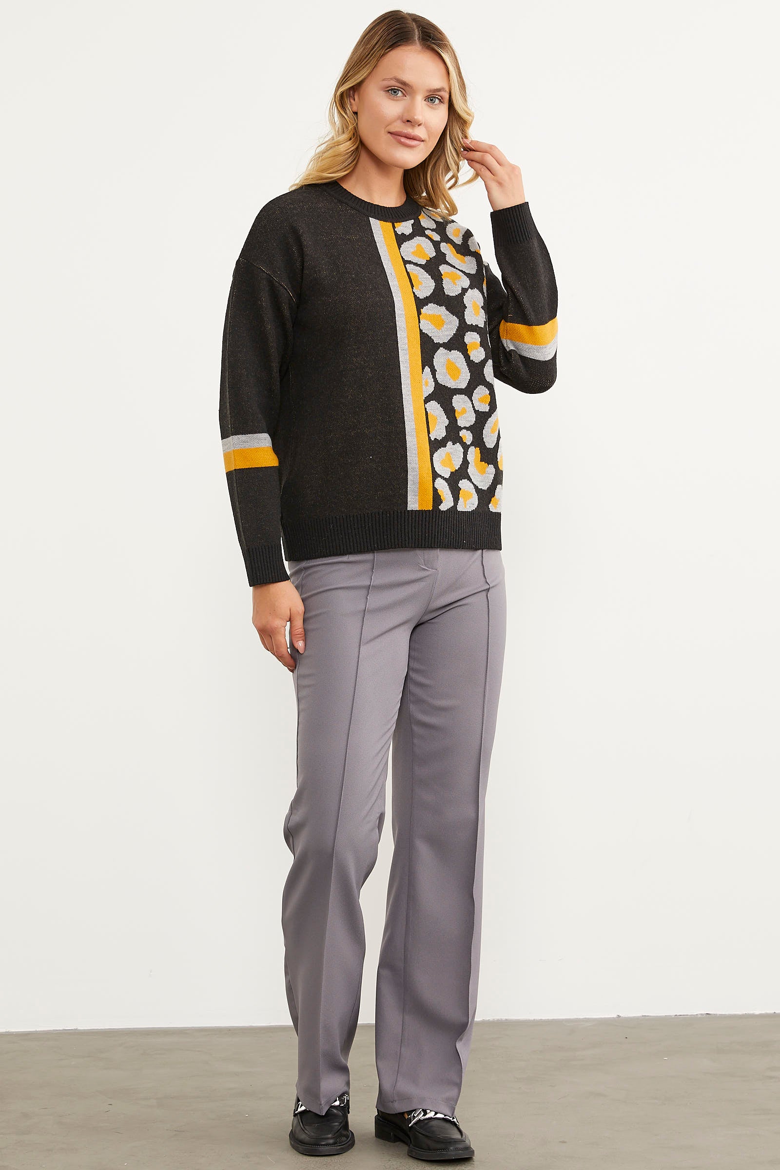 Renkli Leopar Kombinli Triko Kazak - Siyah