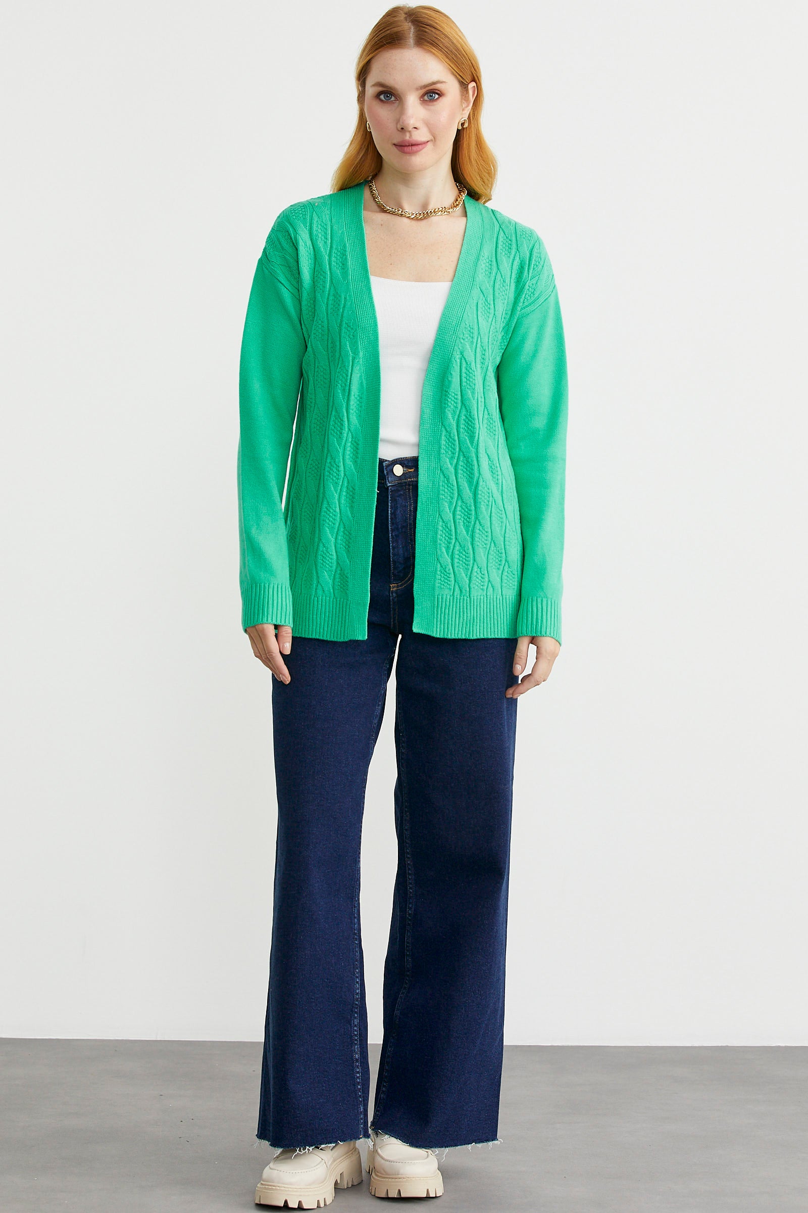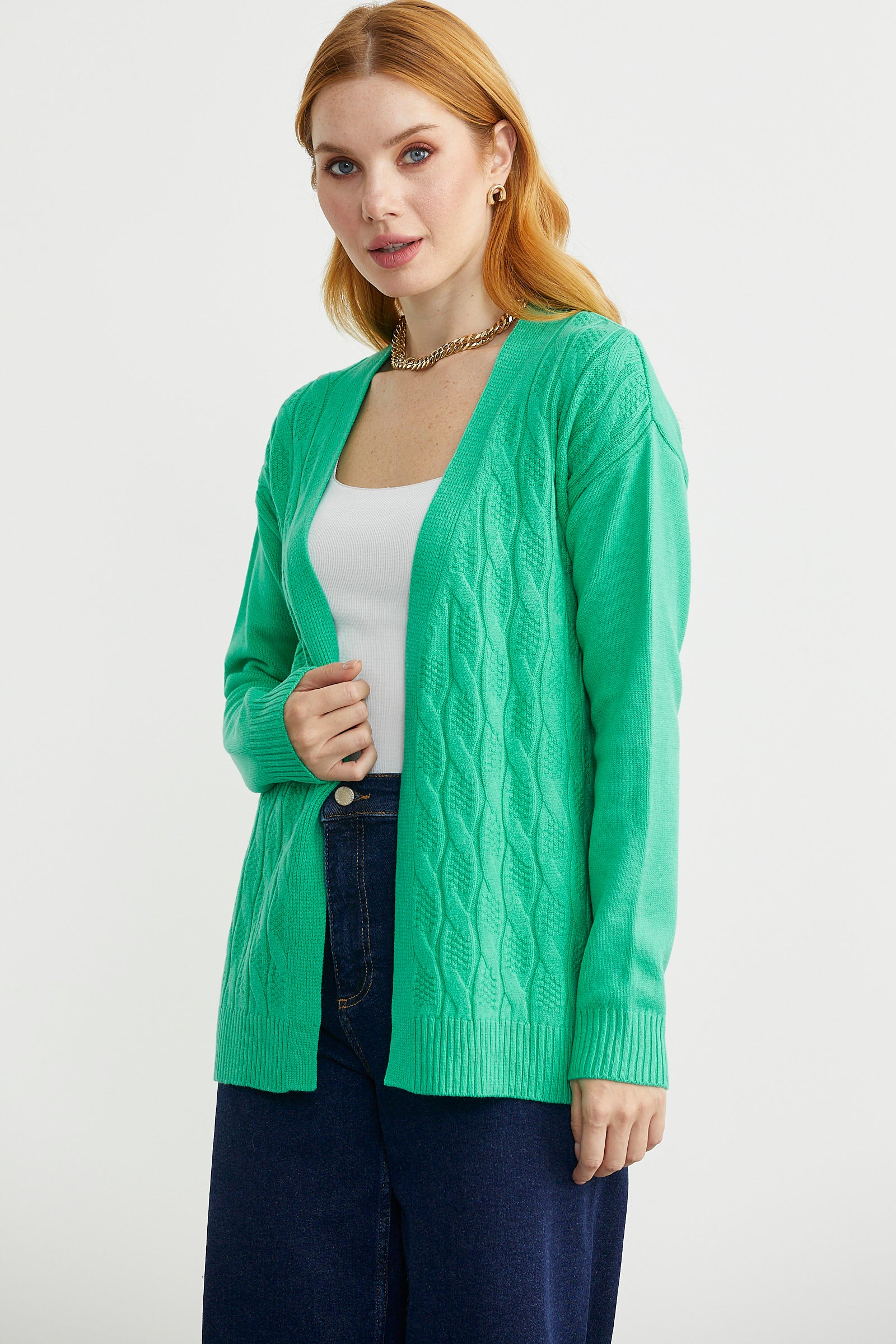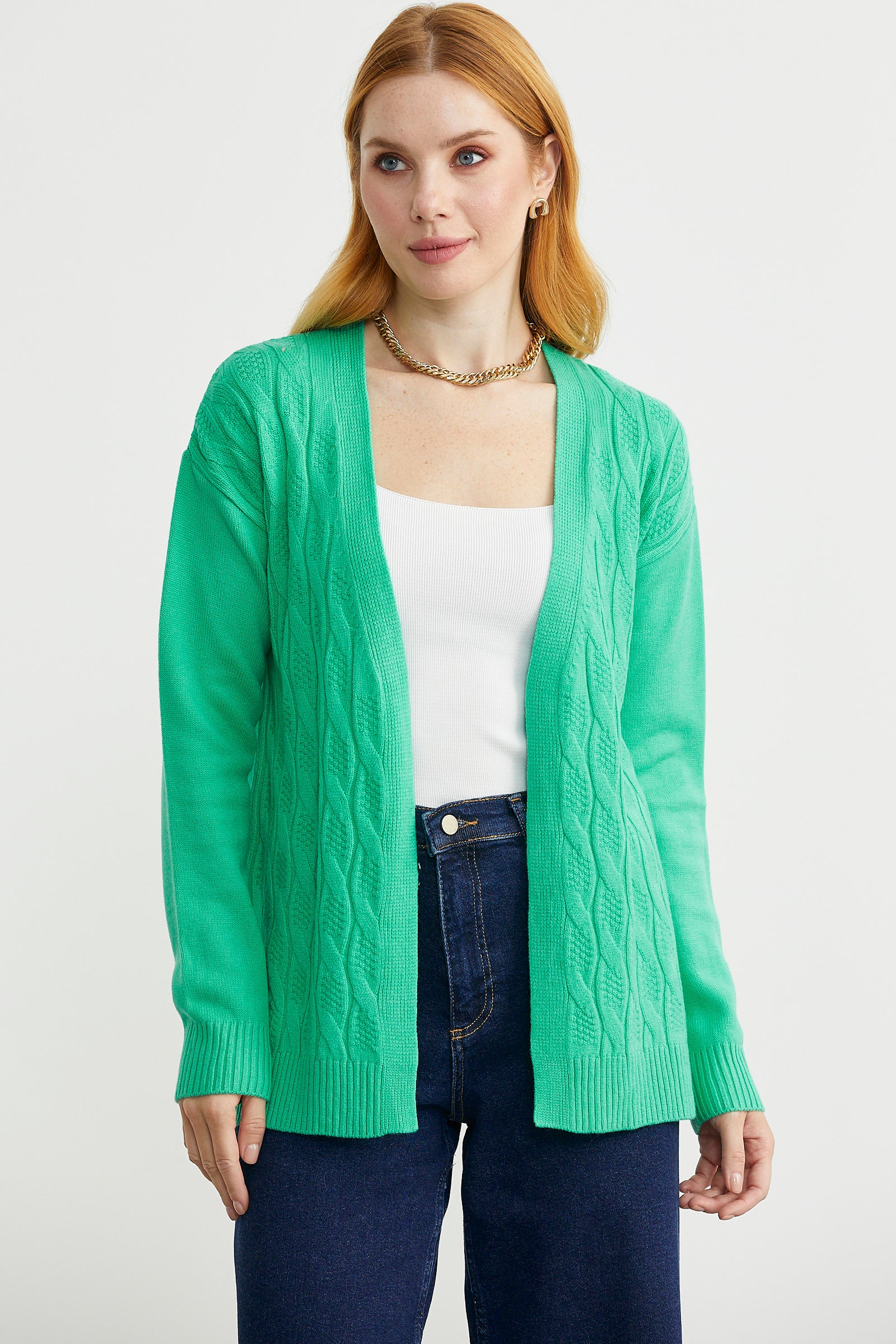 Saç Örgülü Rahat Kalıp Triko Hırka - Yeşil