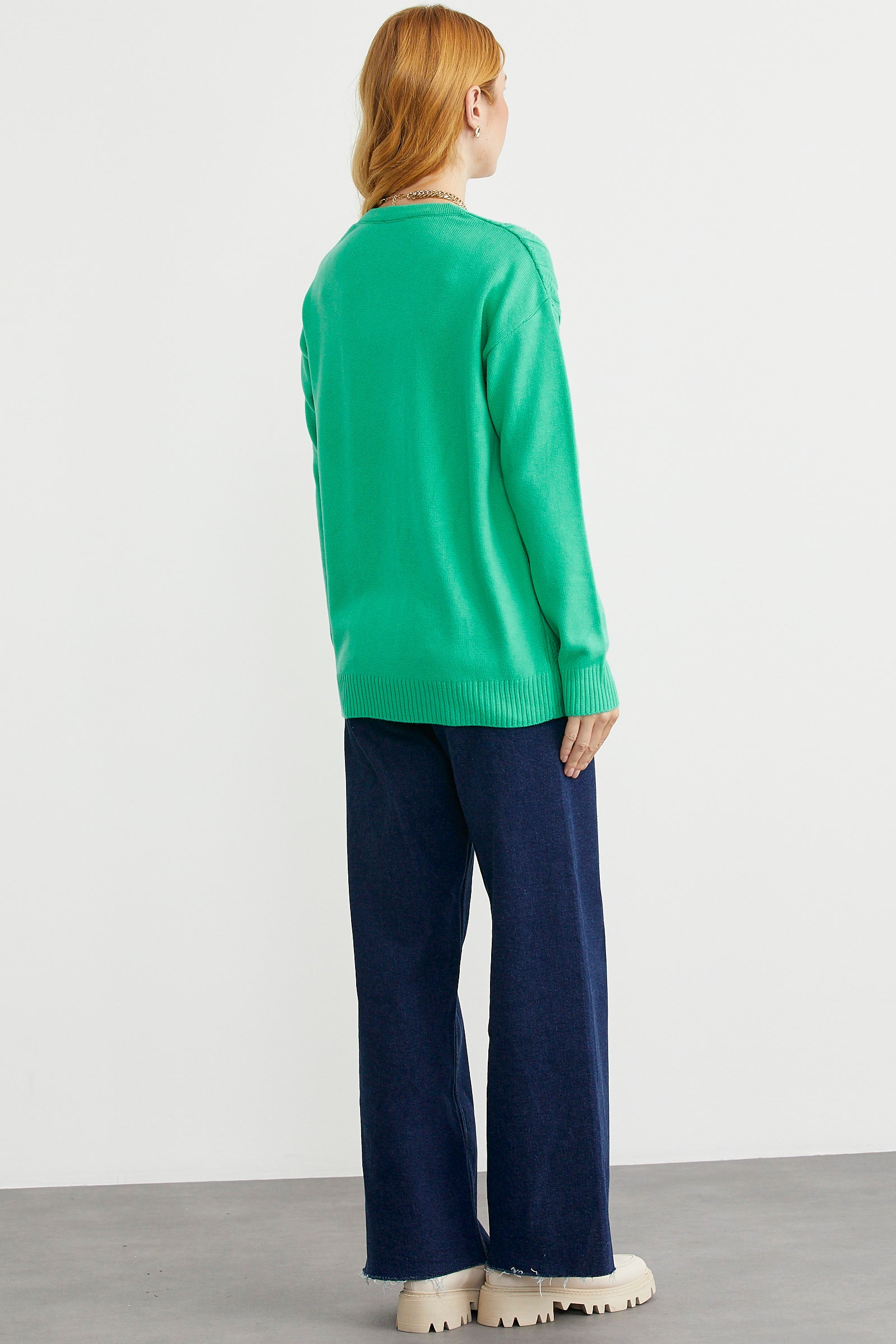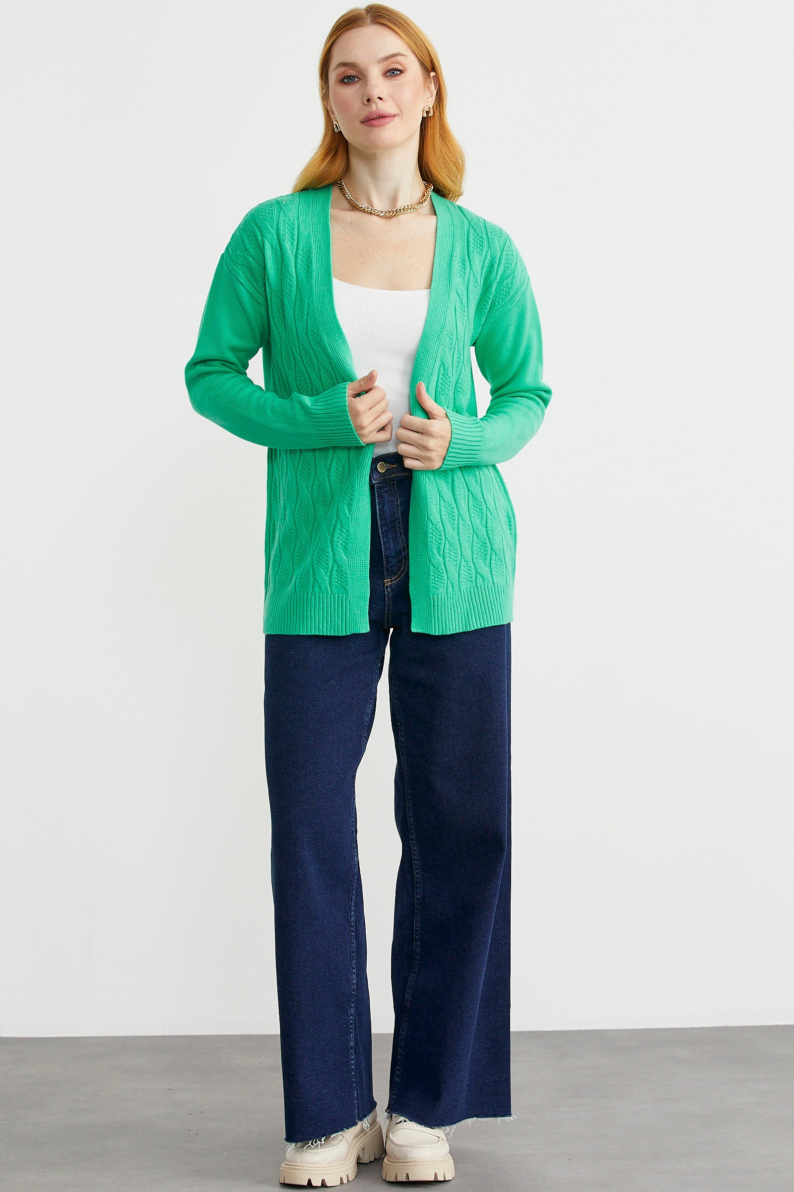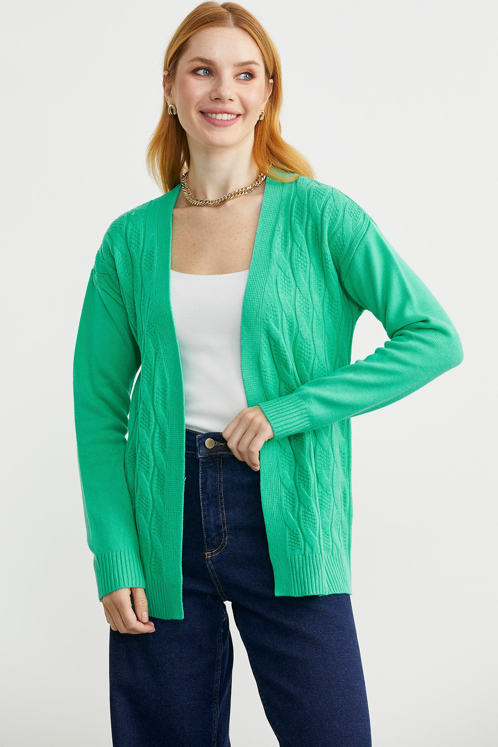 Saç Örgülü Rahat Kalıp Triko Hırka - Yeşil