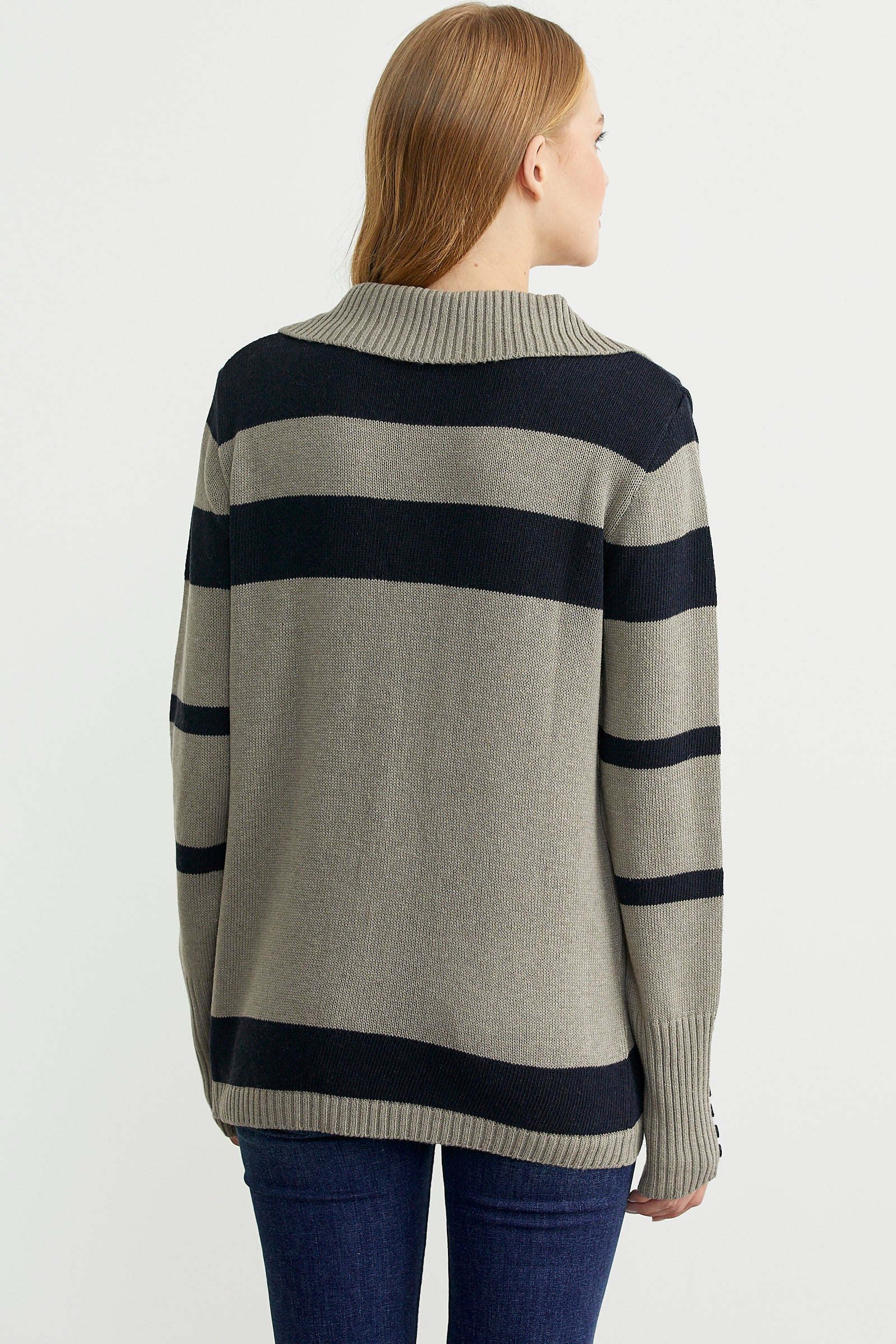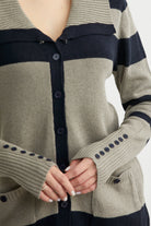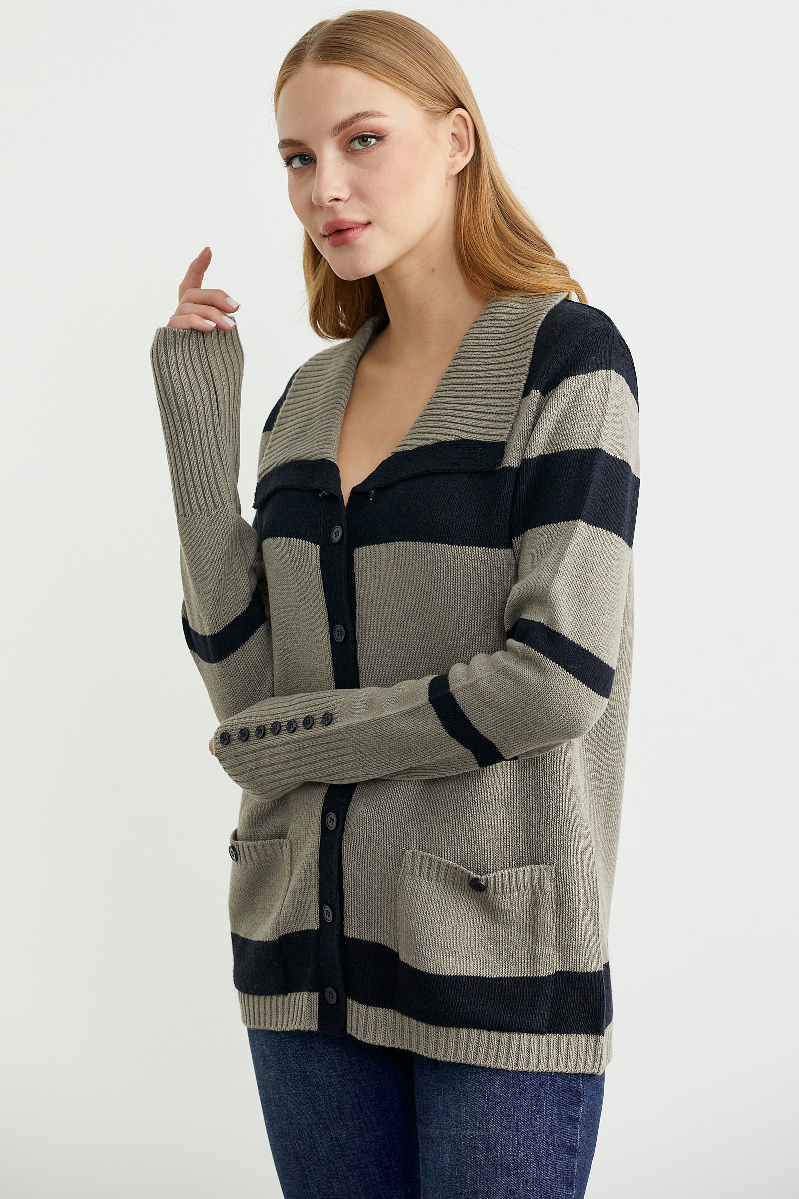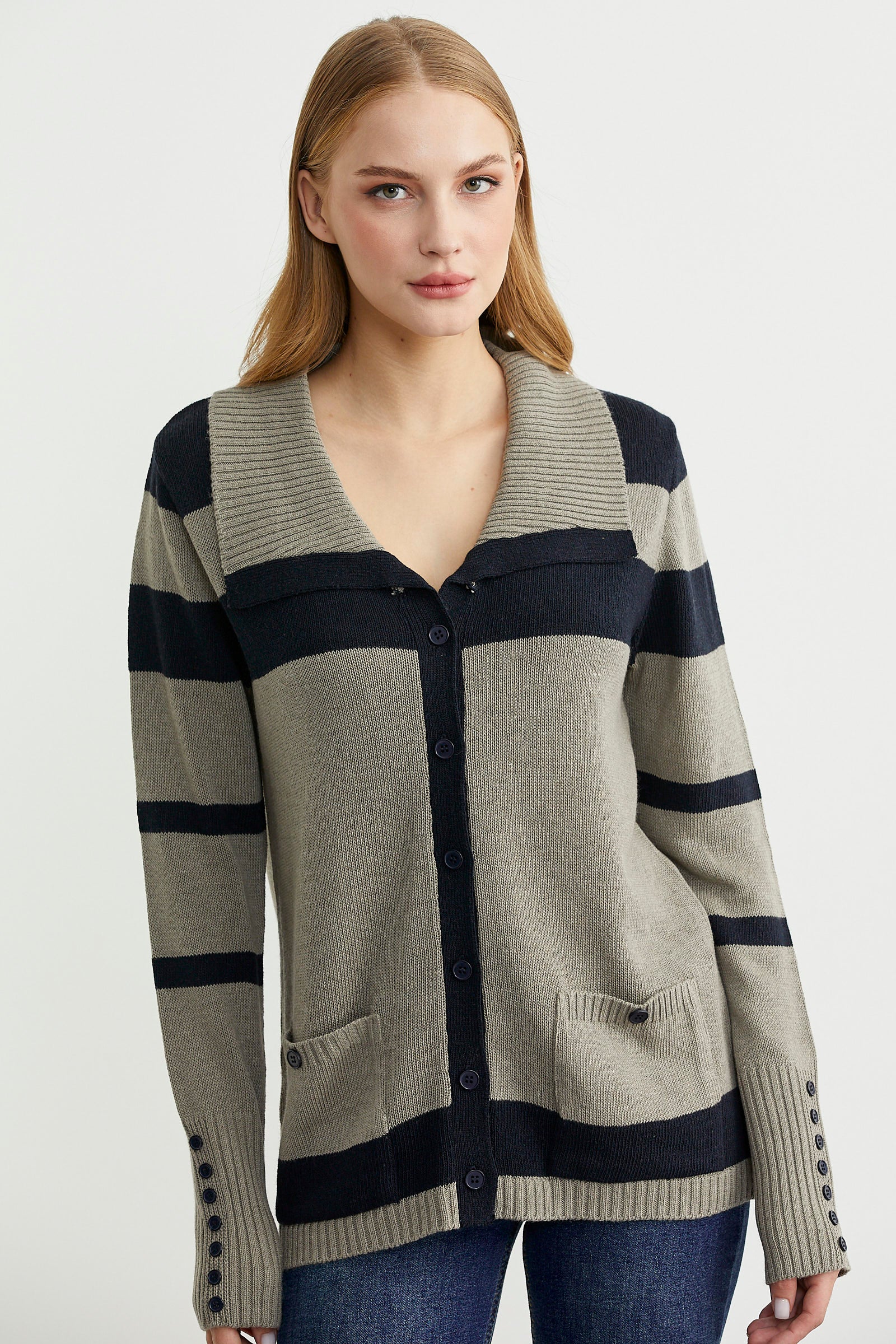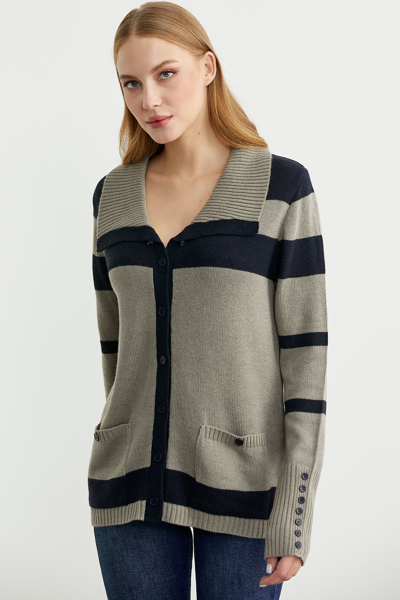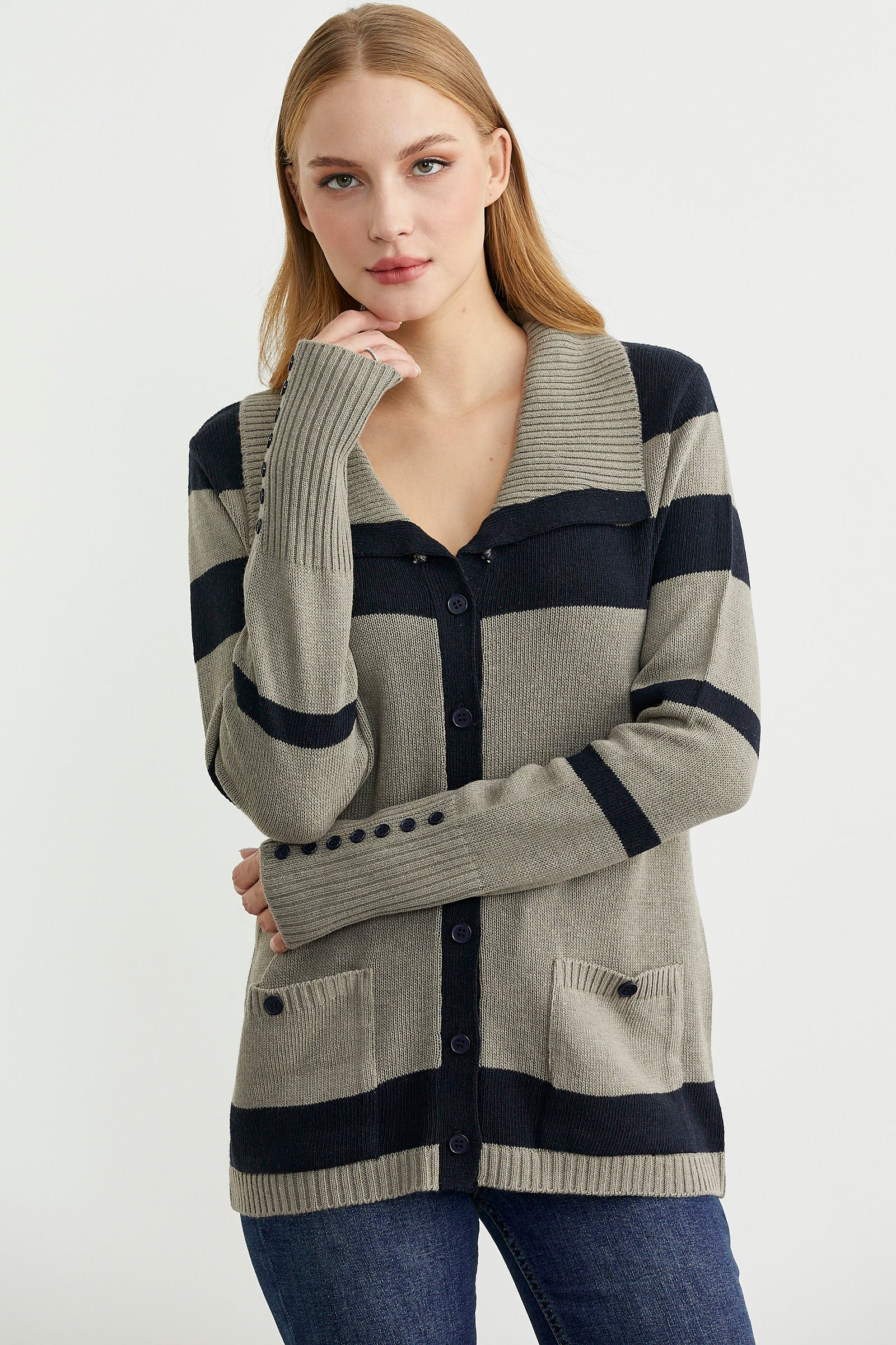 Geniş şal yaka , rahat kalıp, çizgili triko hırka. Düğme kapamalı ve cepli model. Kol manşetleri geniş lastik örgülü.