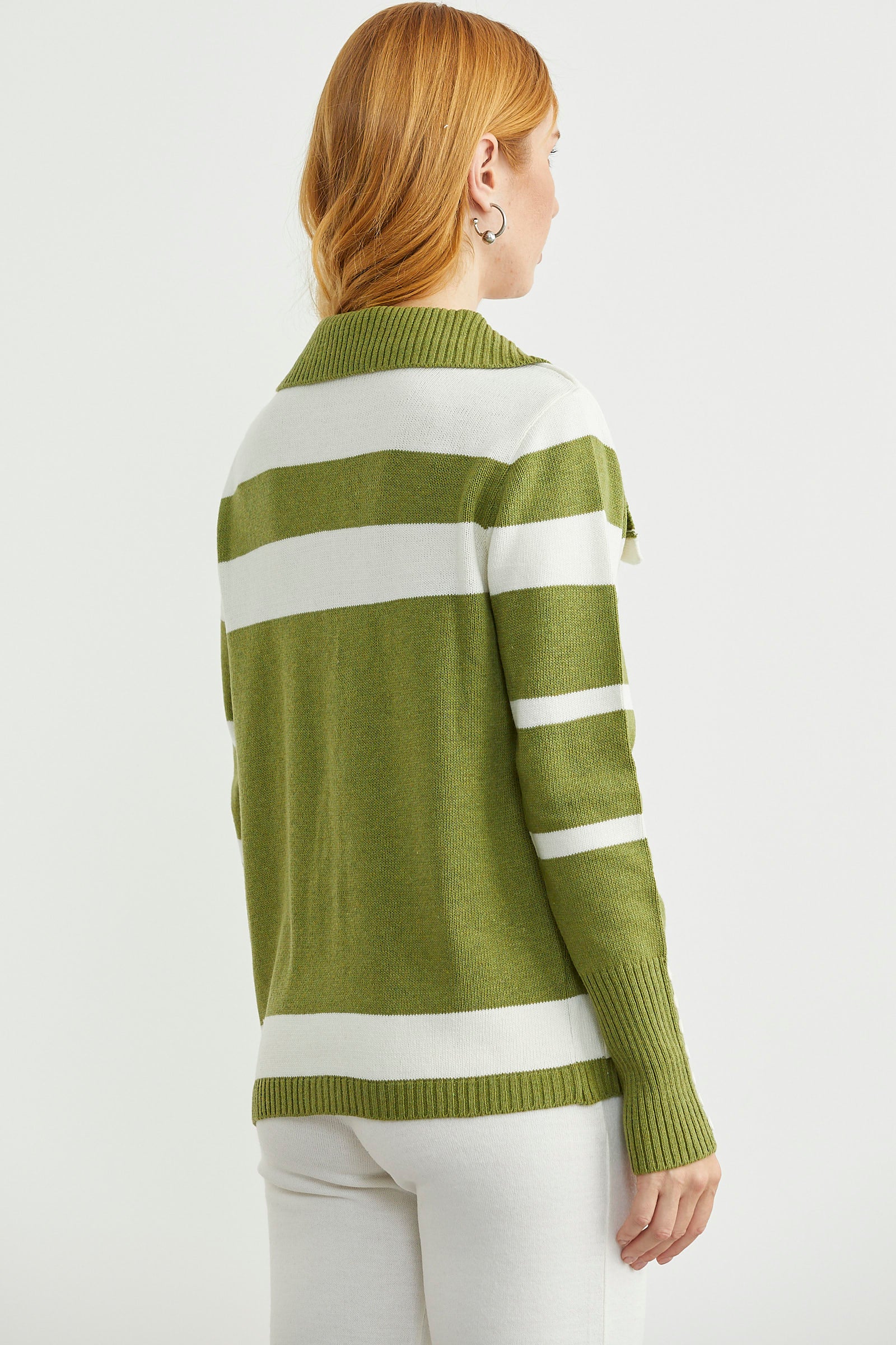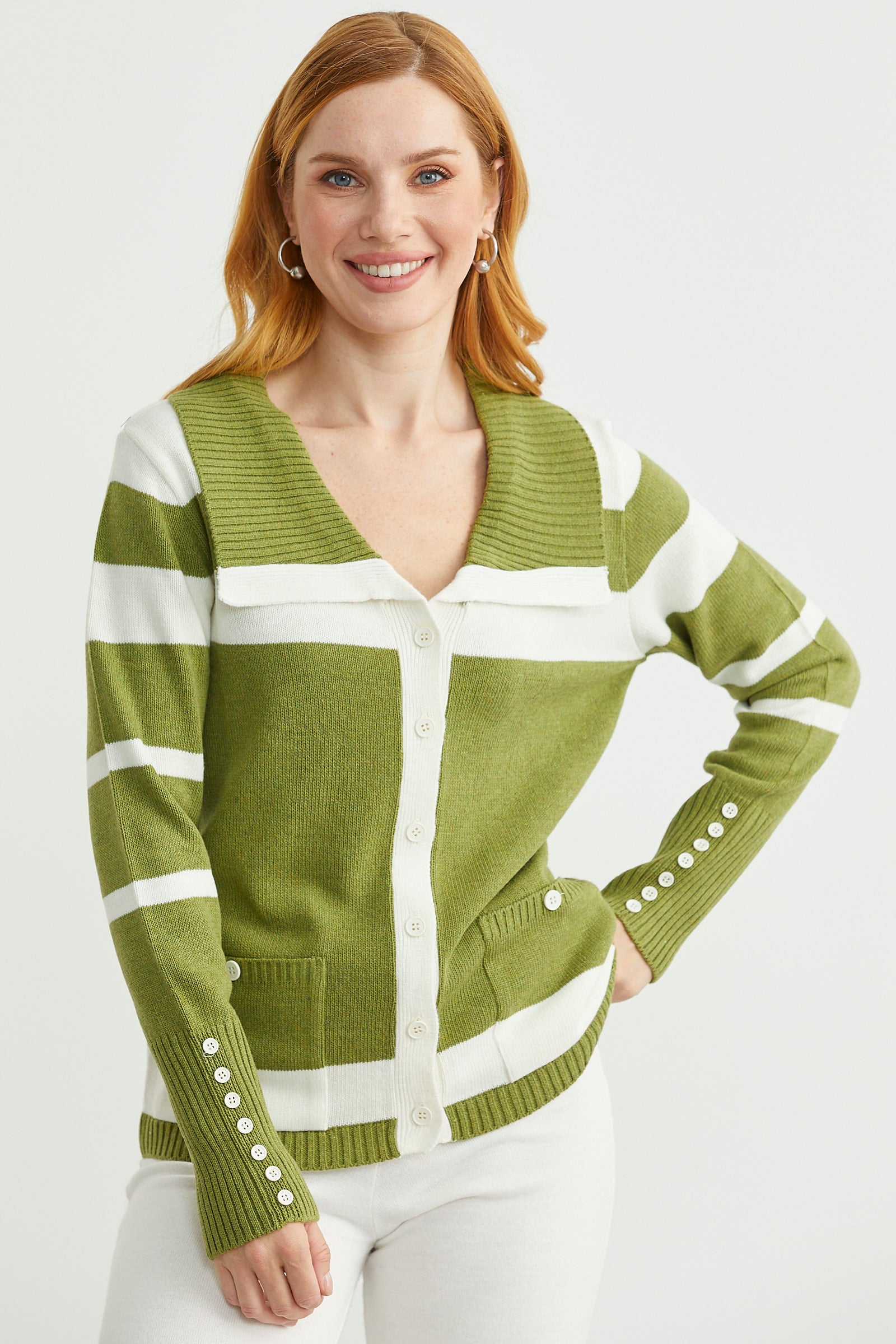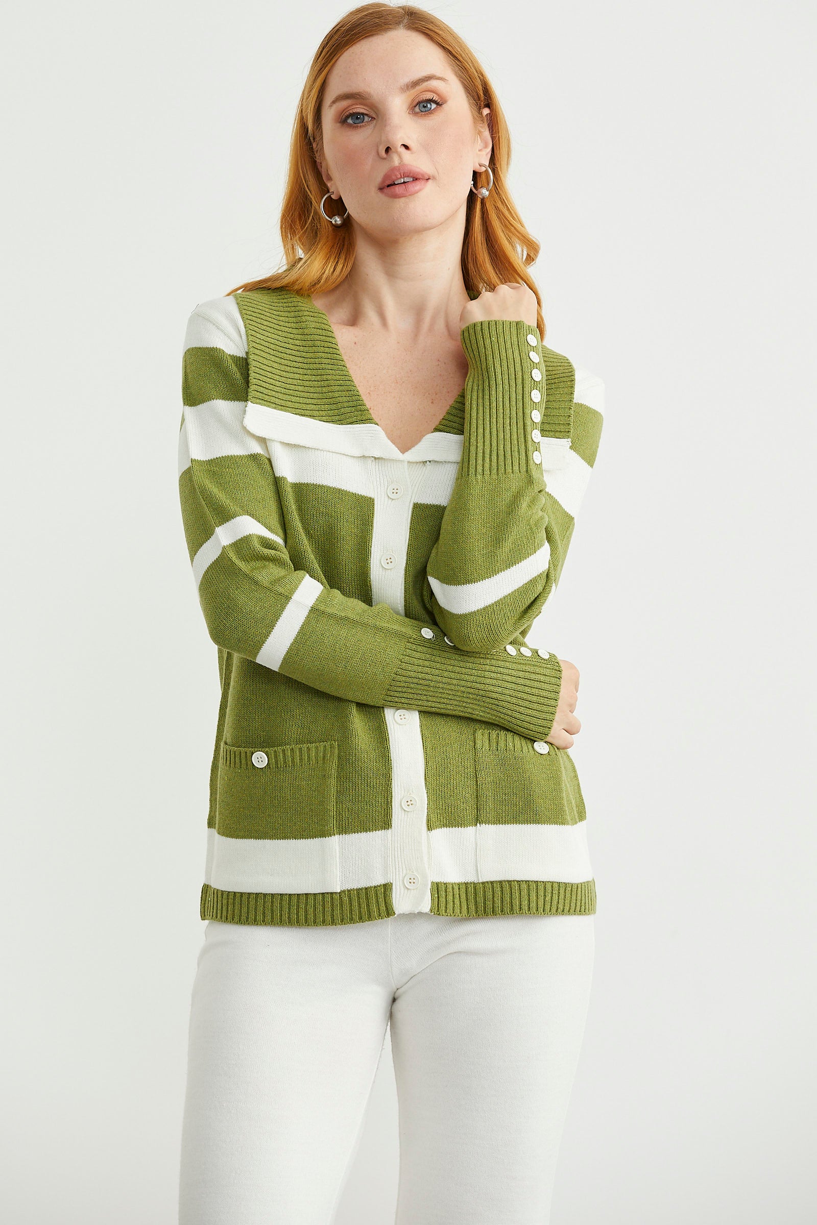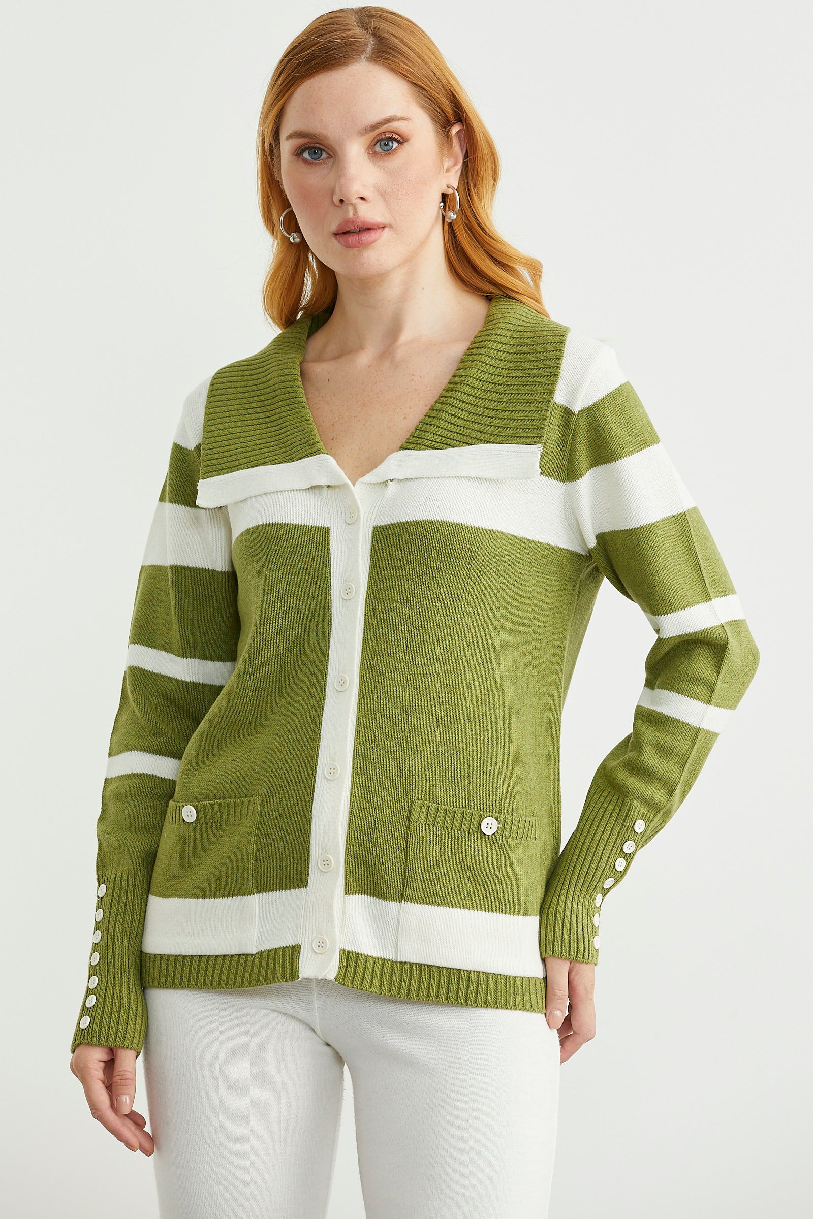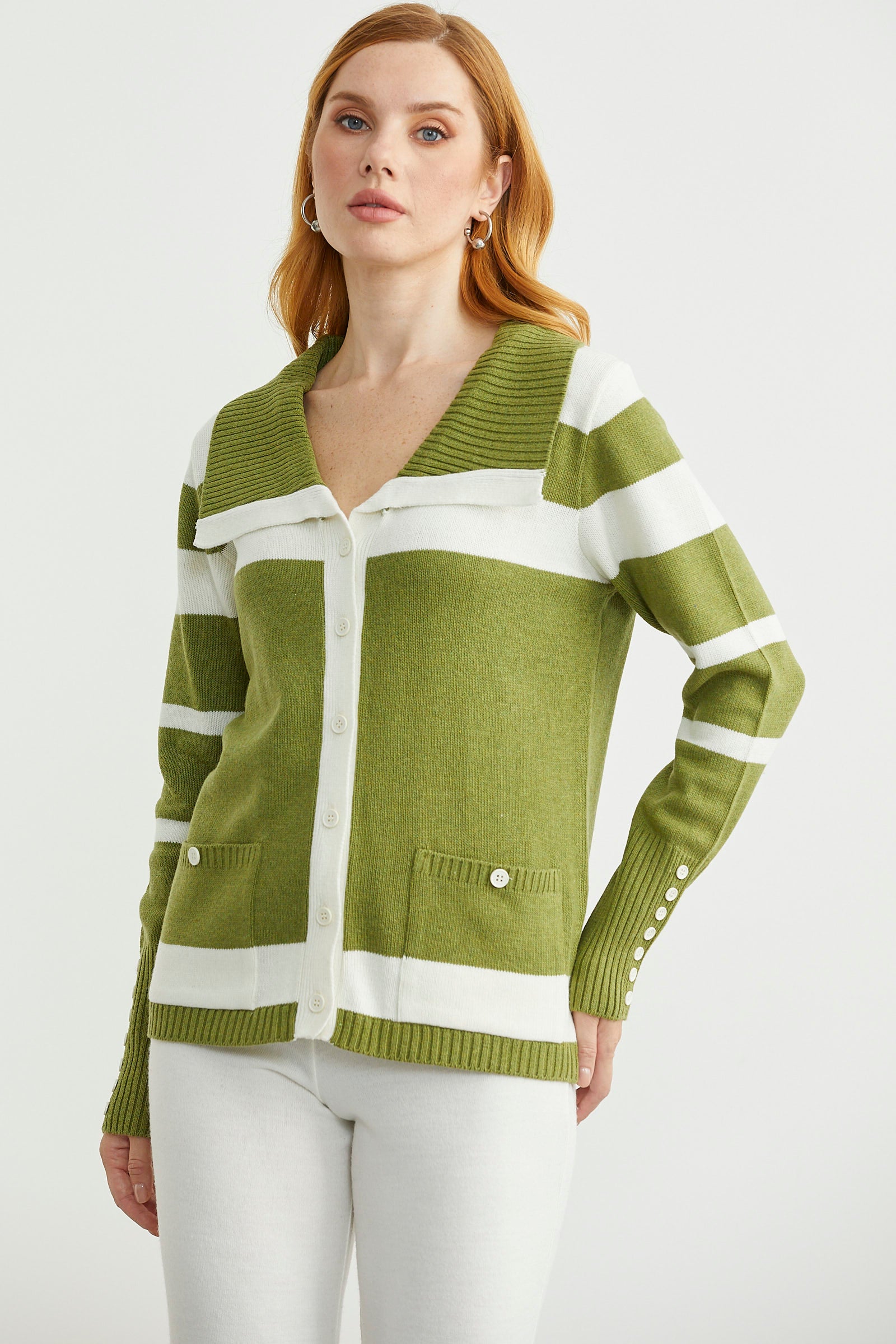 Geniş şal yaka , rahat kalıp, çizgili triko hırka. Düğme kapamalı ve cepli model. Kol manşetleri geniş lastik örgülü.