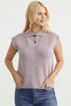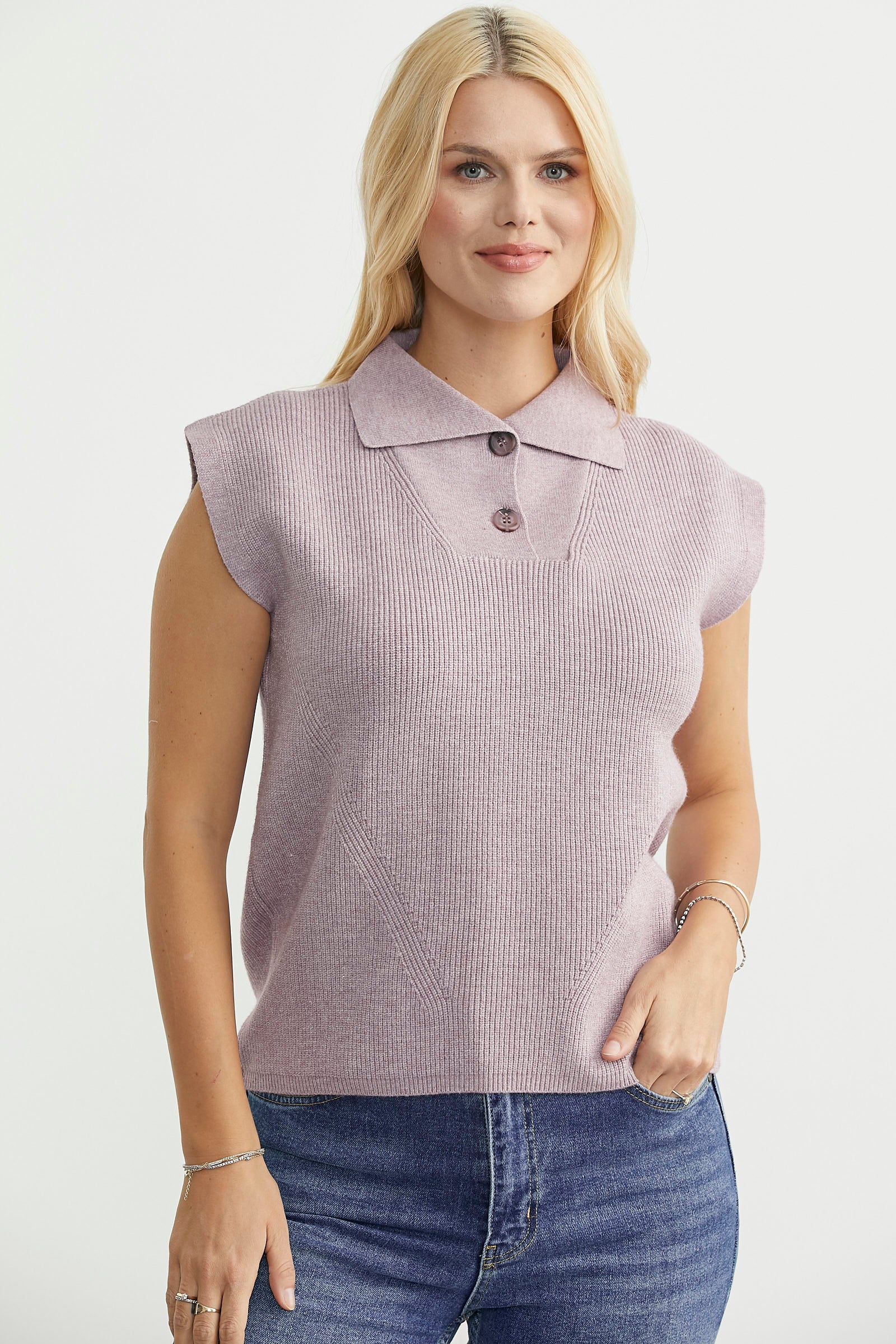 Devrik yaka, üstte düğme detaylı fitilli triko kazak. Kolsuz, rahat kalıp.