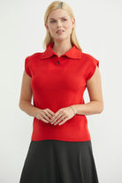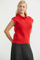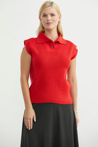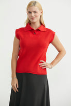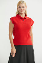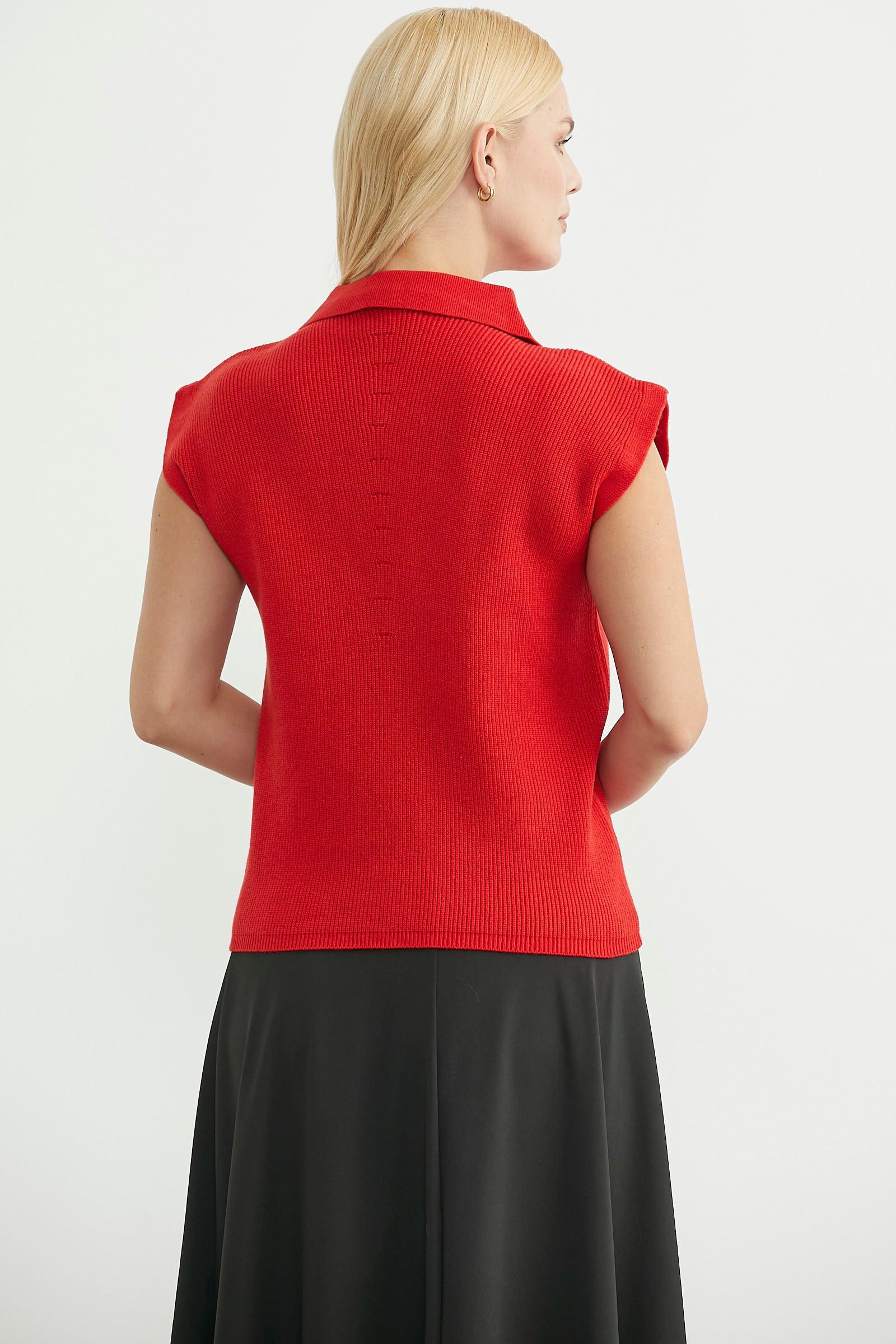 Devrik yaka, üstte düğme detaylı fitilli triko kazak. Kolsuz, rahat kalıp.