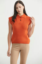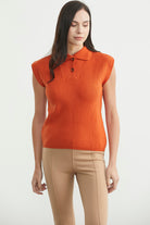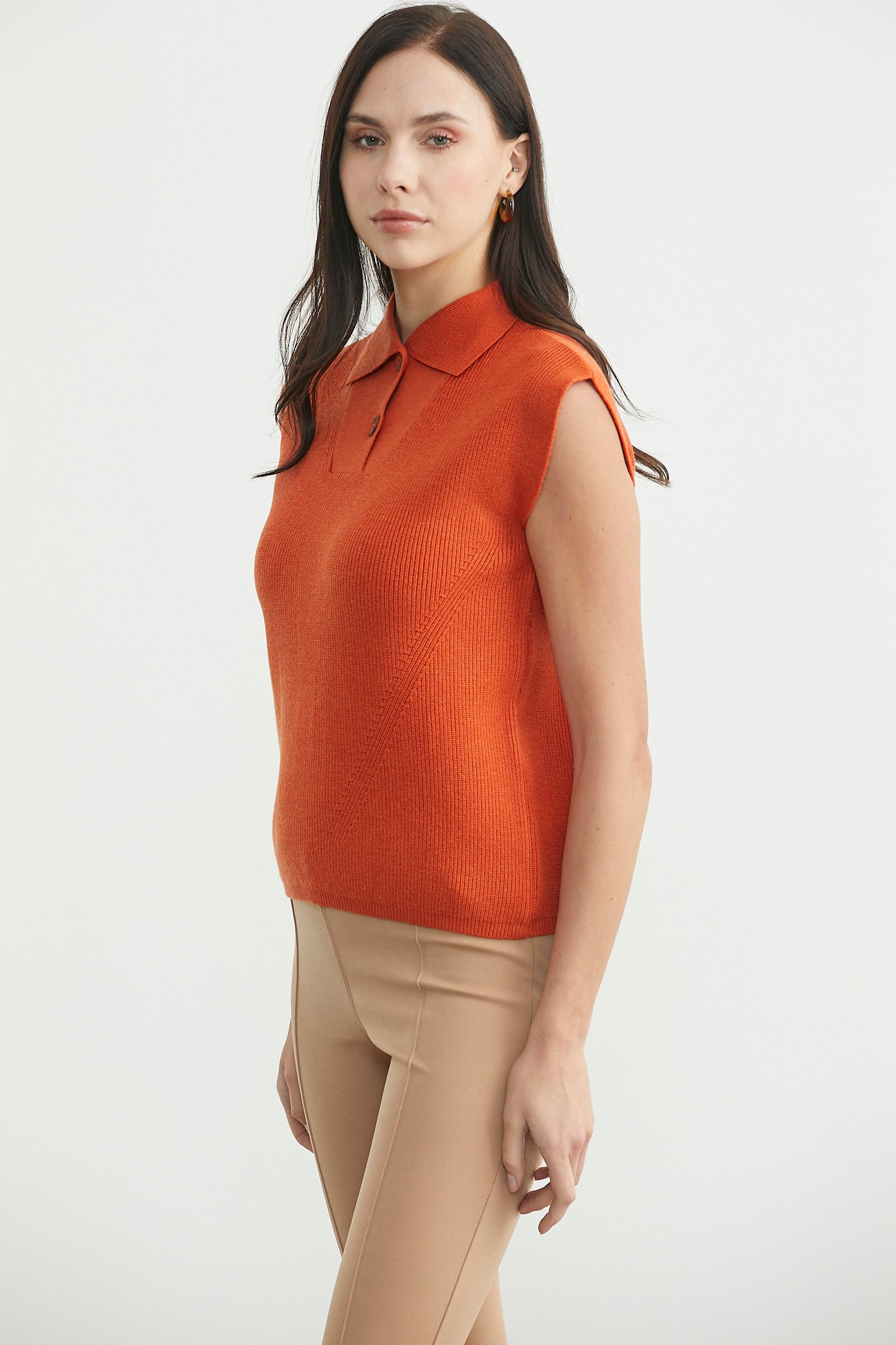 Devrik yaka, üstte düğme detaylı fitilli triko kazak. Kolsuz, rahat kalıp.