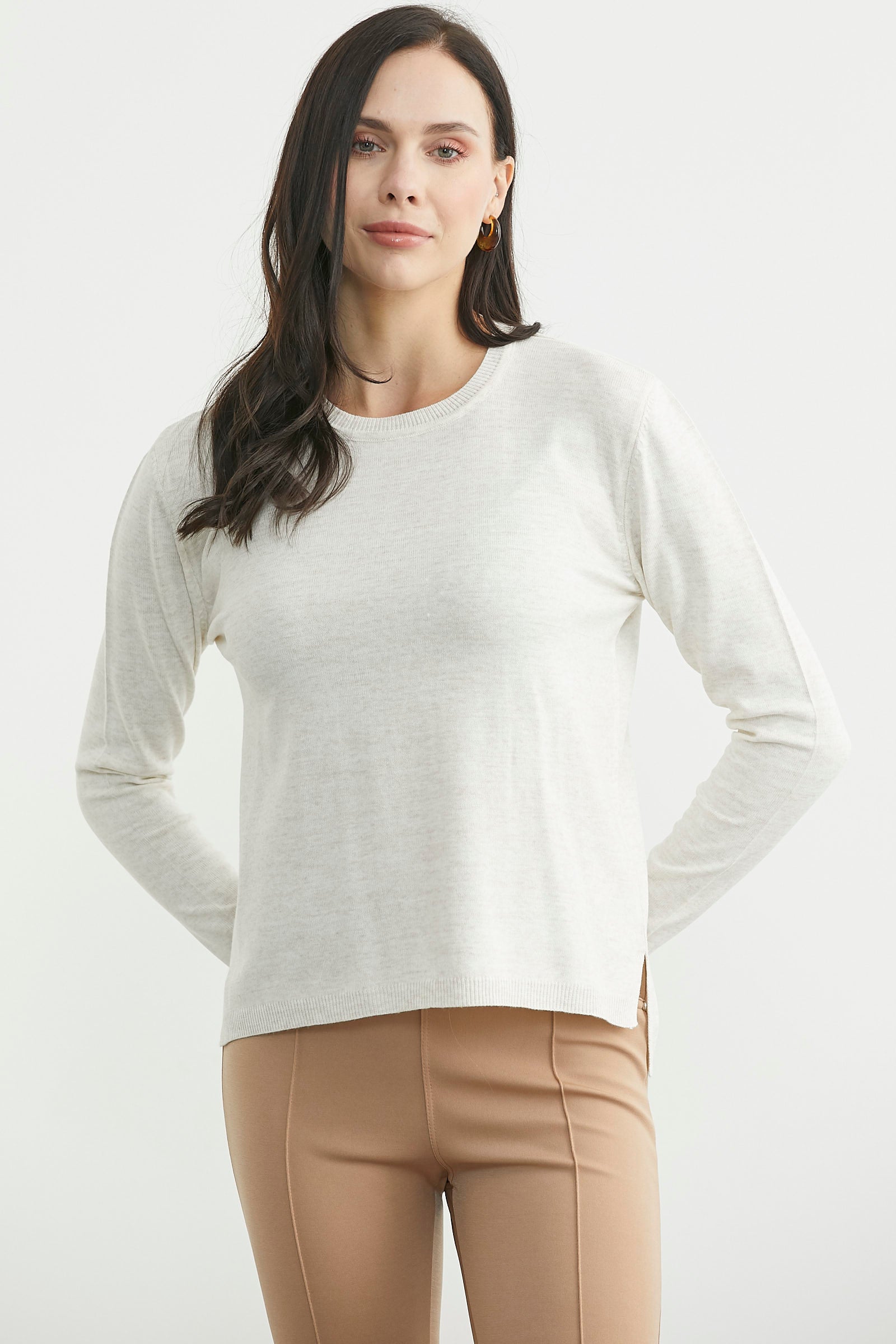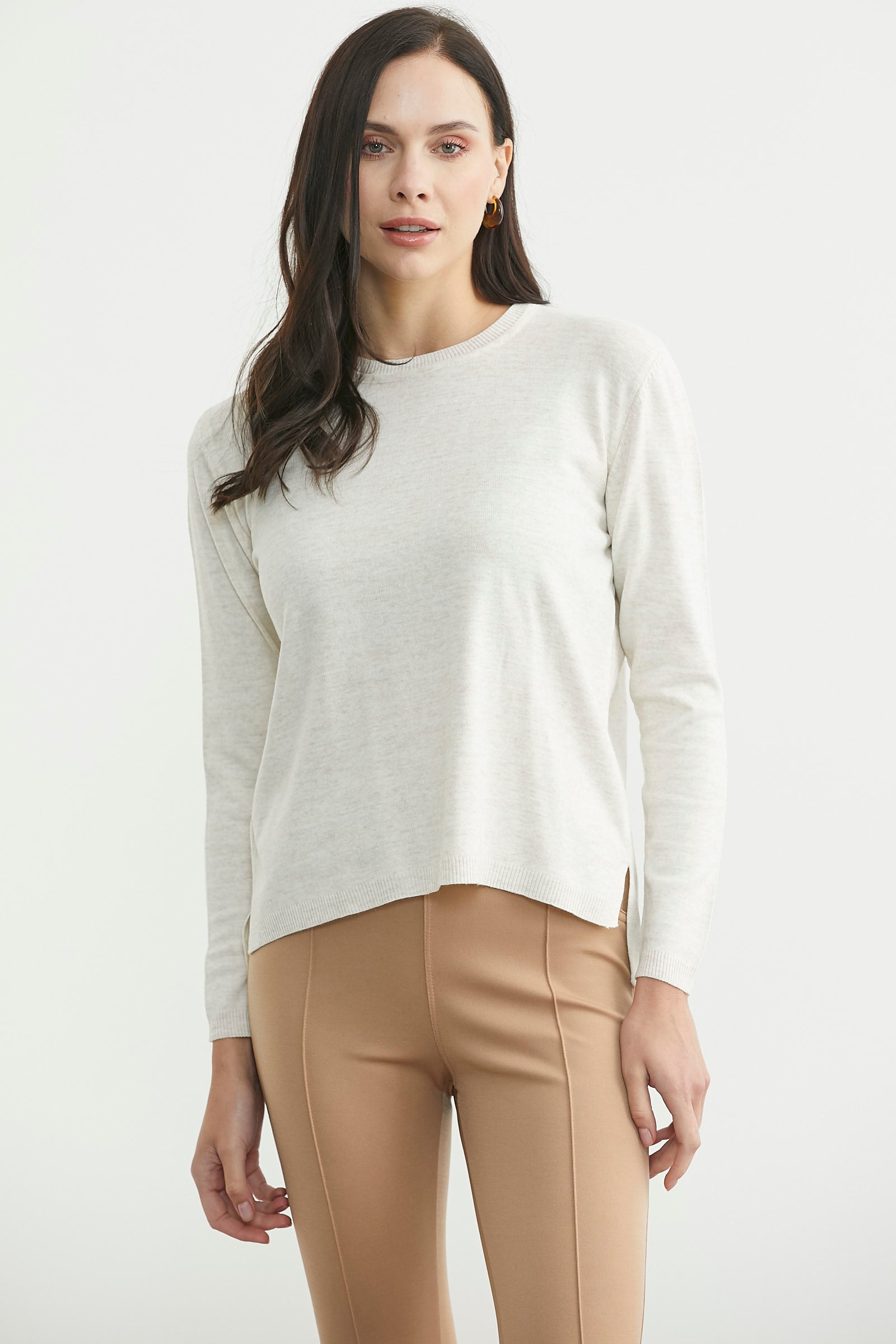 Yuvarlak yaka, arkası uzun, yanı yırtmaçlı, basic triko kazak.