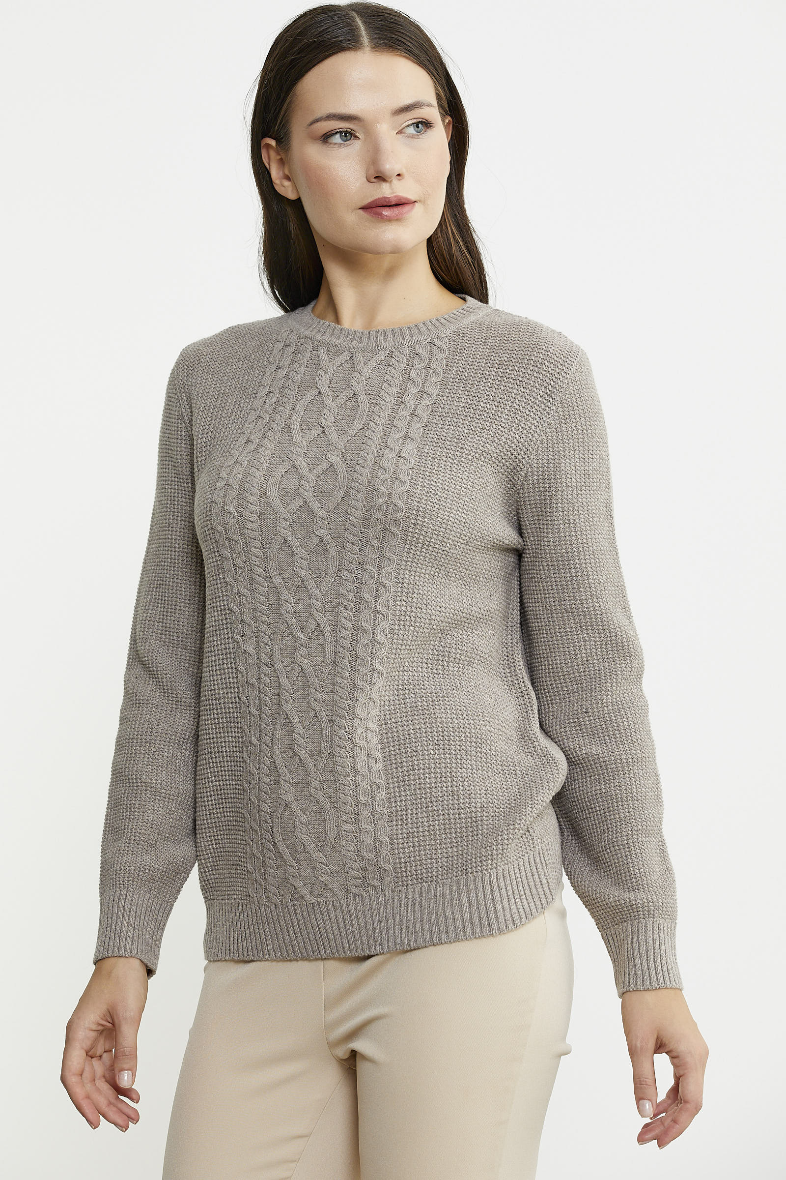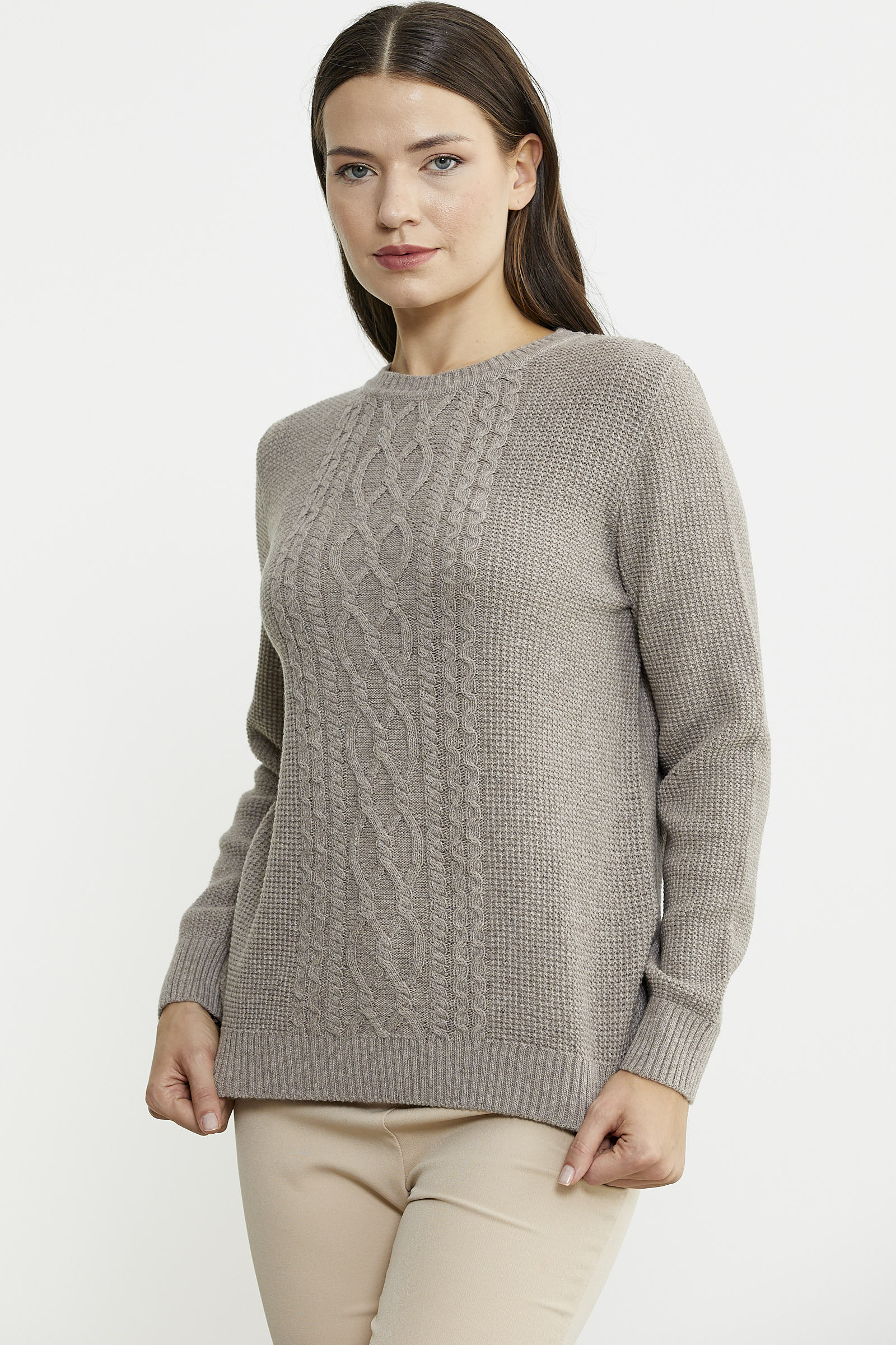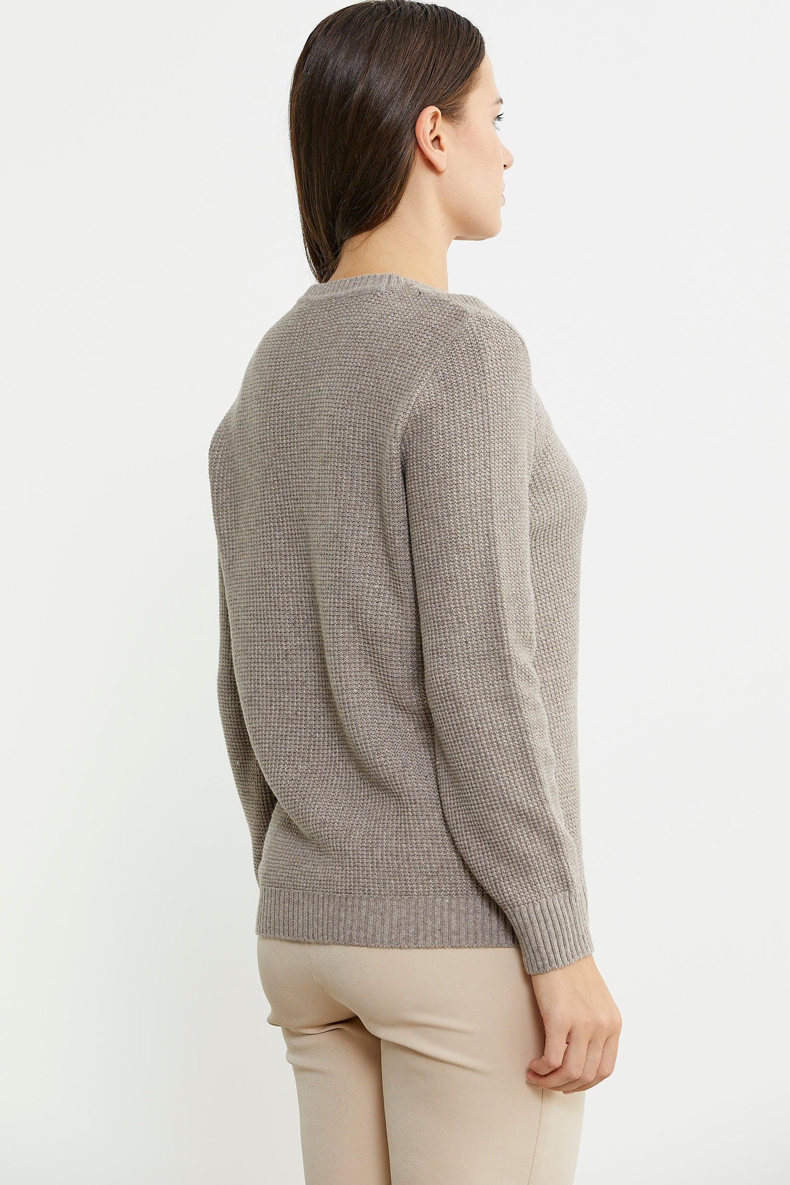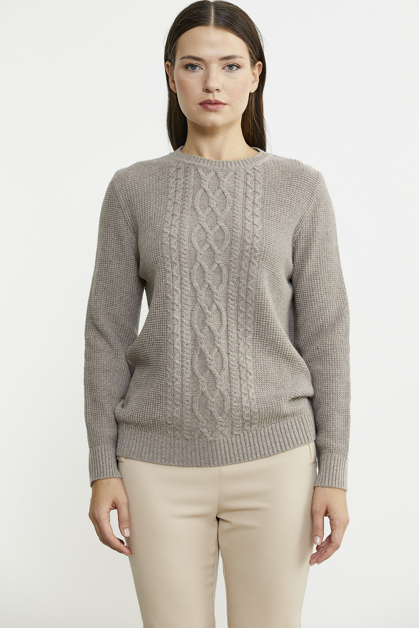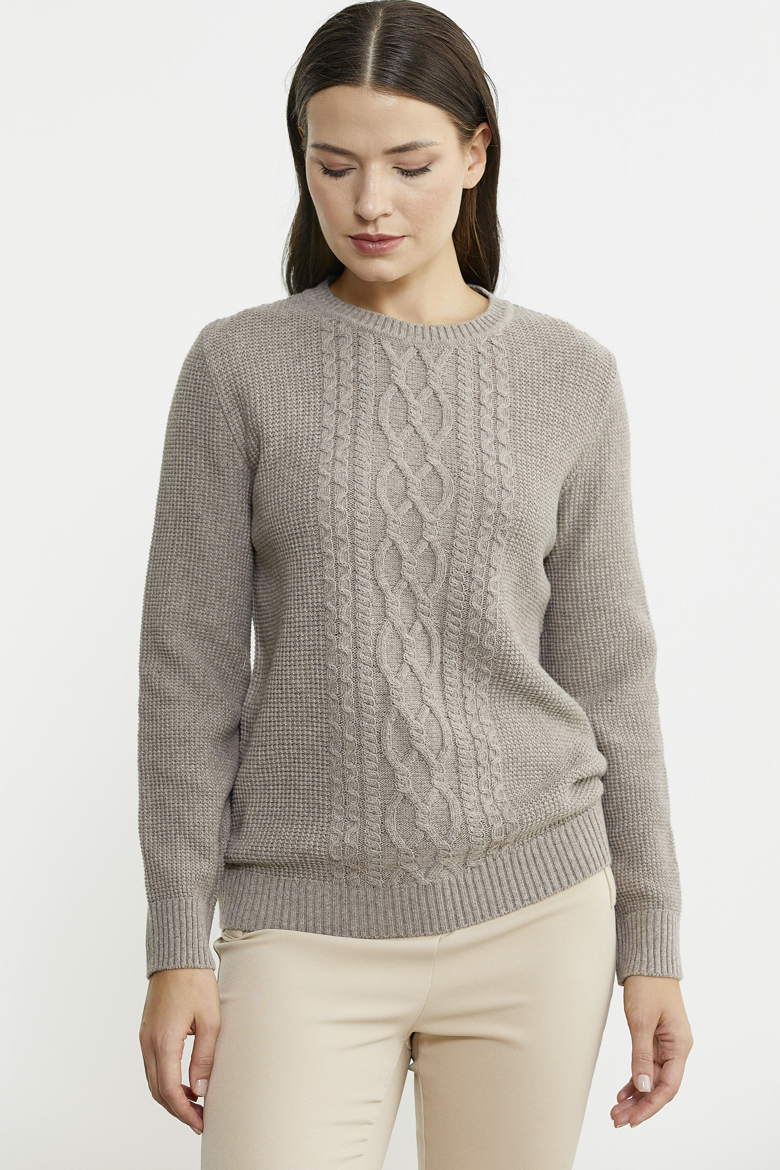 Yüksek oranda yün içerikli ipten, sıfır yaka olarak tasarlanan triko kazak, ön beden kısmında kullanılan motif örgüyle hareketlendirilmiştir.