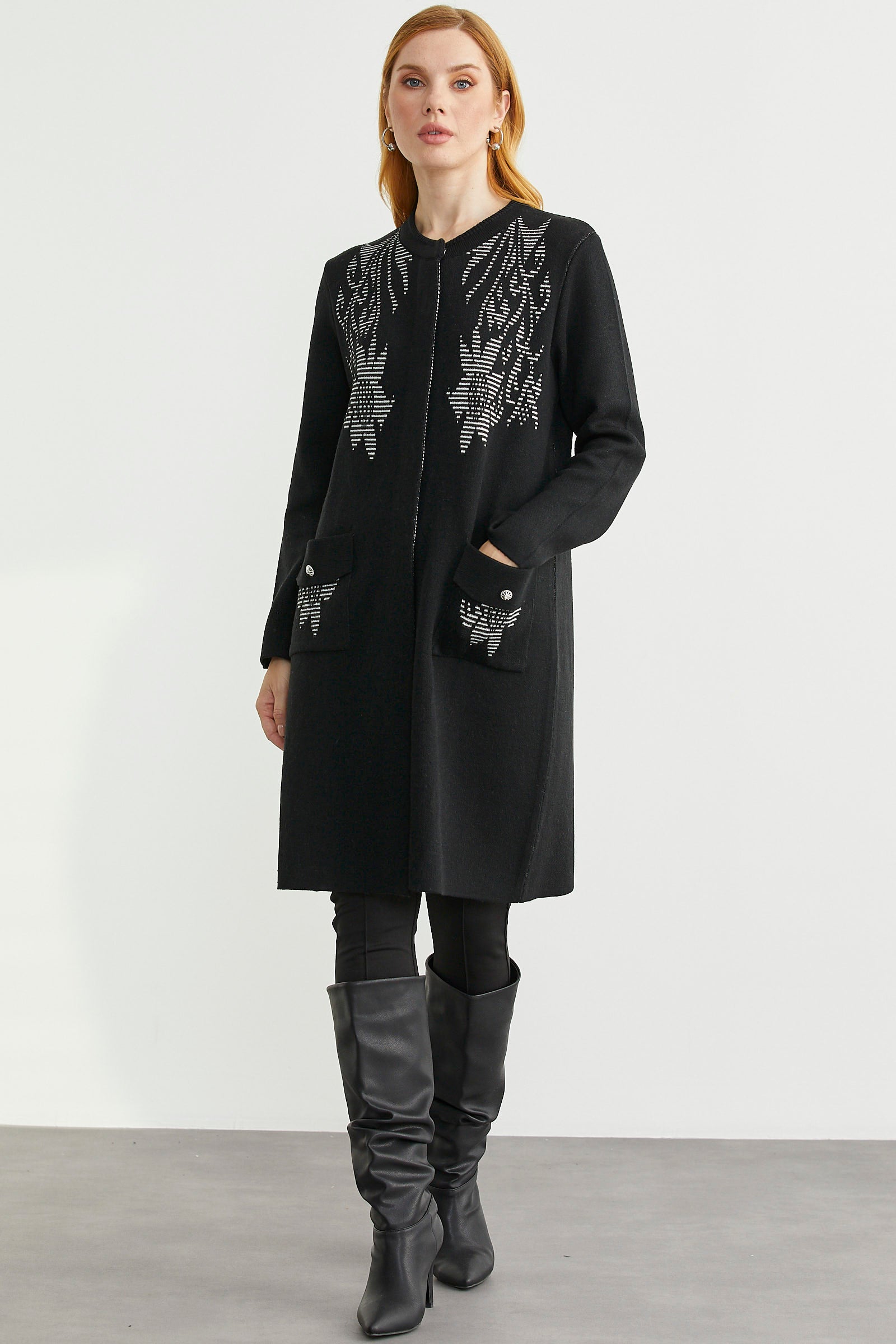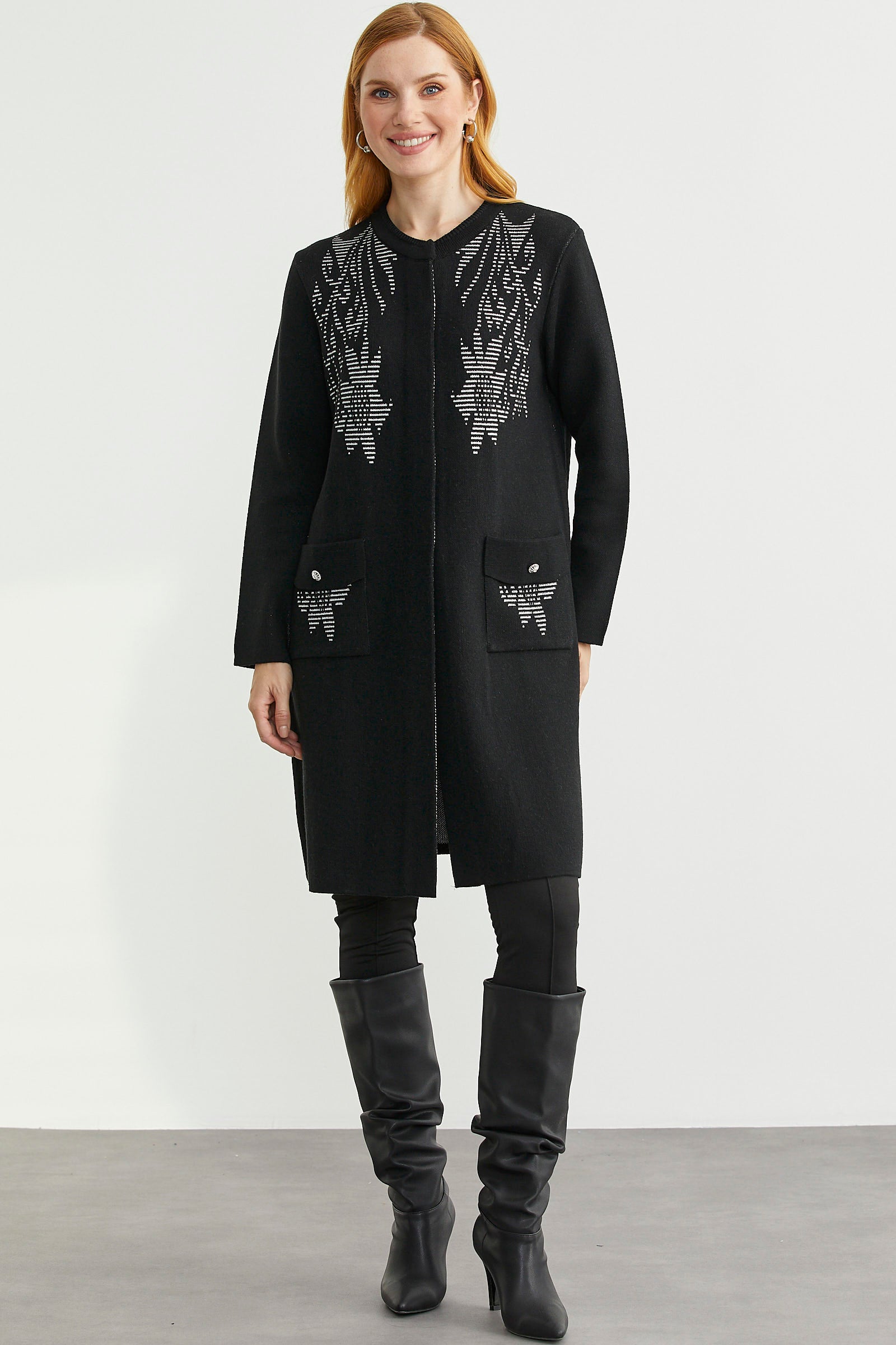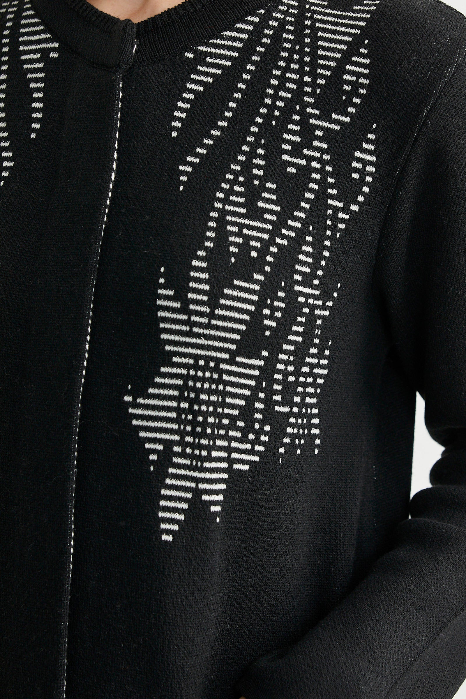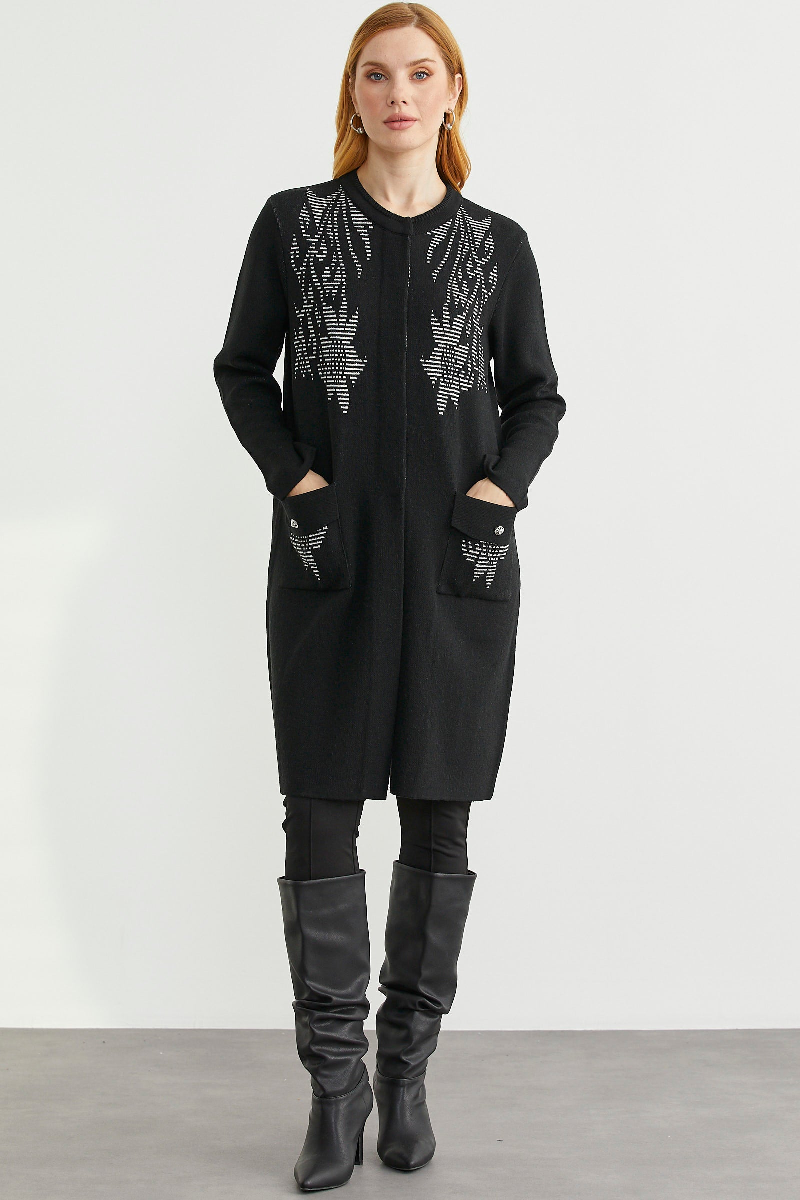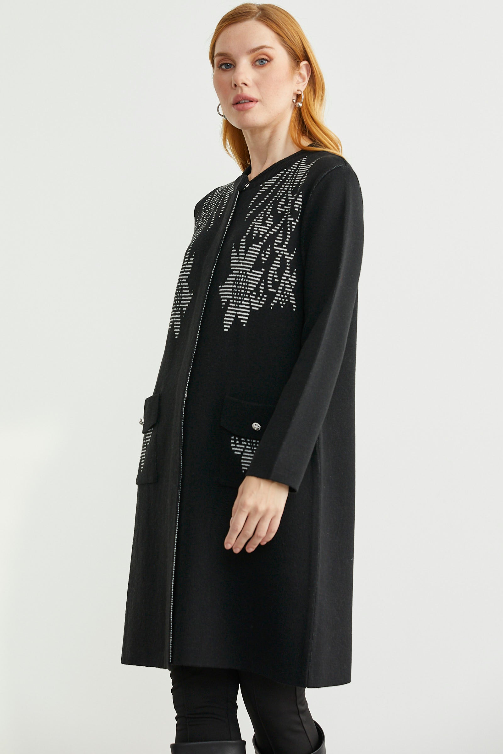 Yüksek oranda yün içeren triko ceket uzun boy olarak üretilmiştir. Desenli ve ceplidir.
