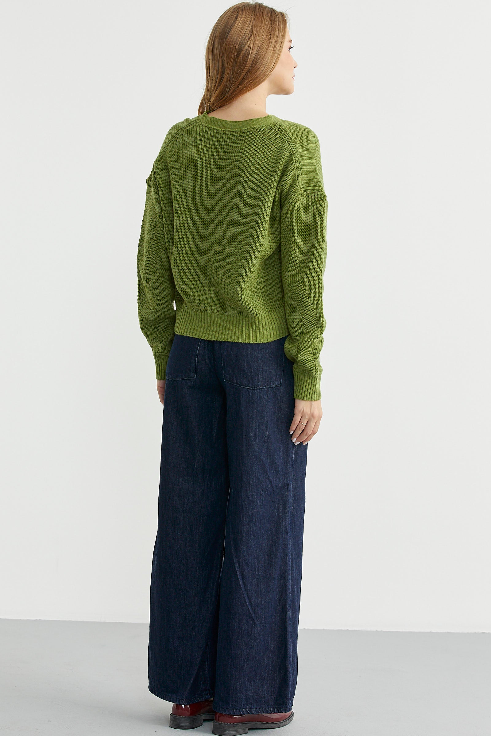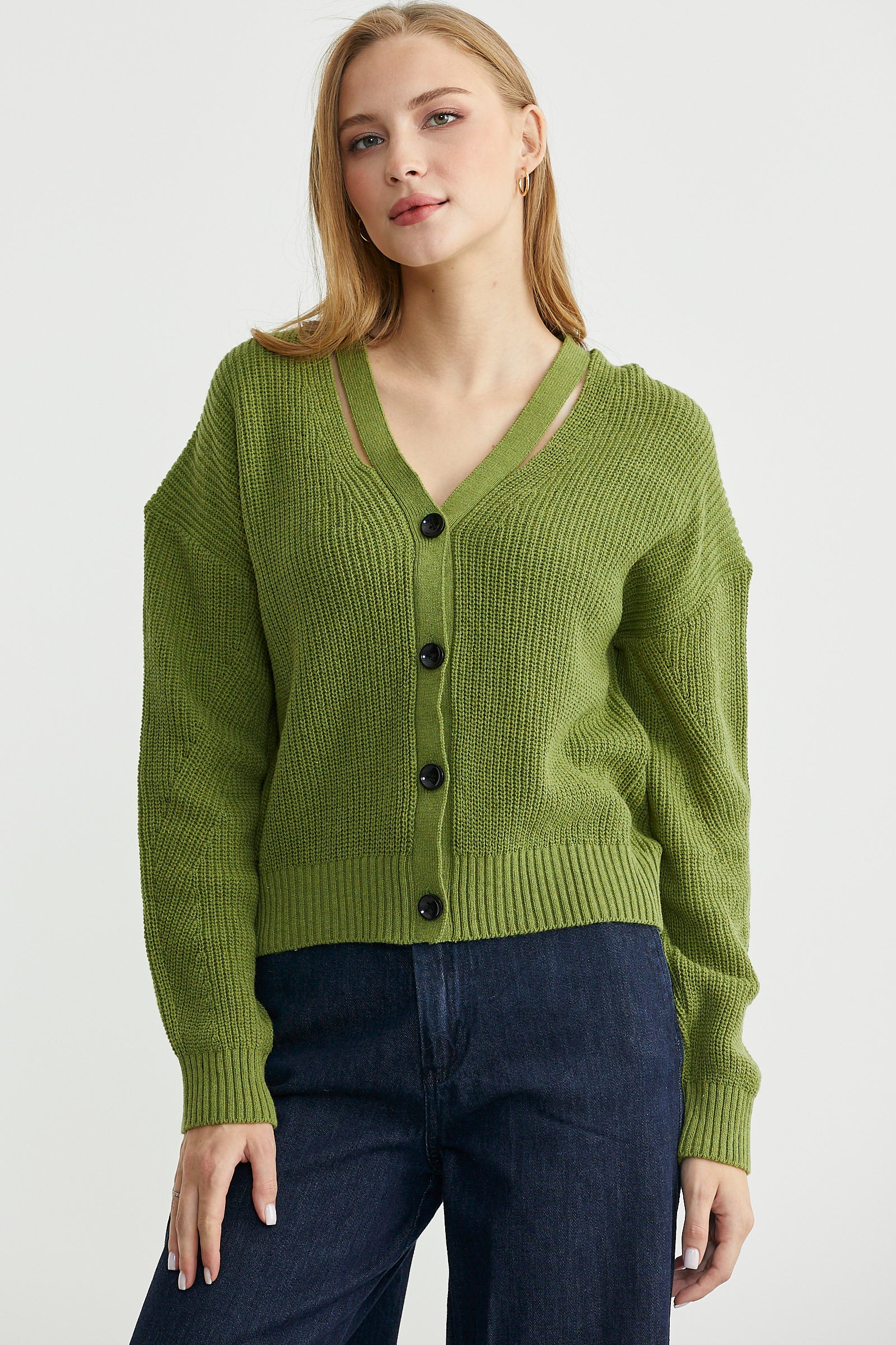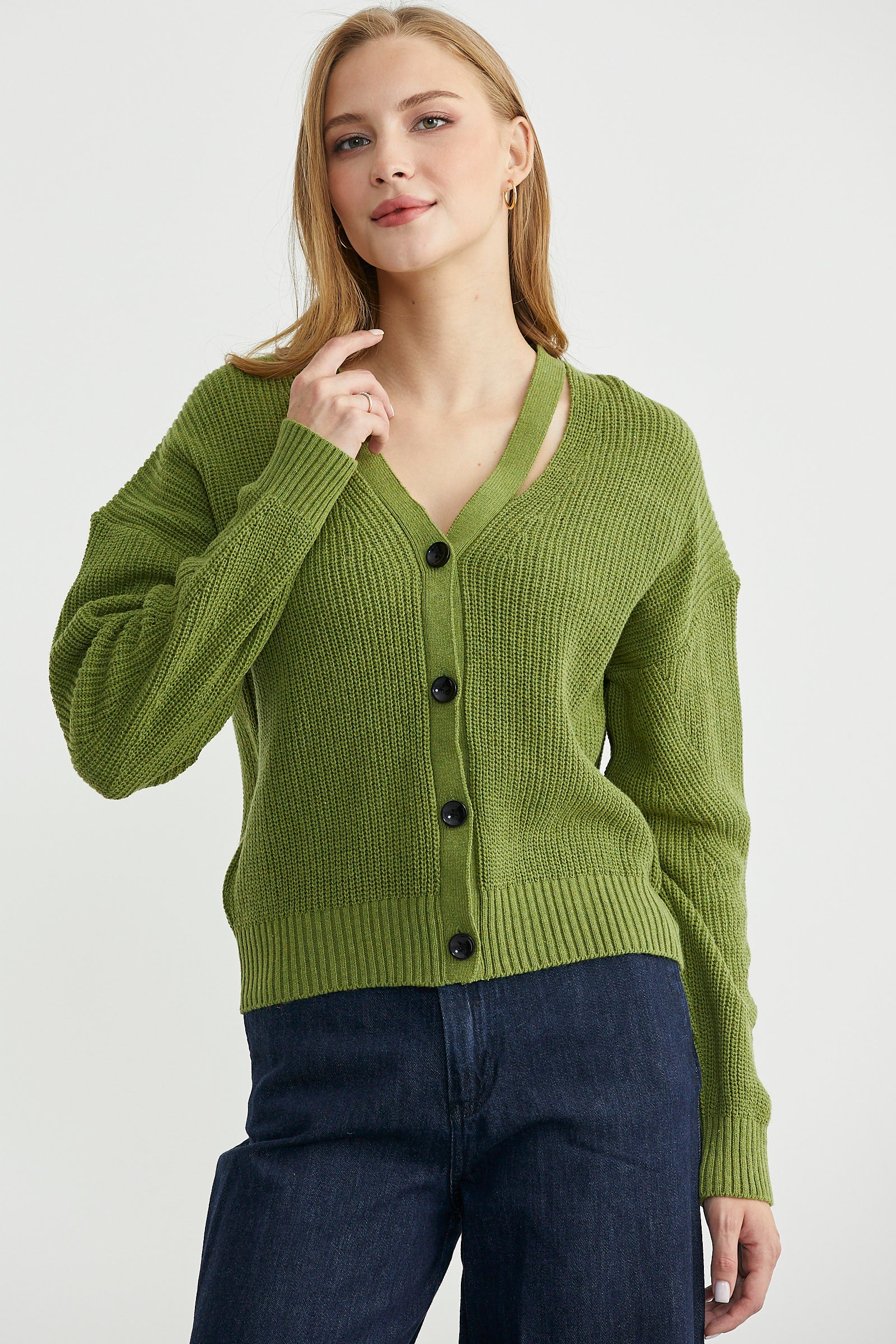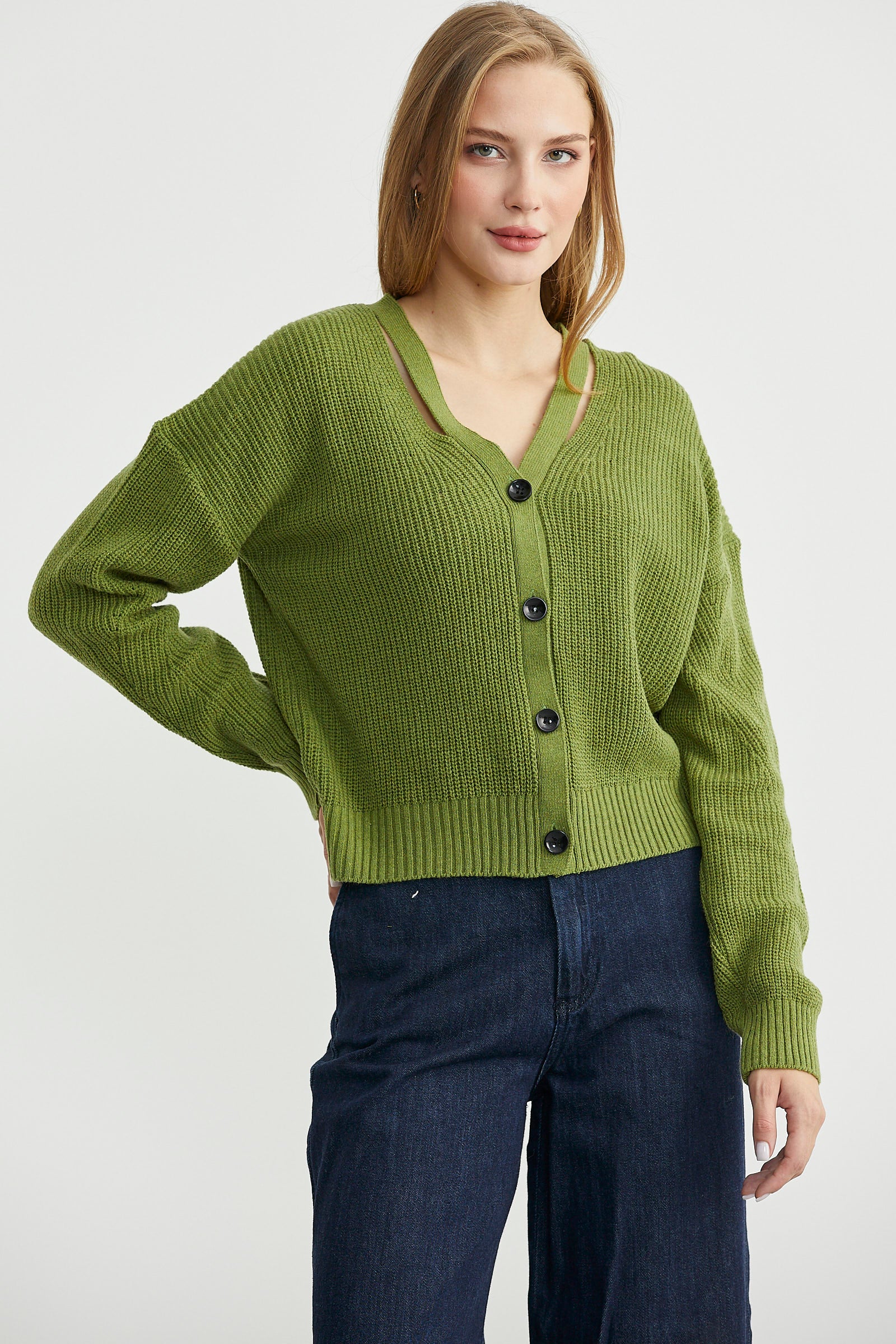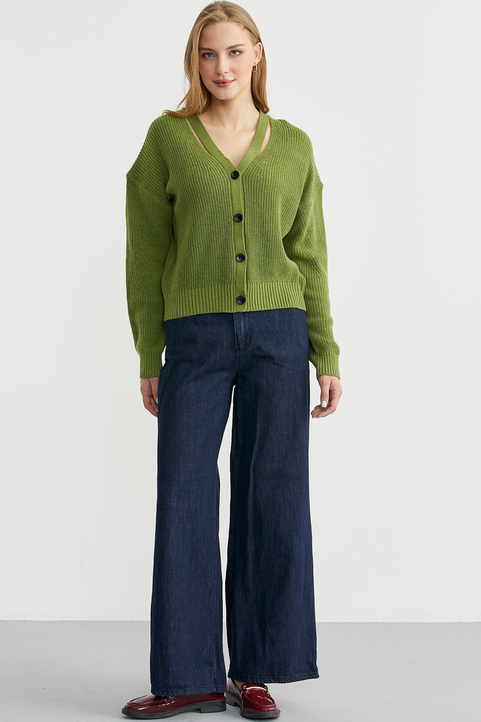 Yaka Detaylı Düğmeli Triko Hırka - Yeşil