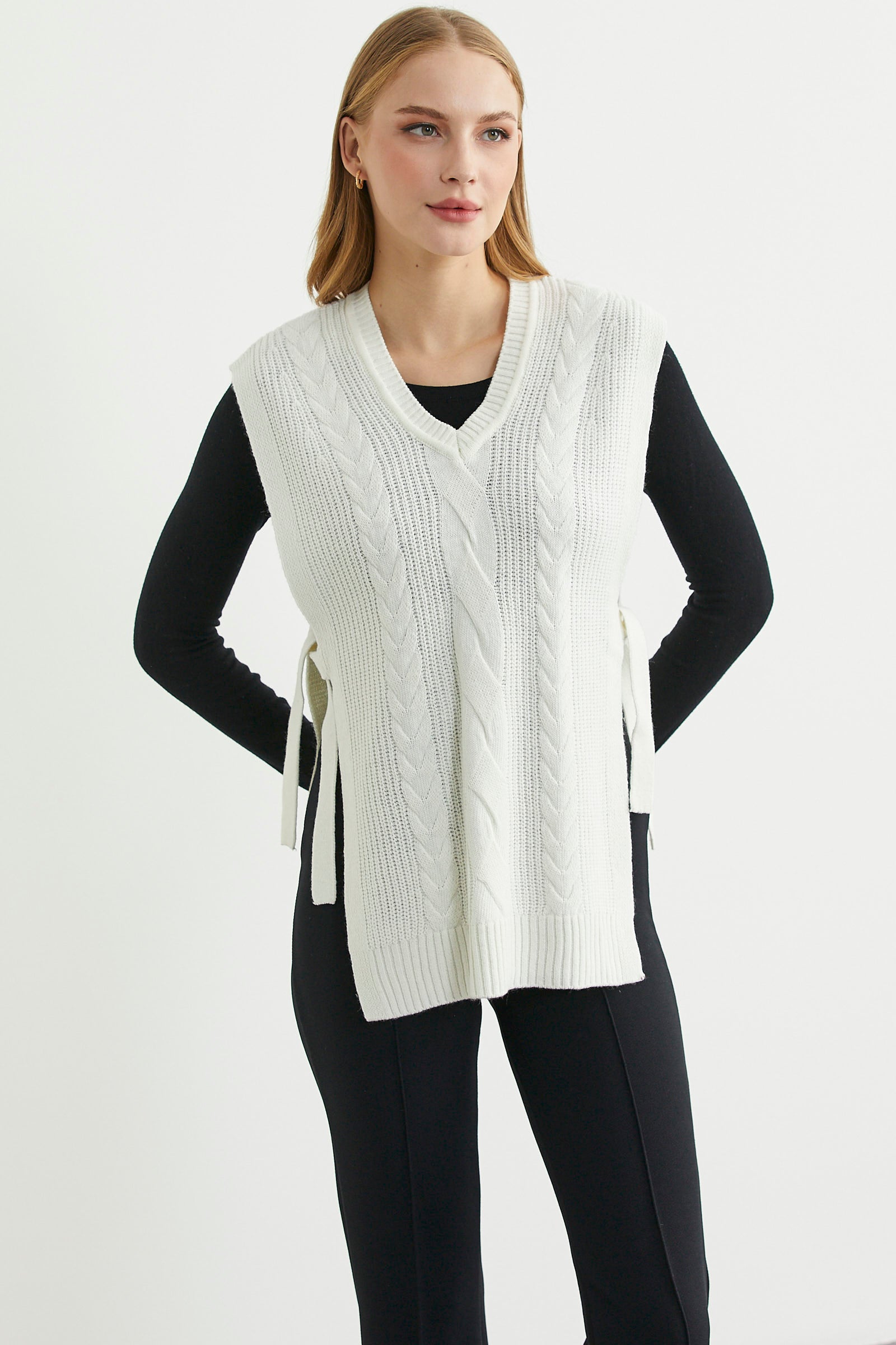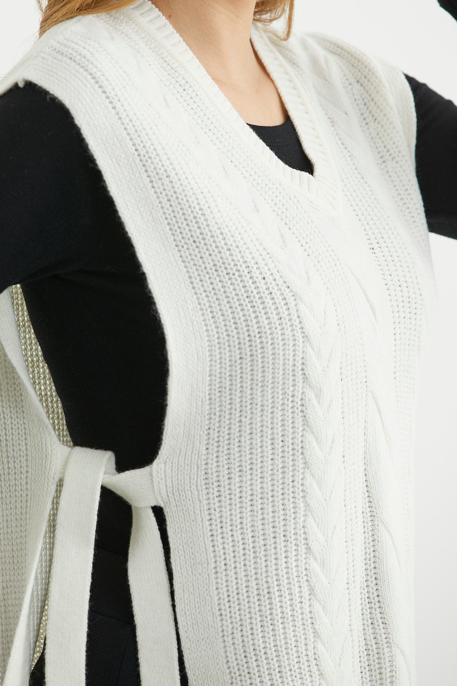 Yanları Bağlama Detaylı Yünlü Triko Süveter - Kemik
