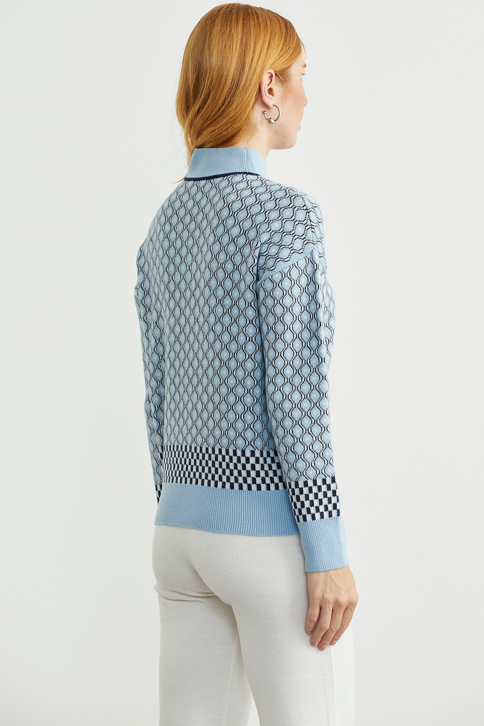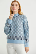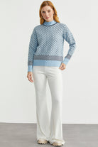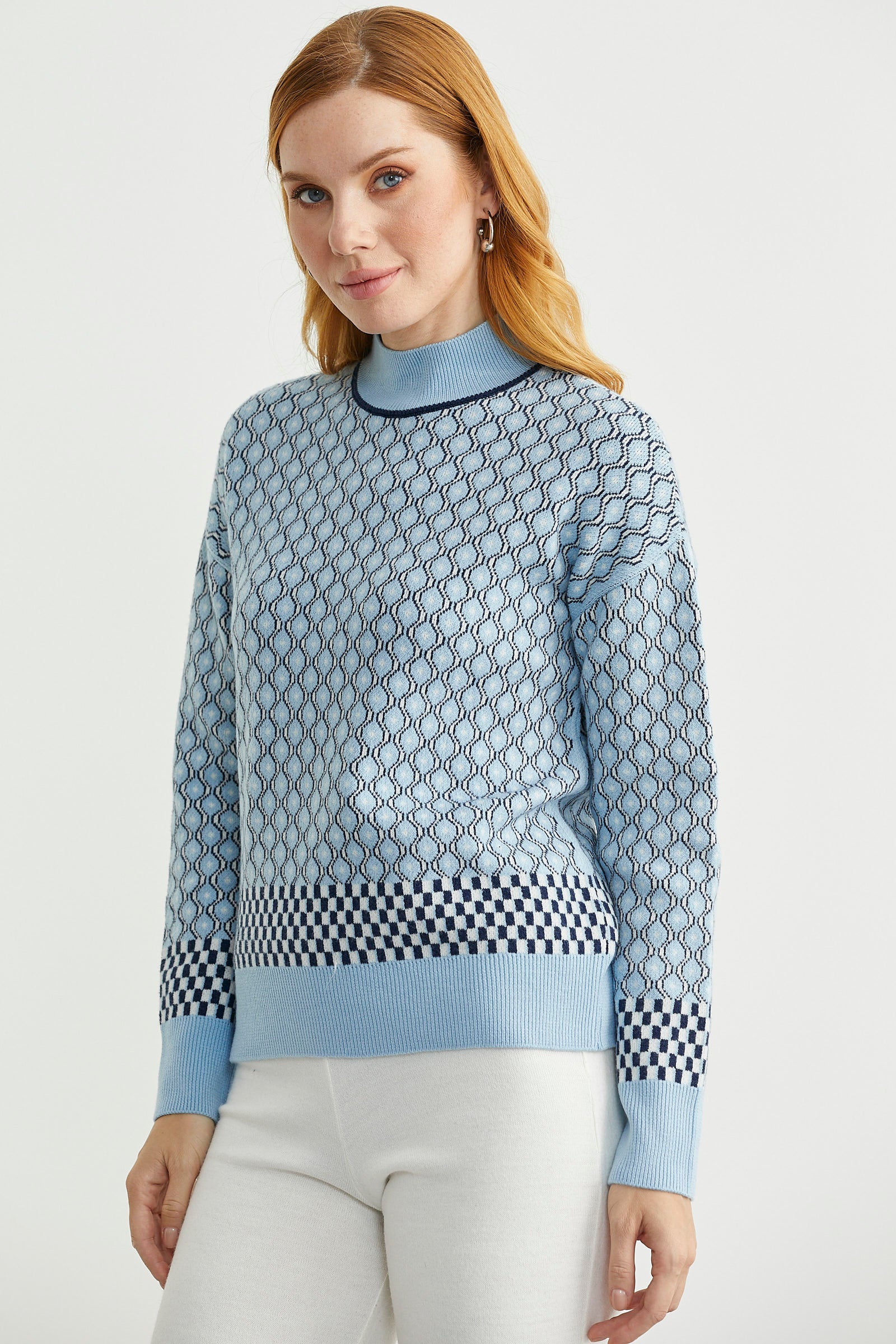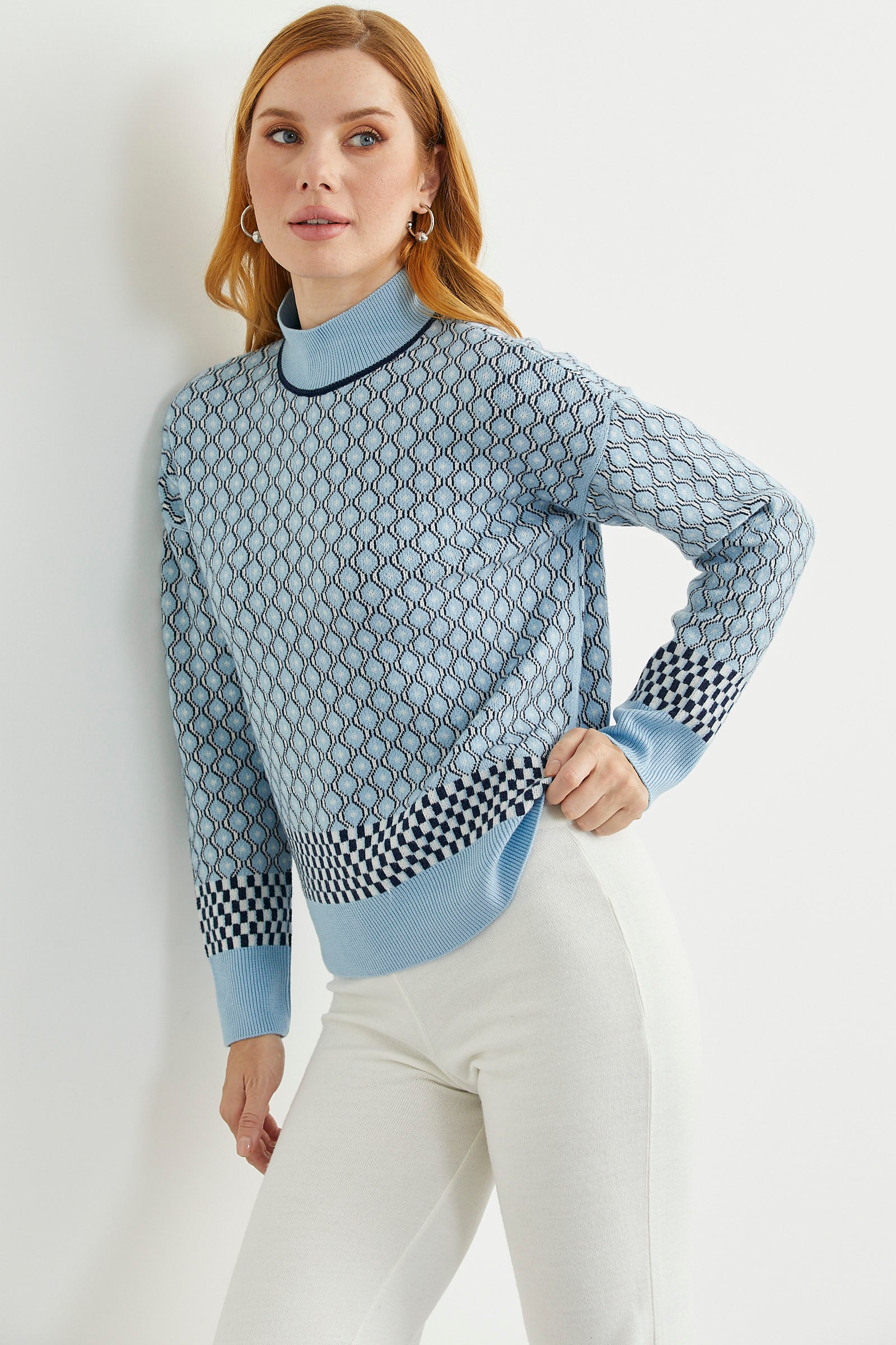 Yarım Balıkçı Renk Motifli Triko Kazak - Mavi