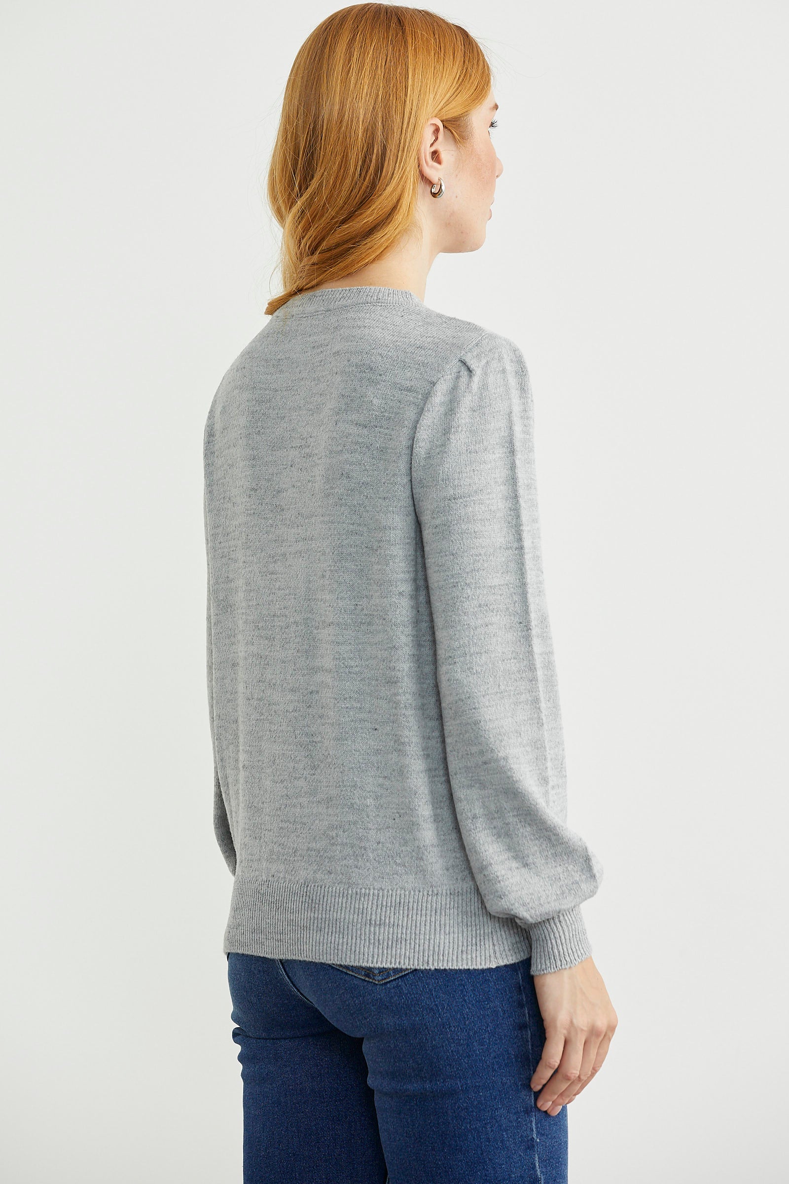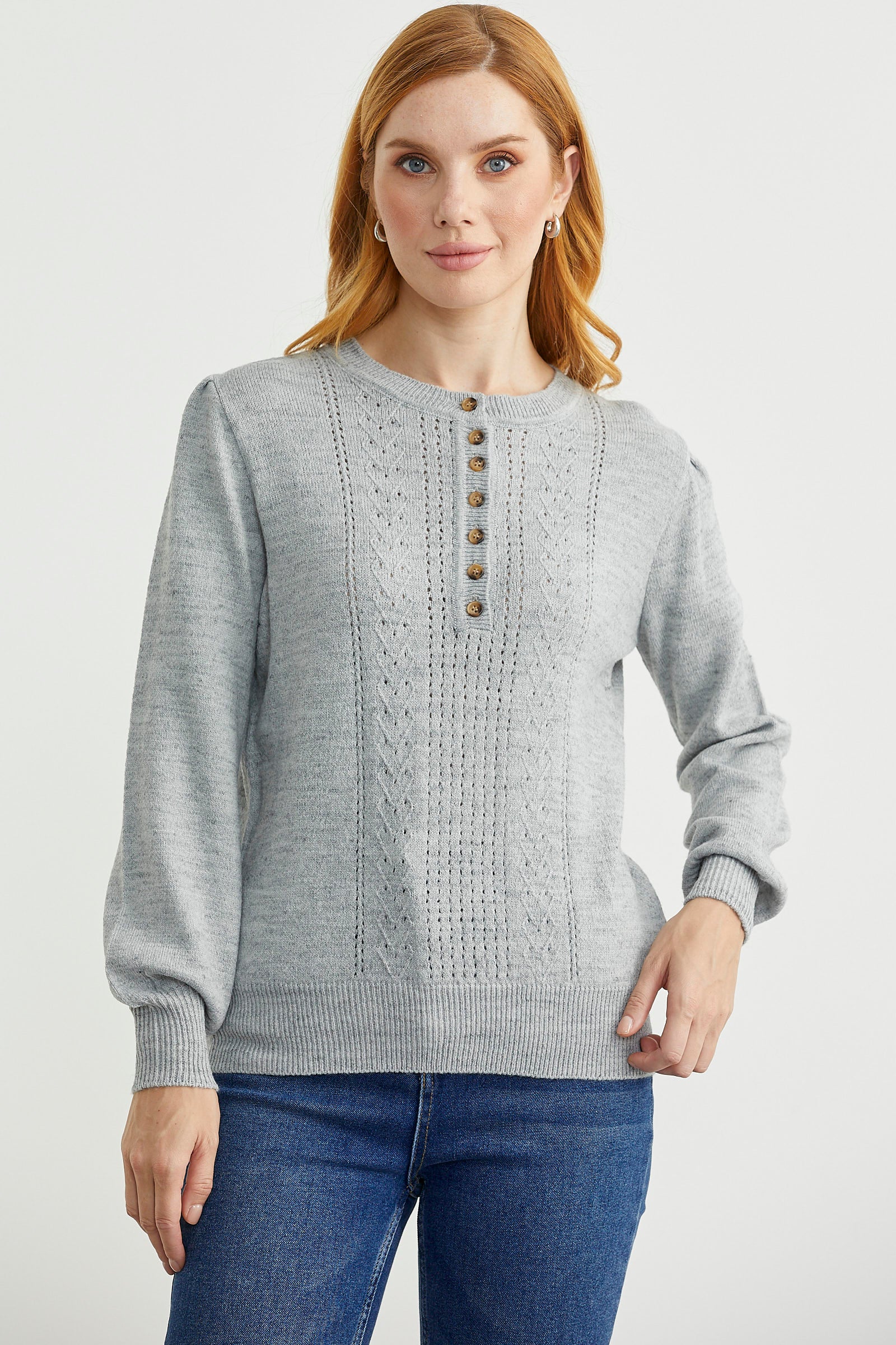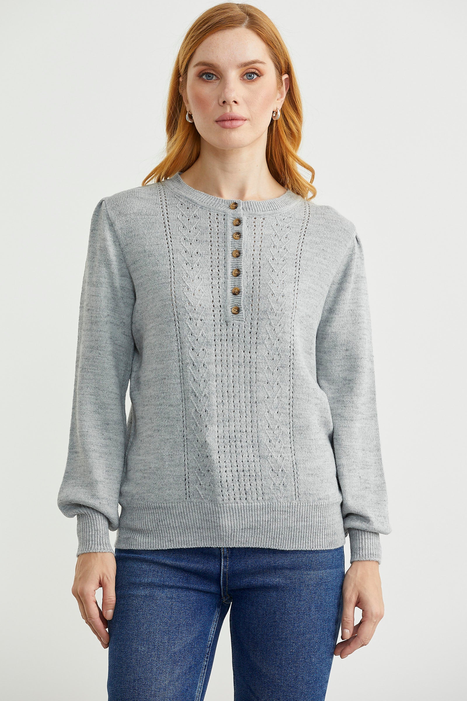 Yarım Düğmeli Yuvarlak Yaka Triko Kazak - Açık Gri