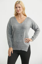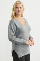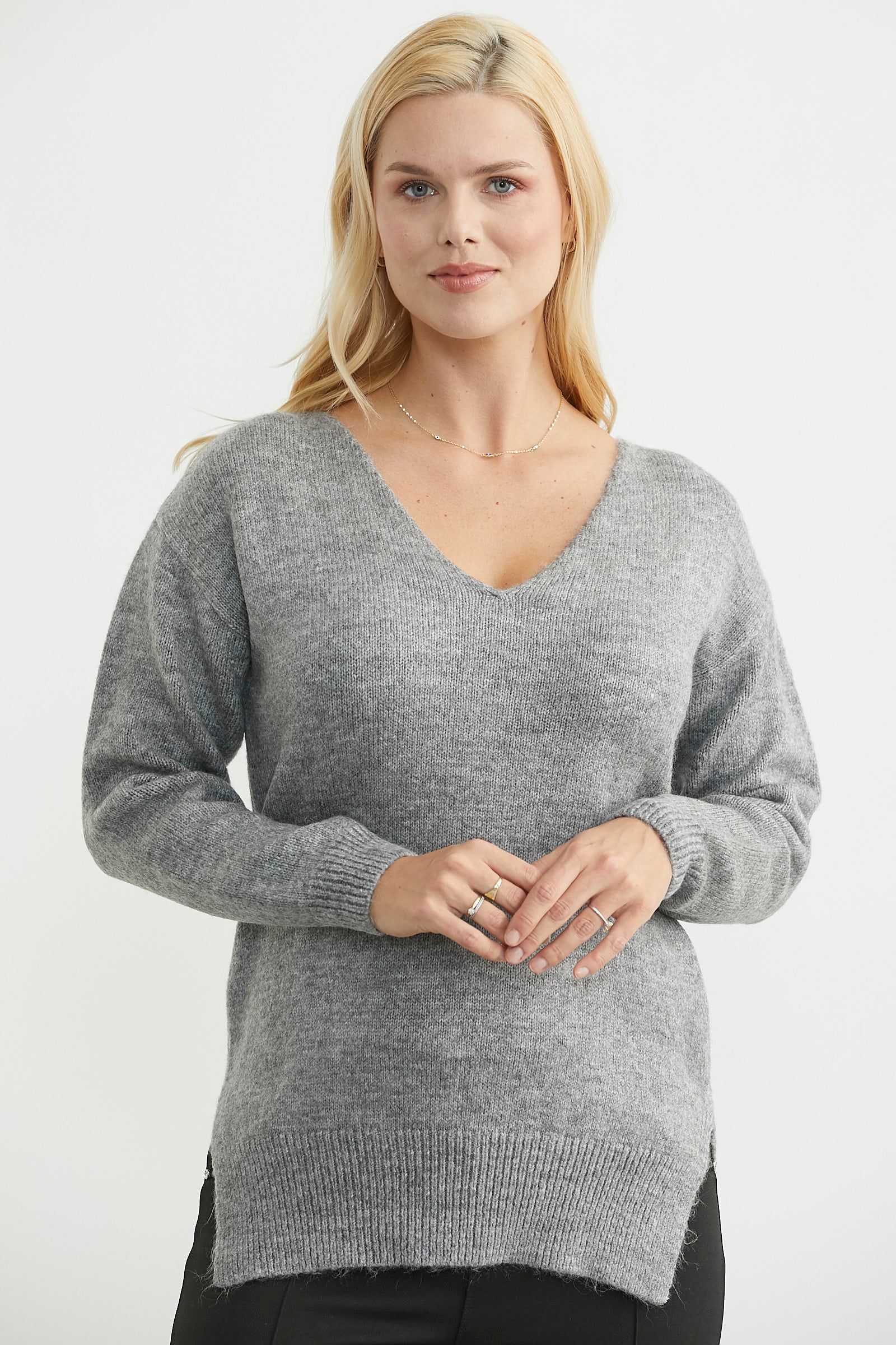 V yaka, yumuşak dokulu, etek ucu yırtmaçlı, uzun boy, basic triko kazak.