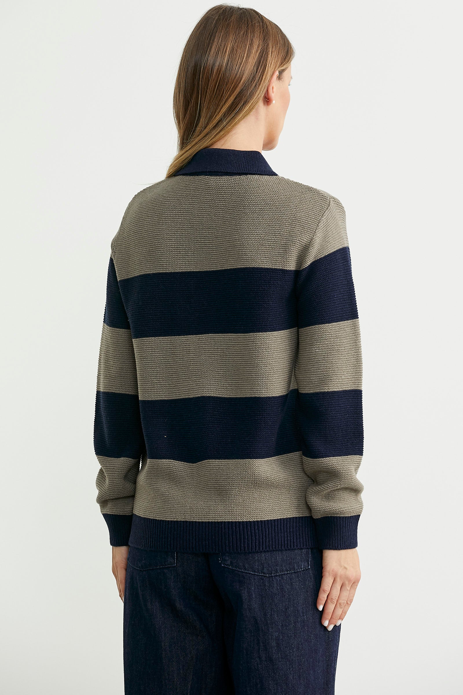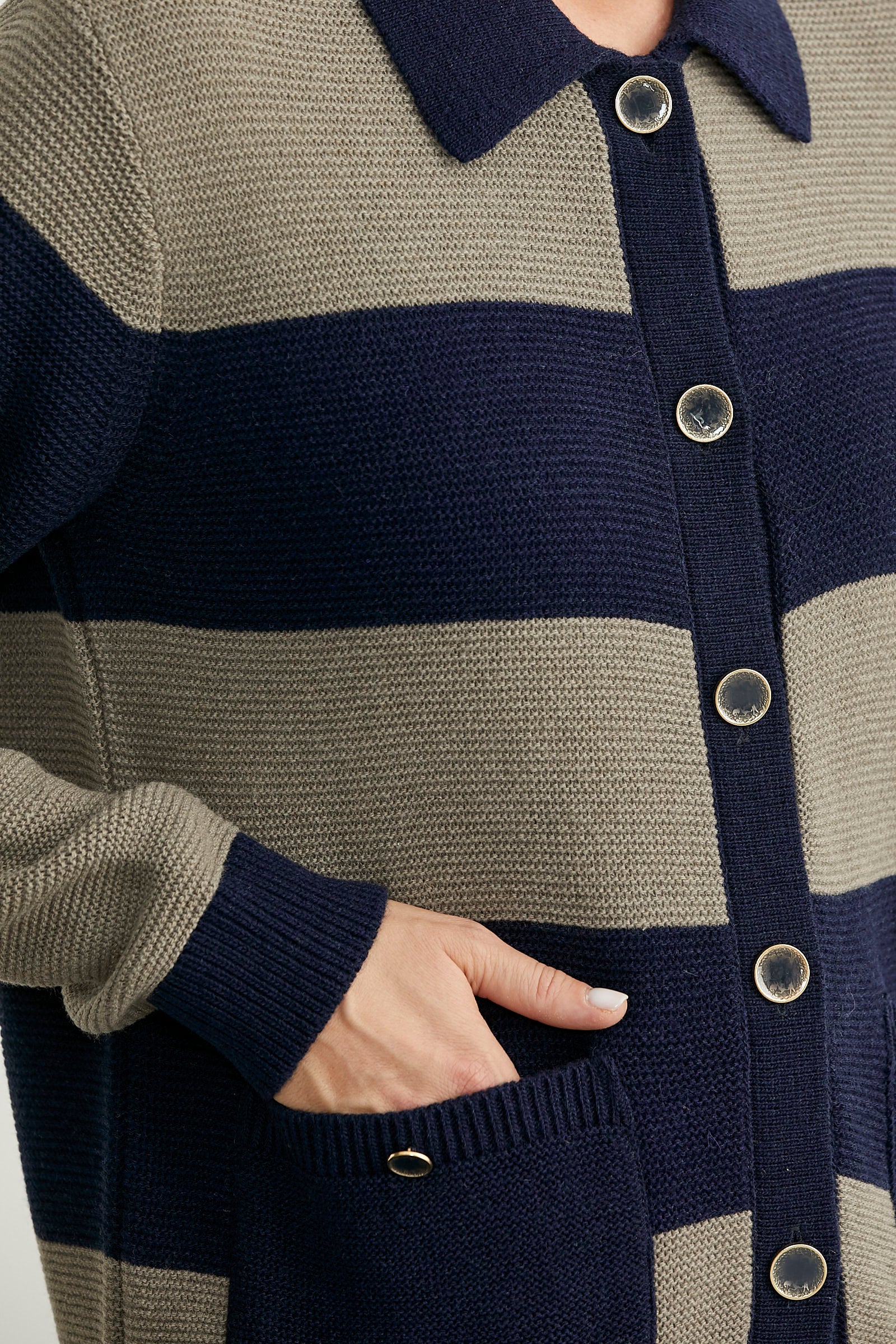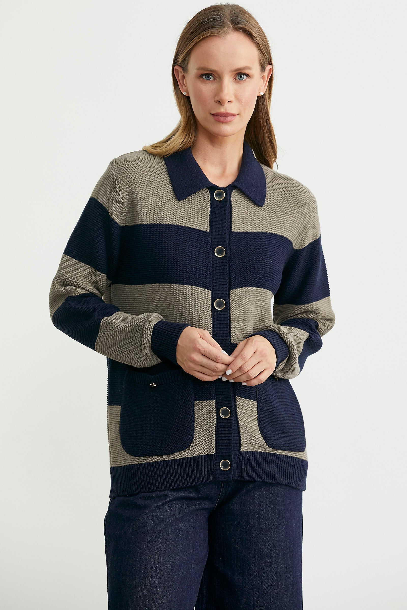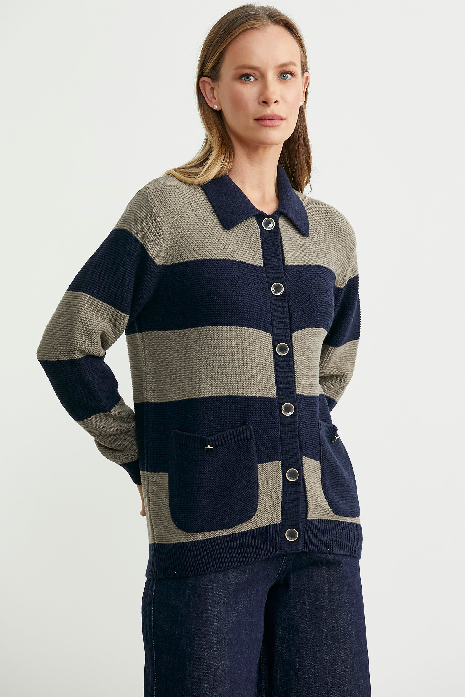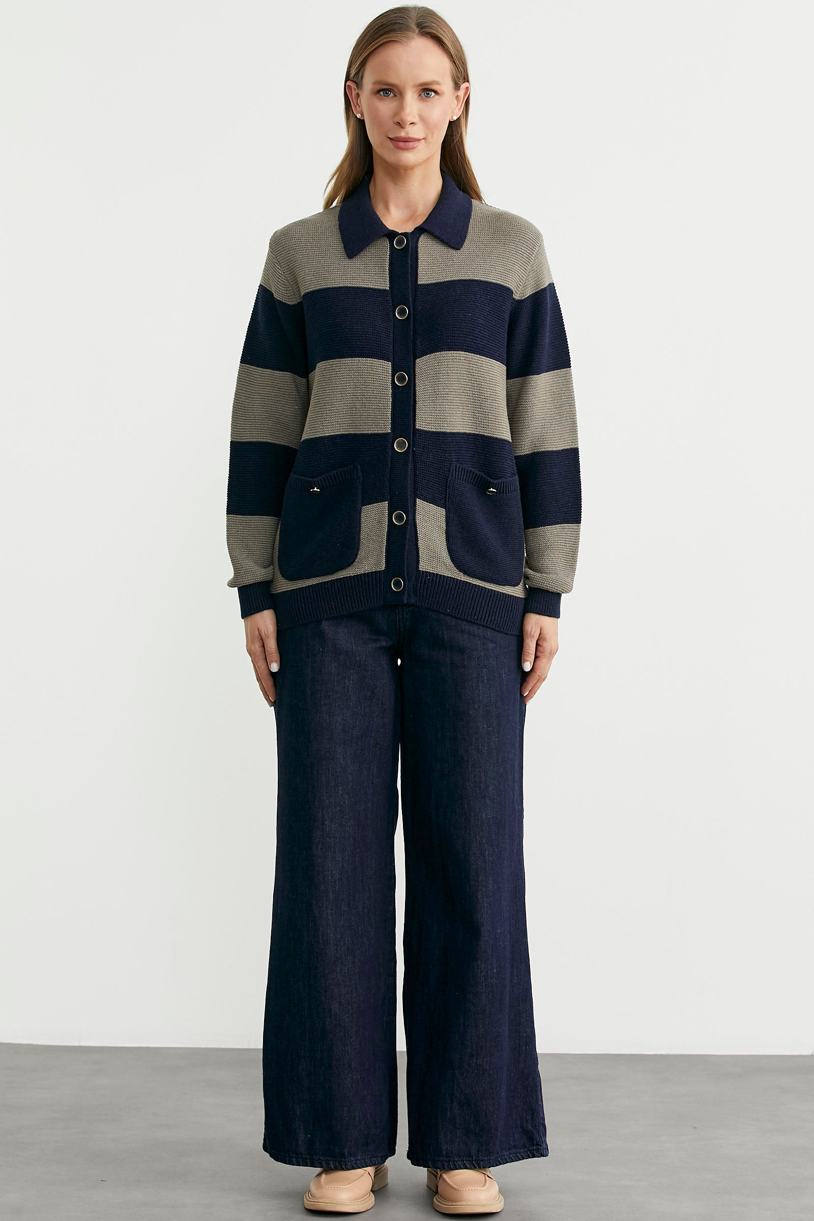 Yünlü Renk Çizgili Cepli Triko Hırka - Lacivert