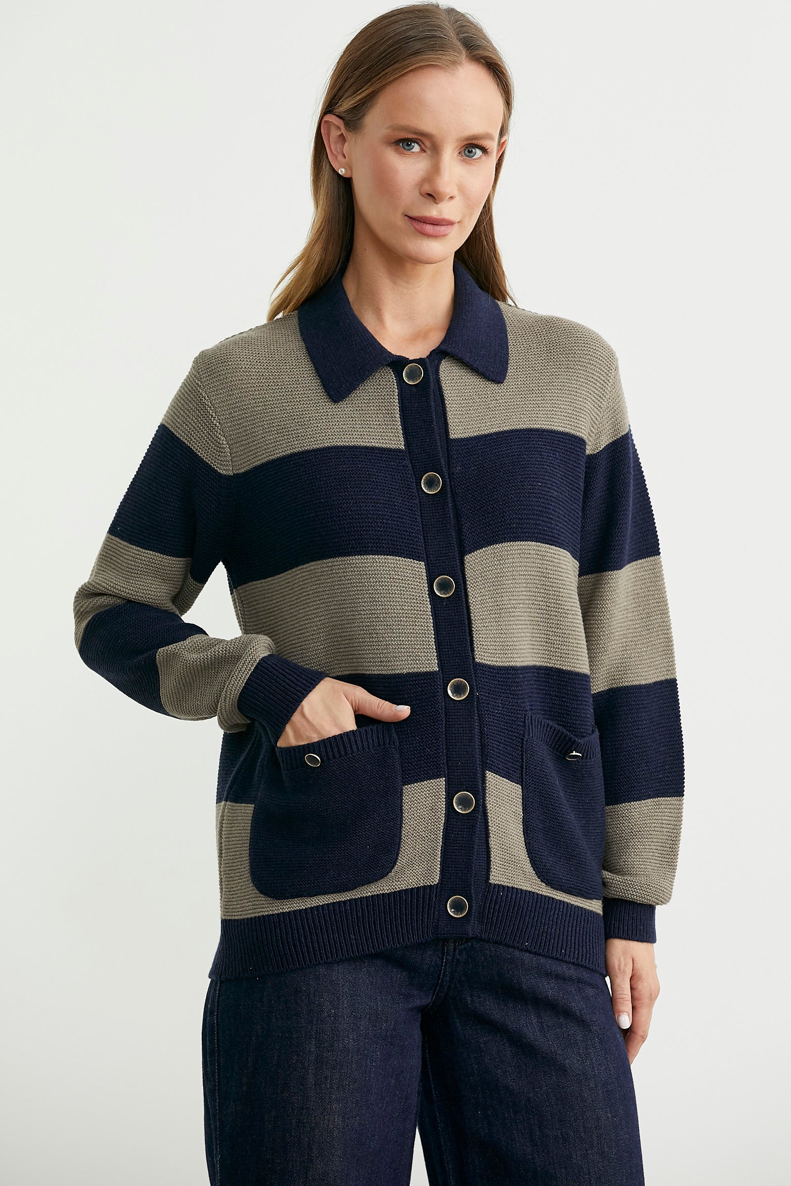 Yakası lastik örgülü, önü düğmeli, rahat kalıp triko hırka. Çizgili ve desenlidir.