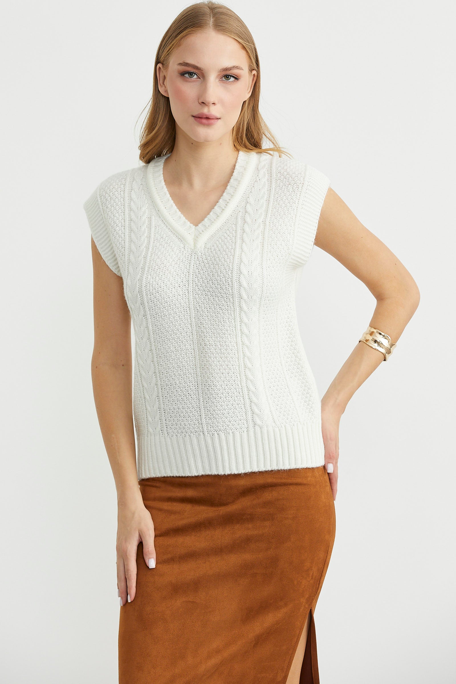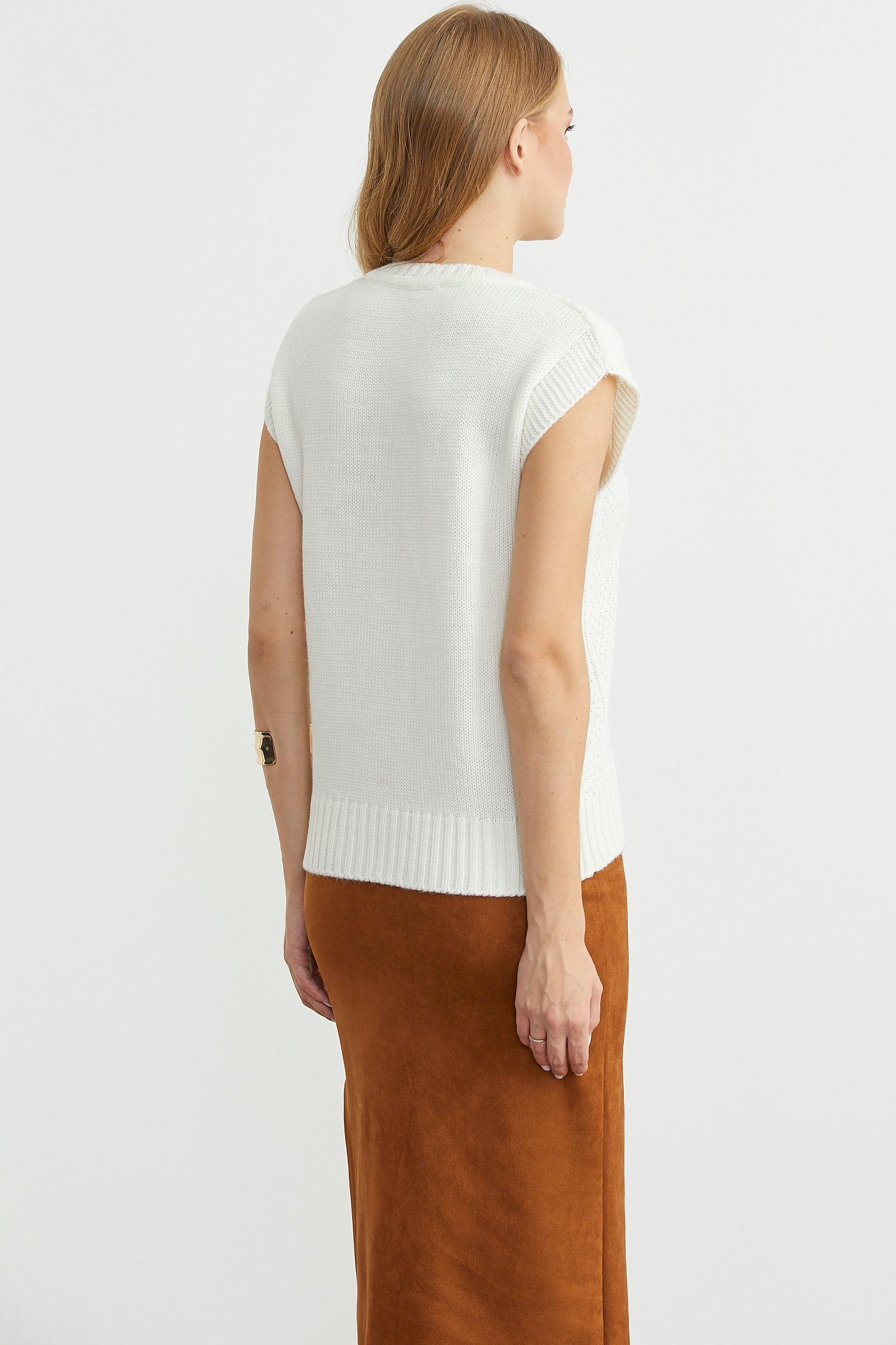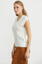 Yünlü V Yaka Triko Süveter - Kemik