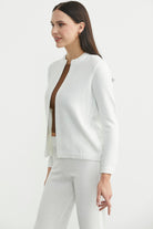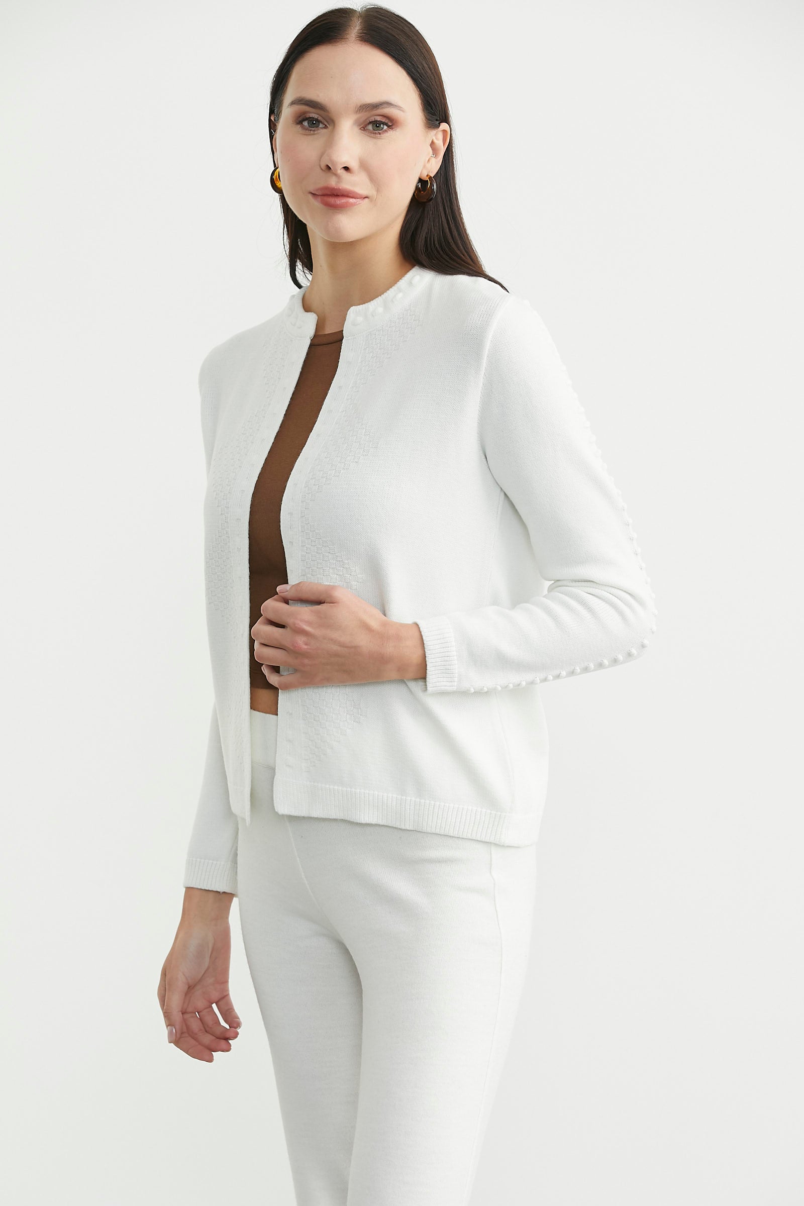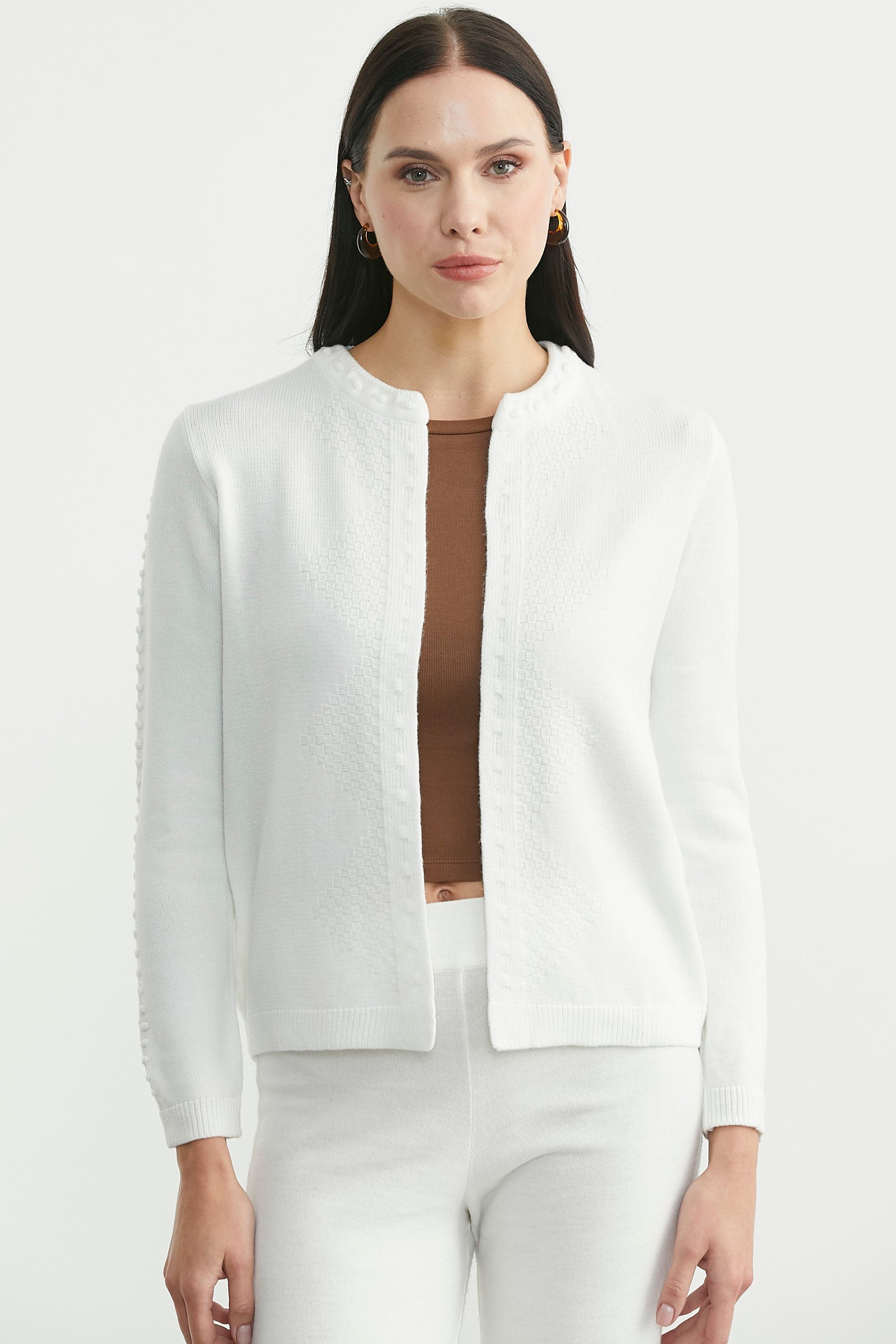 Yuvarlak Yaka Motifli Triko Hırka - Kemik