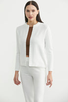 İnce, yuvarlak yakalı triko hırka. Biye ile kolları bütünleyen desenlere ön bedendeki motifler eşlik ediyor.