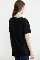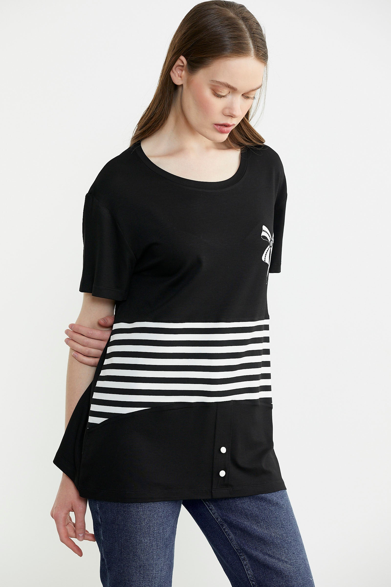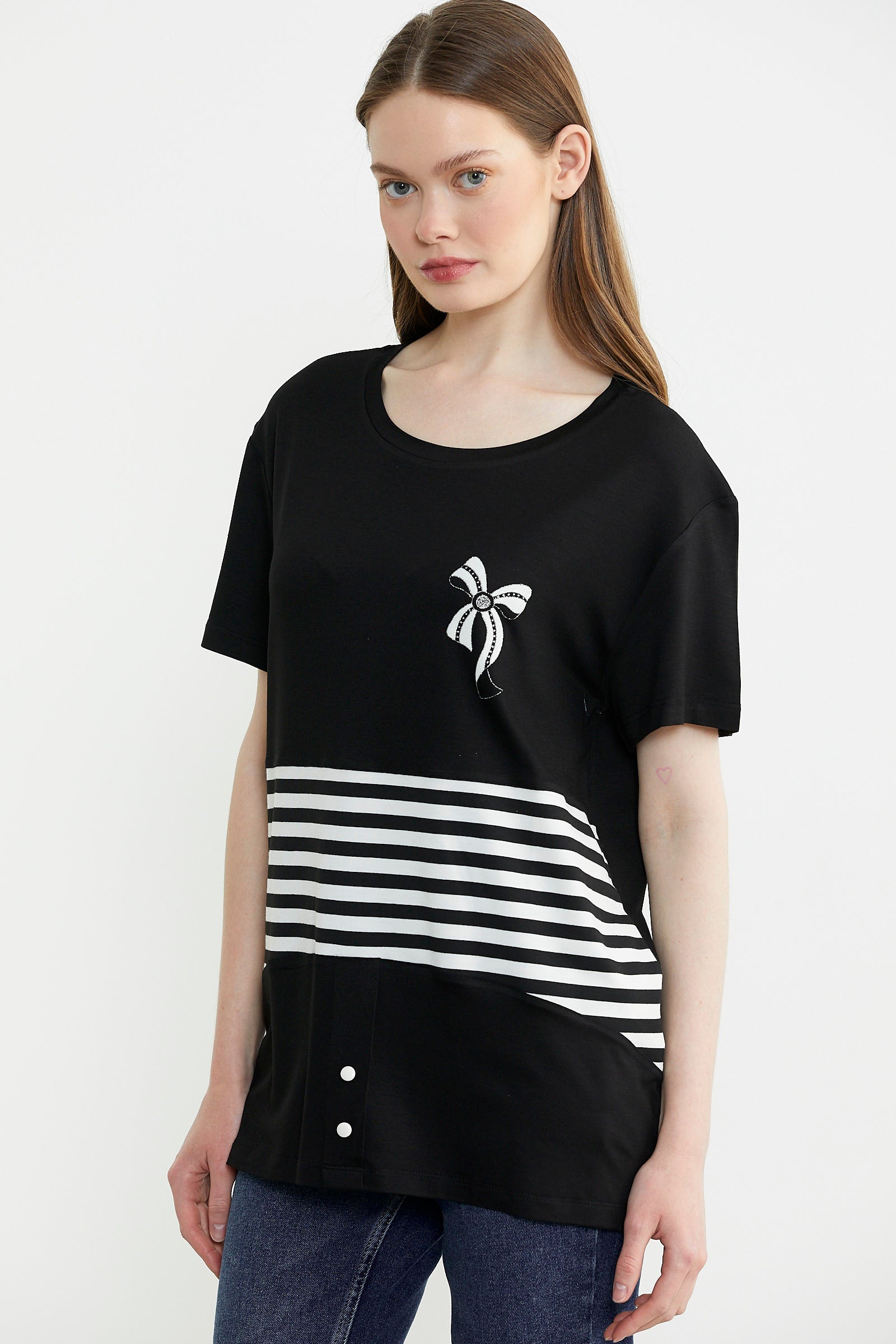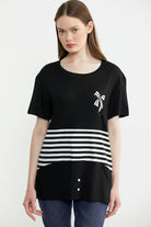 Baskılı Çizgi Detaylı Tişört - Siyah