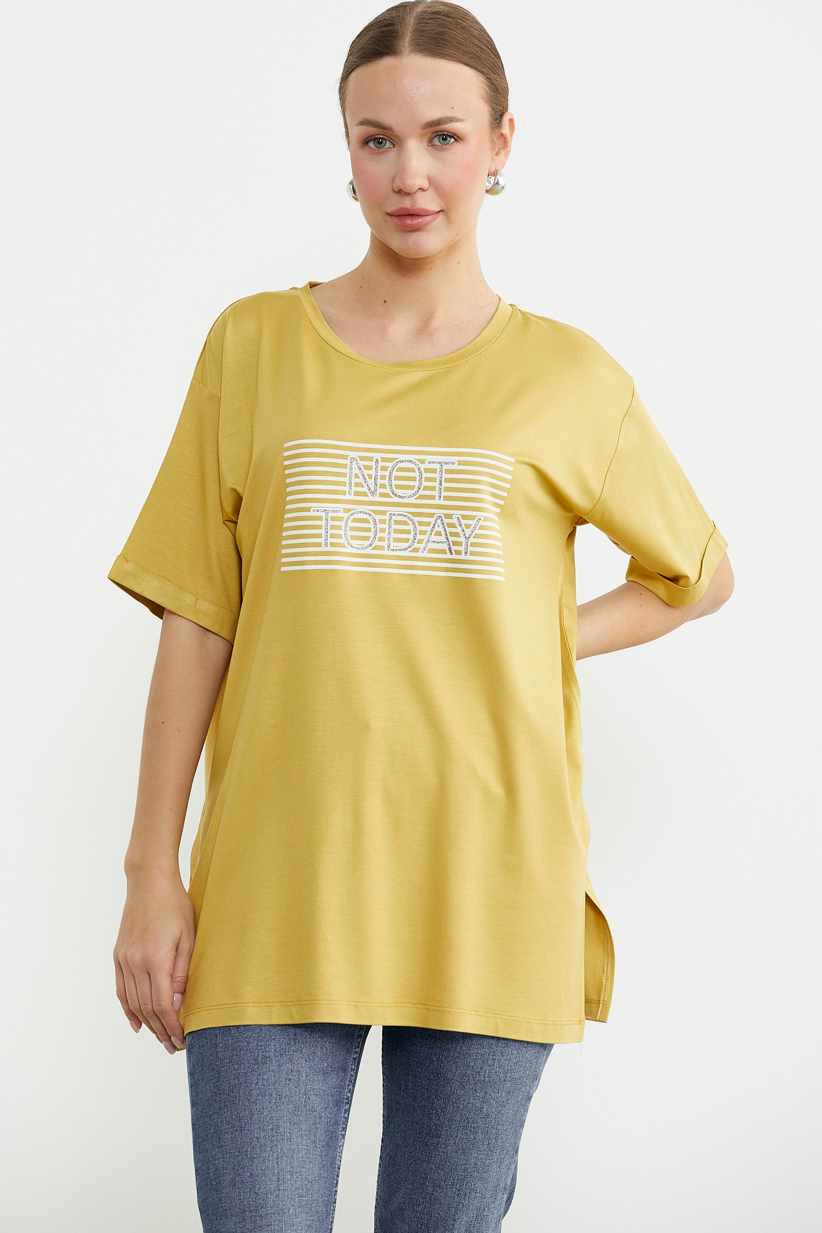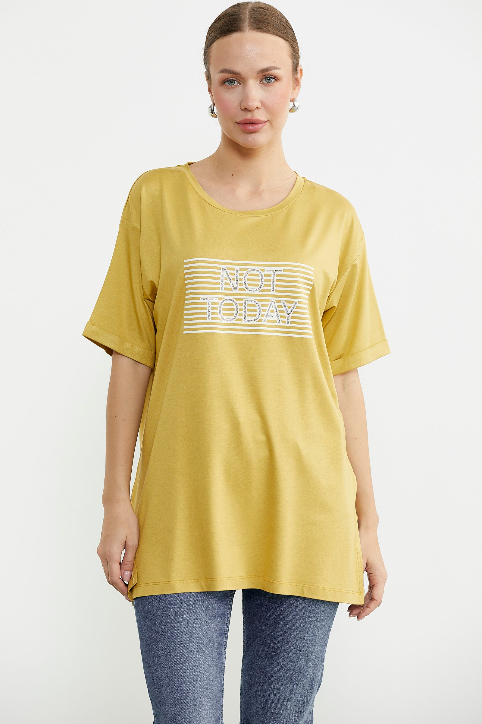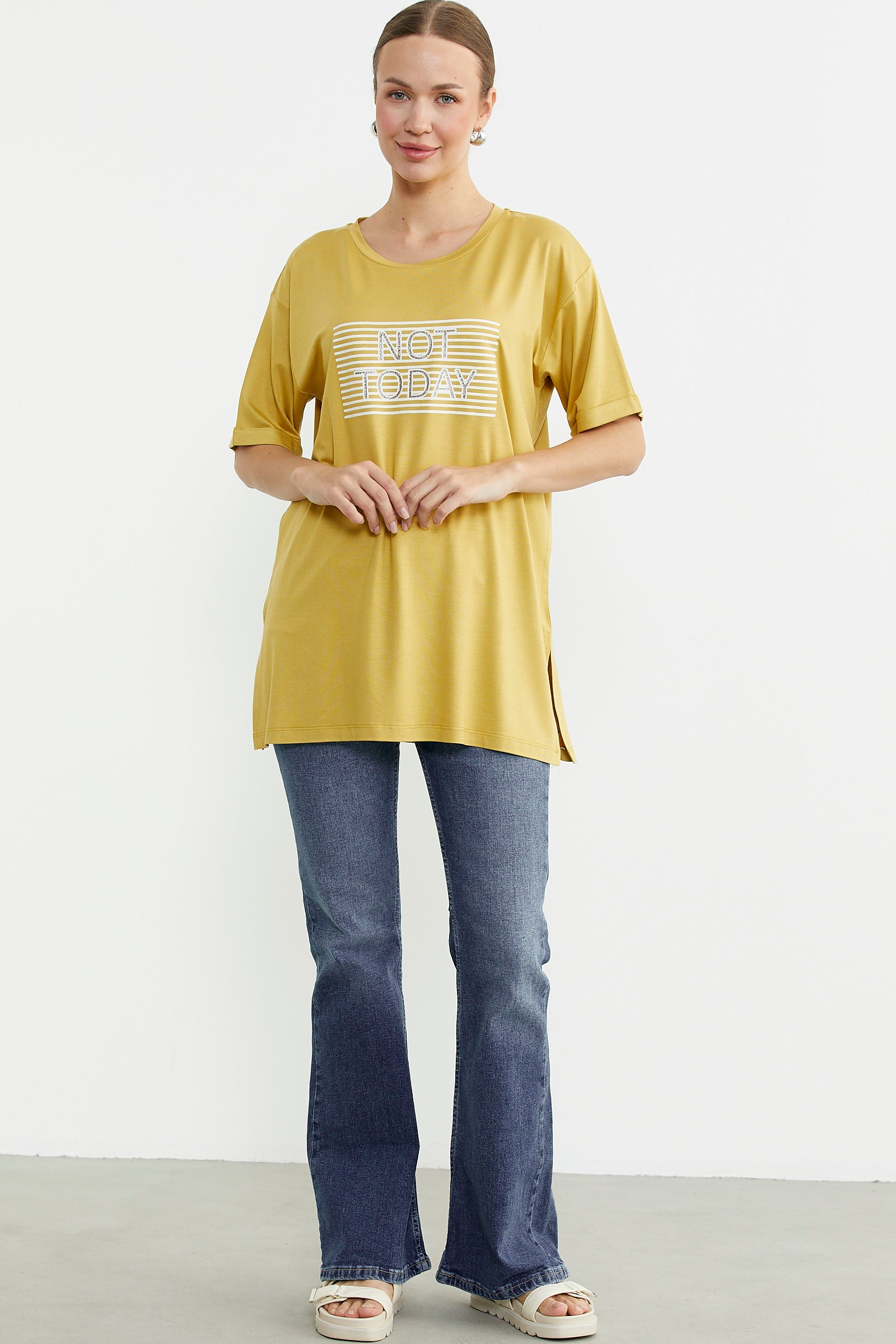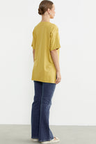 Baskılı Sıfır Yaka Uzun Tişört - Hardal