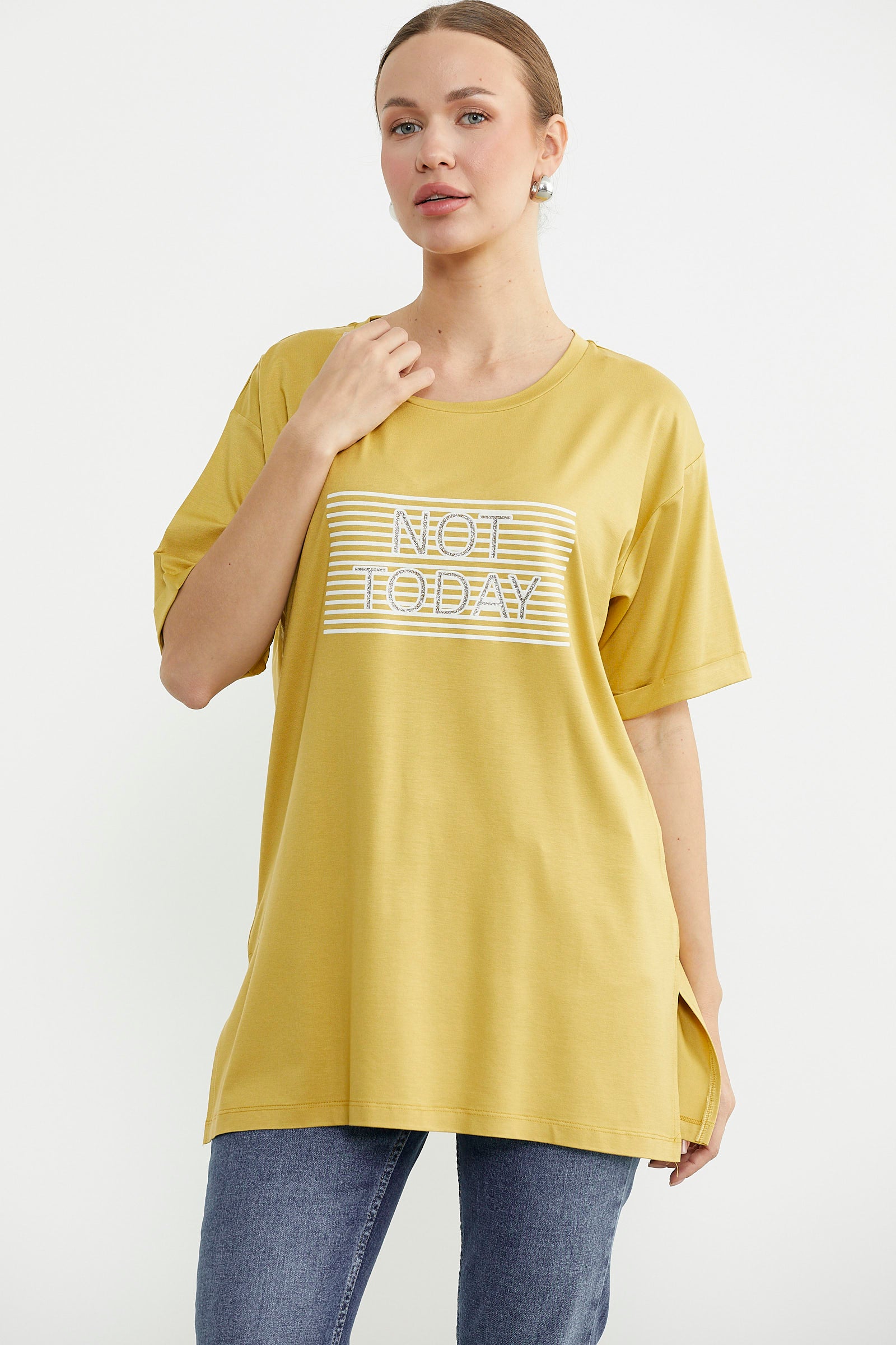 Göğüs hizasında konumlanan baskı detaylı tişört, tunik boydur. Etek ucundaki yırtmacıyla rahat bir kullanım sunar.