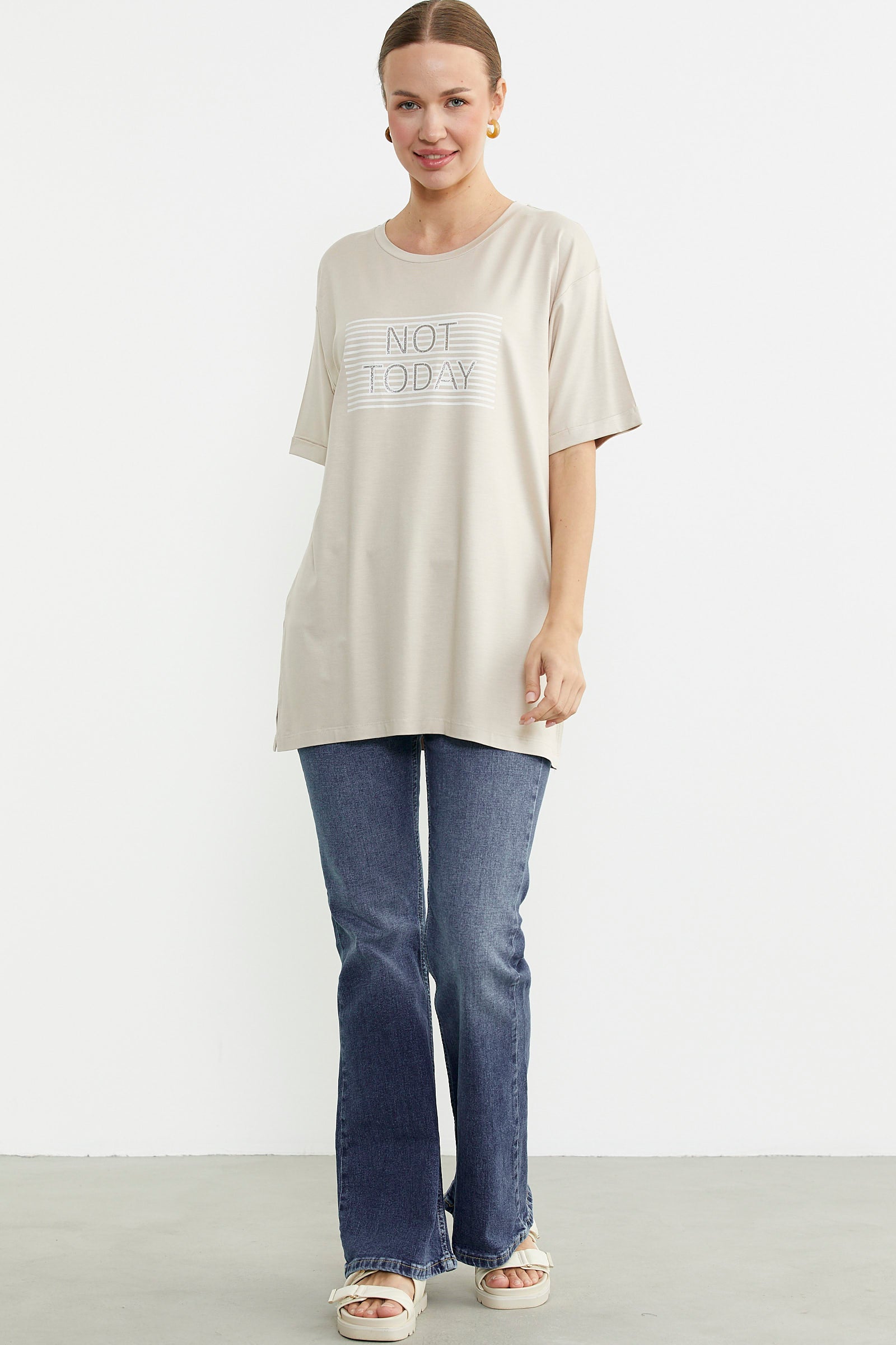 Baskılı Sıfır Yaka Uzun Tişört - Taş